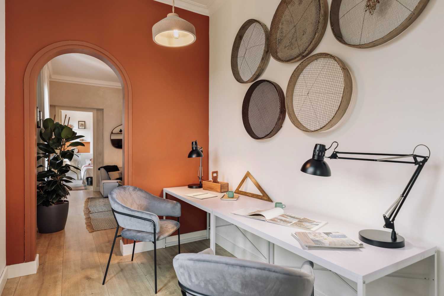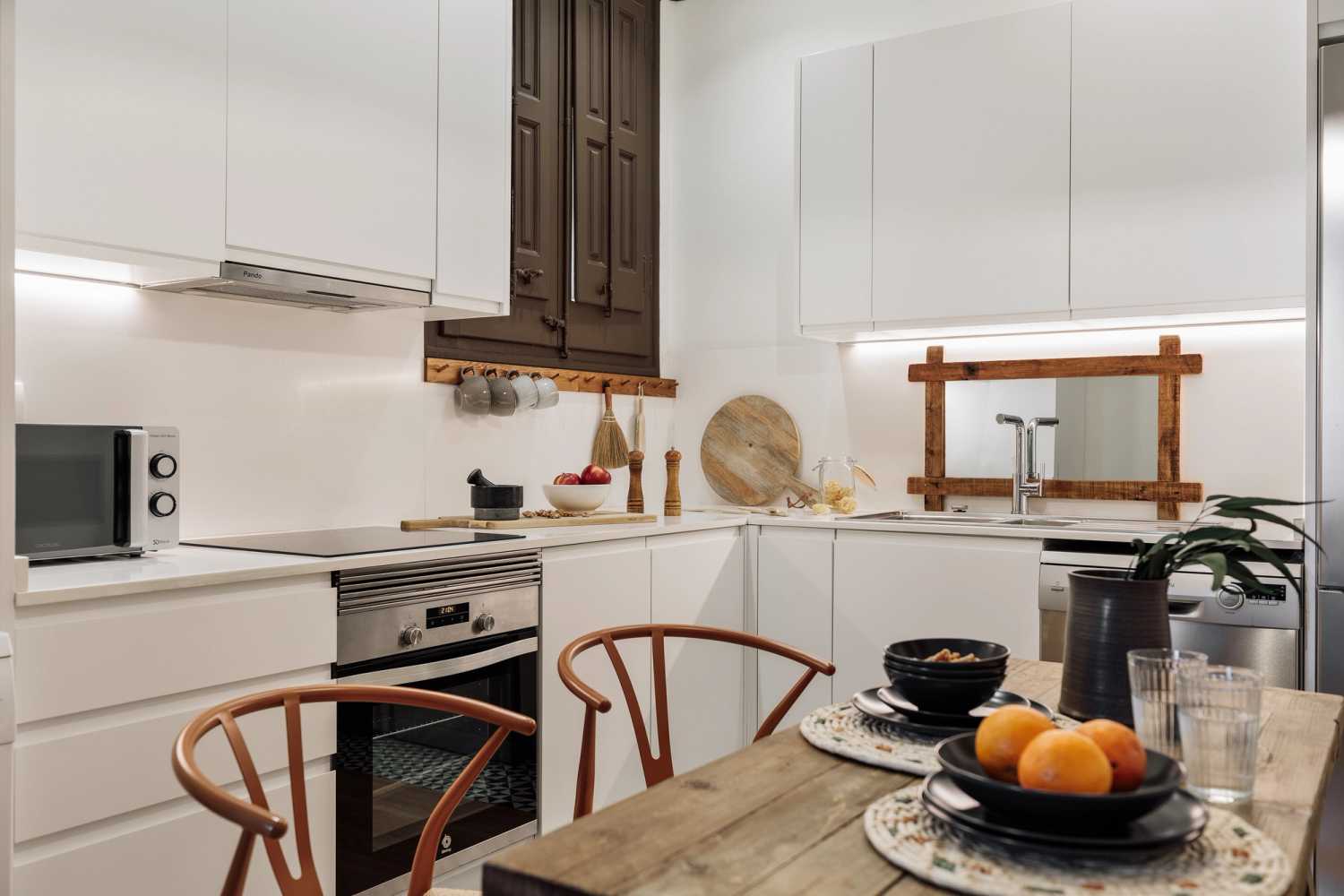 De vuelta a la entrada, el amplio pasillo cuenta con un escritorio construido a medida por un artesano local y con madera reciclada. El salón se beneficia de la luz natural entrante a través de sus grandes puertas y, junto a él, hace aparición la amplia cocina, que dispone de mesa de comedor adyacente a la zona de estar y está totalmente equipada con todos los utensilios de cocina y electrodomésticos.