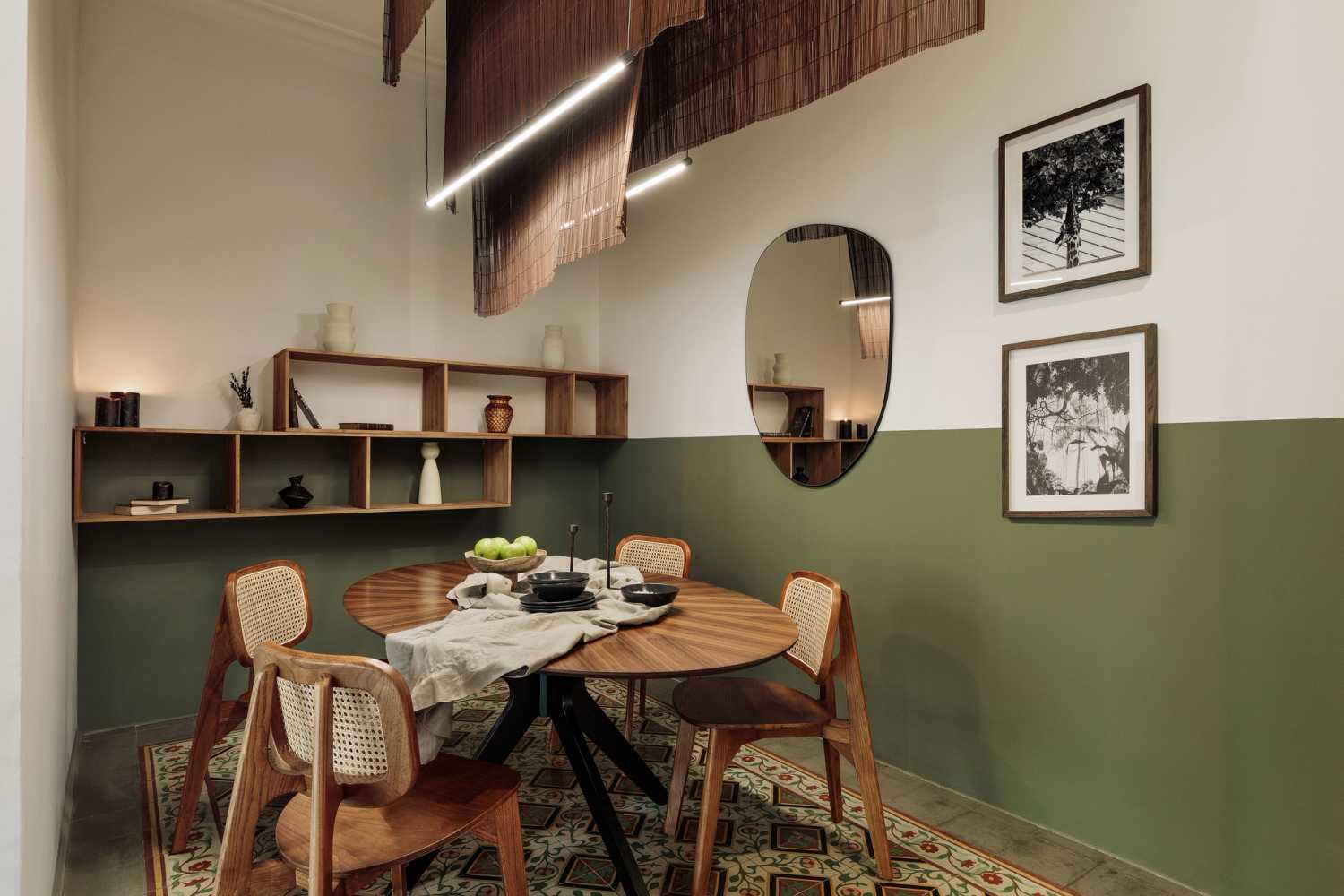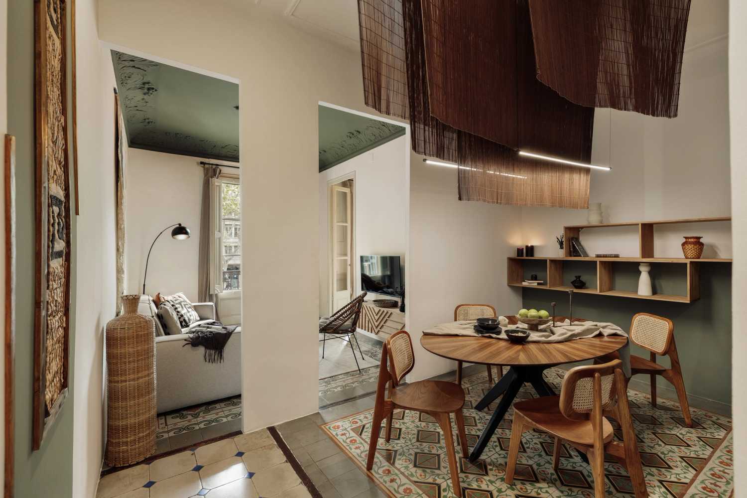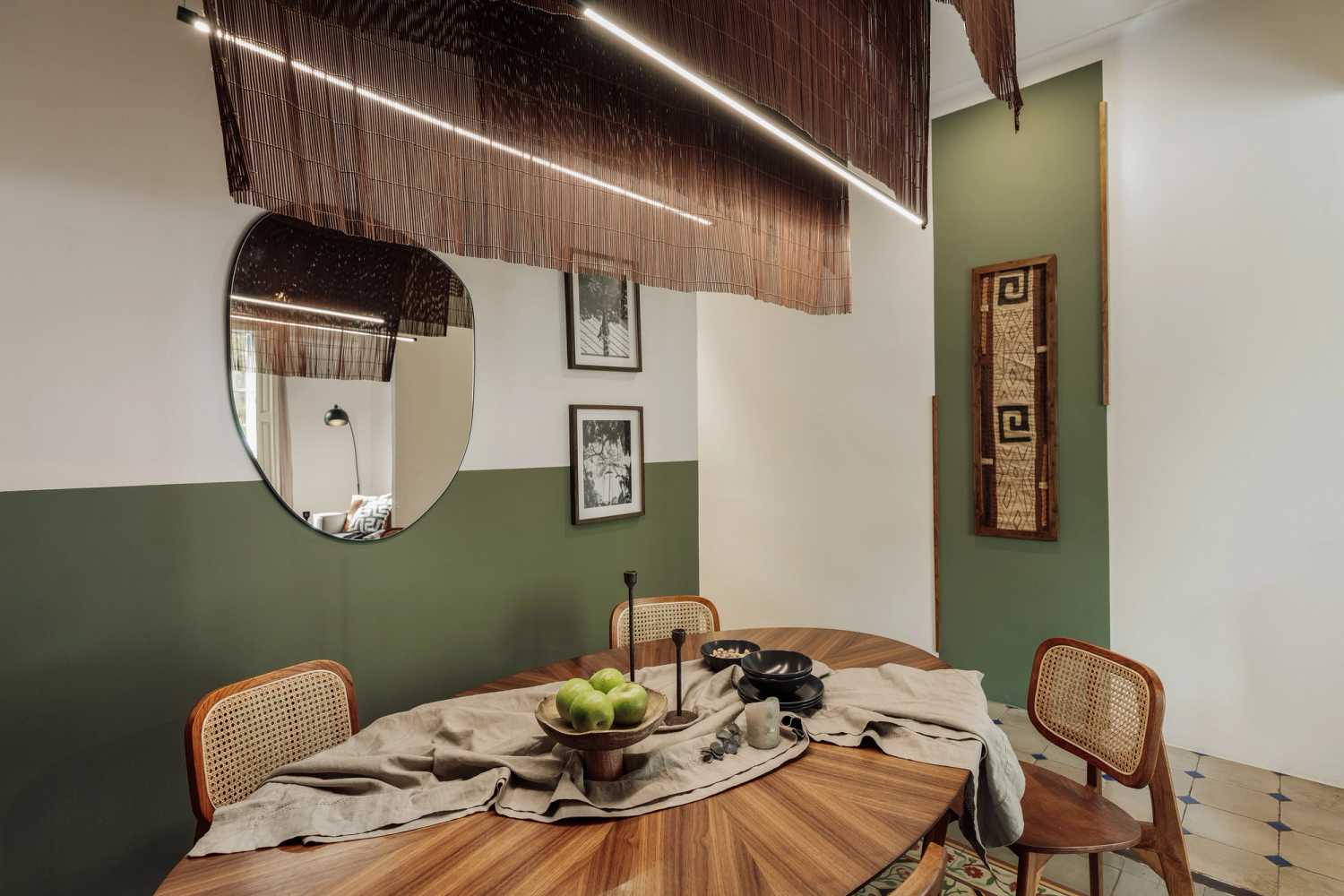 Al final del pasillo de la derecha, el espacio se abre para revelar el salón y el comedor. Una instalación de arte flotante con cuentas que evoca imágenes de las llanuras congoleñas cuelga sobre el juego de comedor para cuatro personas.