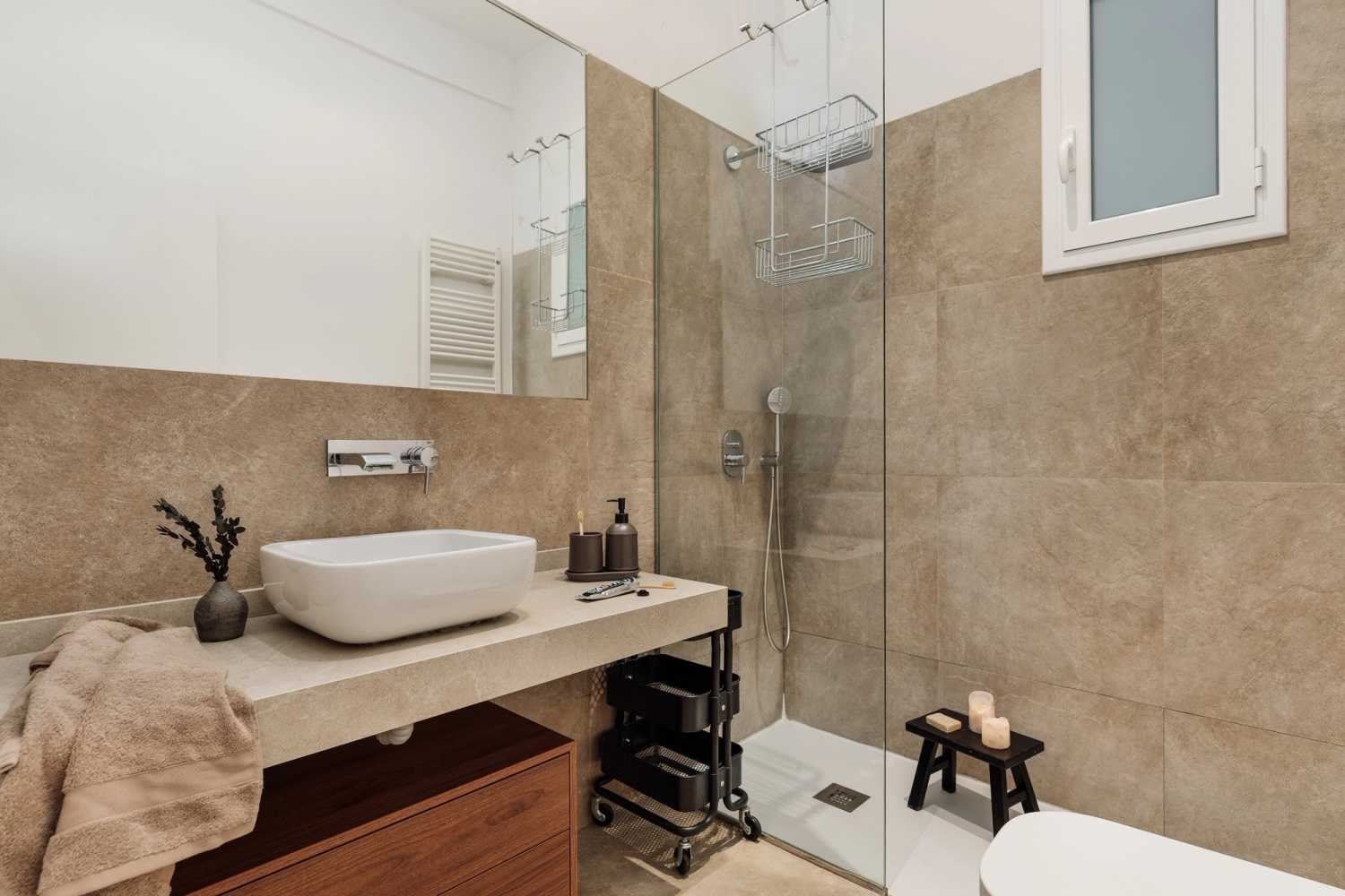 Justo después del primer dormitorio se encuentra el cuarto de baño independiente. Este cuarto de baño, de gran modernidad, cuenta con una ducha de cristal y accesorios contemporáneos.