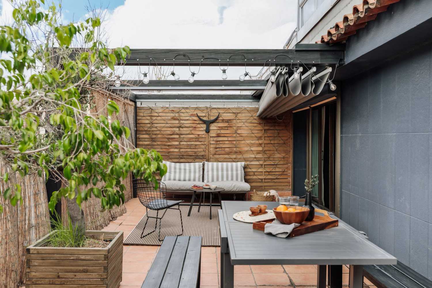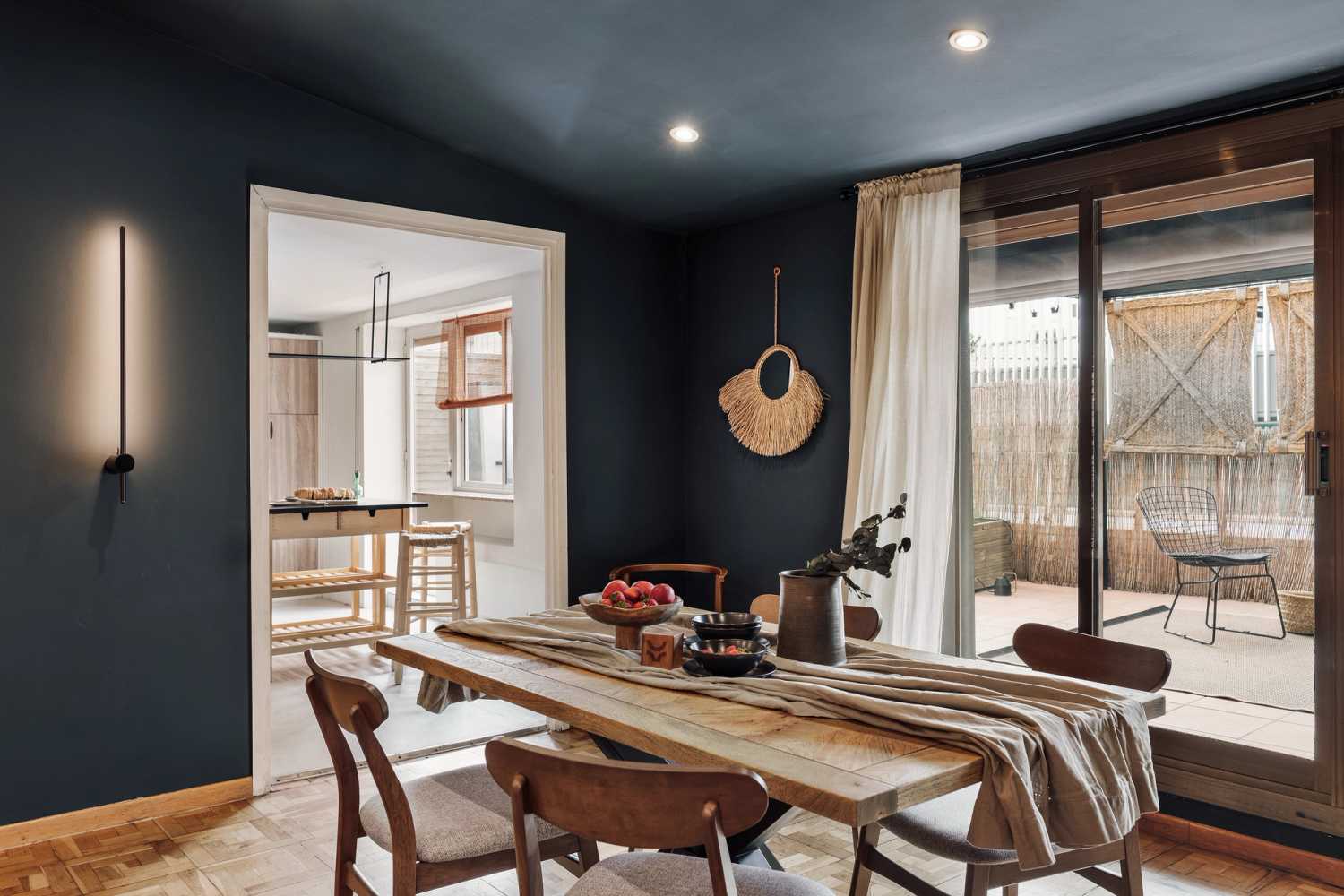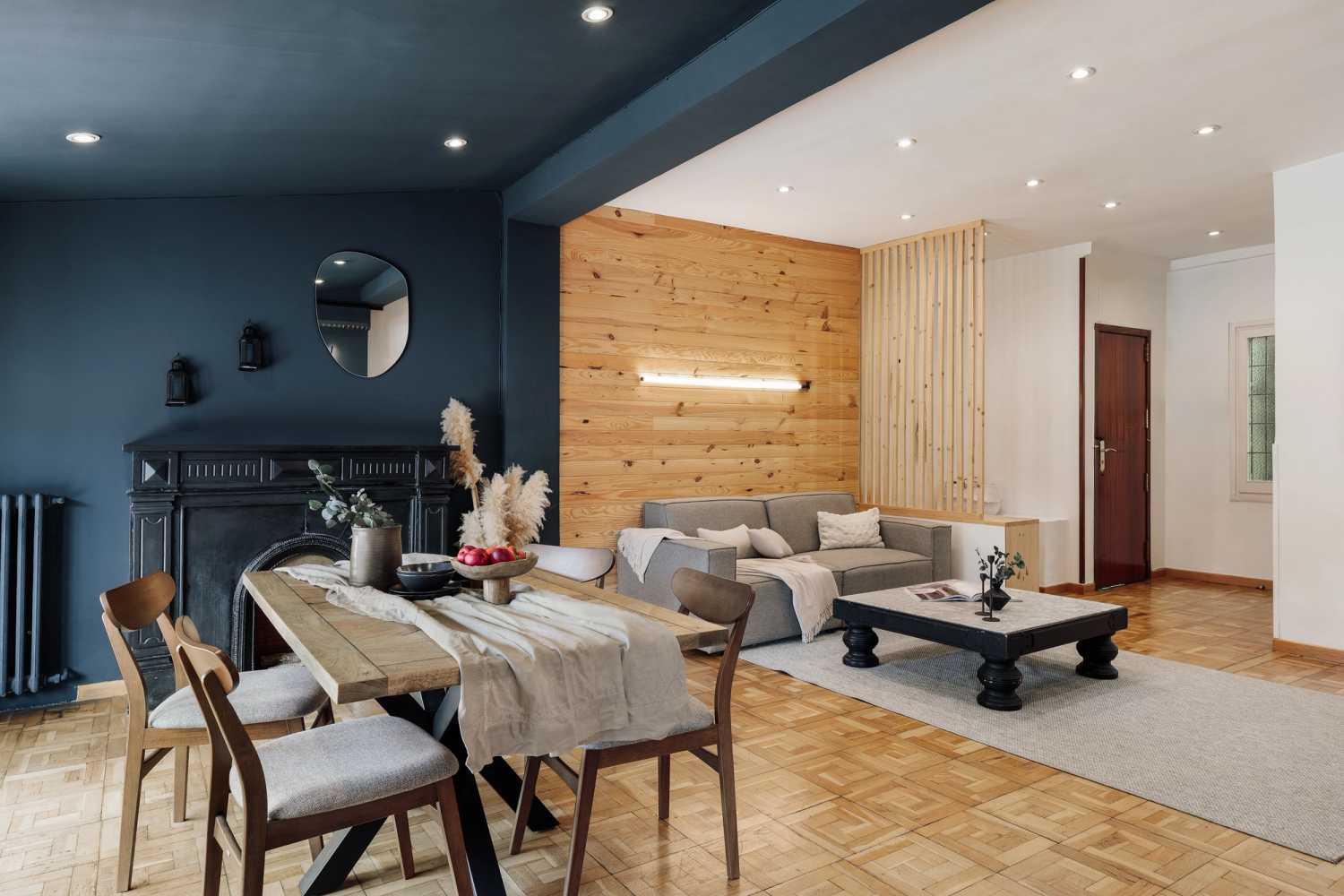 La terraza, de carácter privado, incluye zona de estar y área de comedor, este último con luces colgantes que cruzan por encima. Según entra en el apartamento encontrará el salón, en el que destaca la pared en madera y a medida, junto con la luz de neón sobre el sofá. Adyacente se ubica el comedor, que presume de chimenea tradicional y está equipado con una moderna mesa. El diseño se caracteriza por la interacción de los opuestos: tonos oscuros y decoración en madera clara, plantas secas y sutiles frente a plantas vivas y vibrantes.