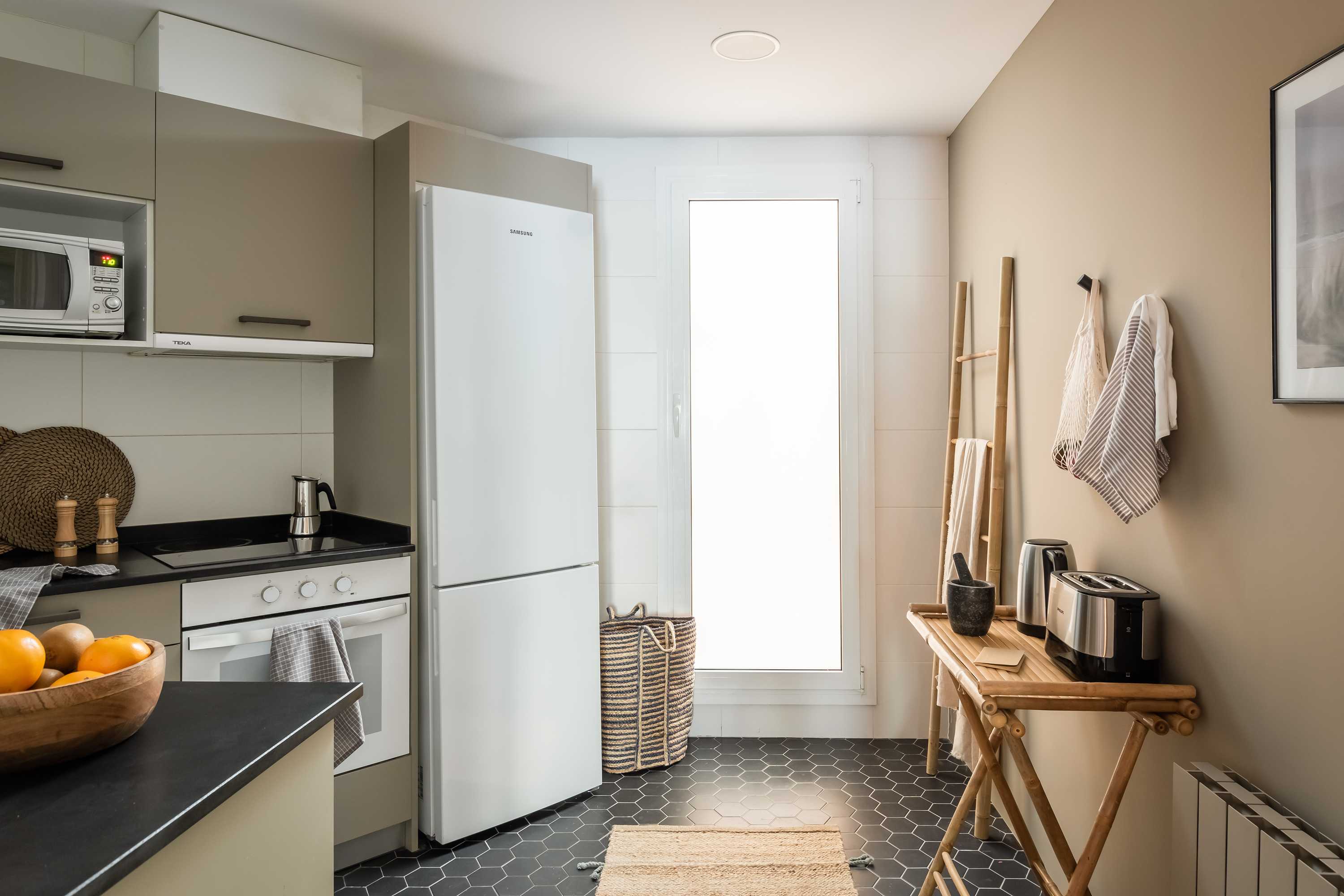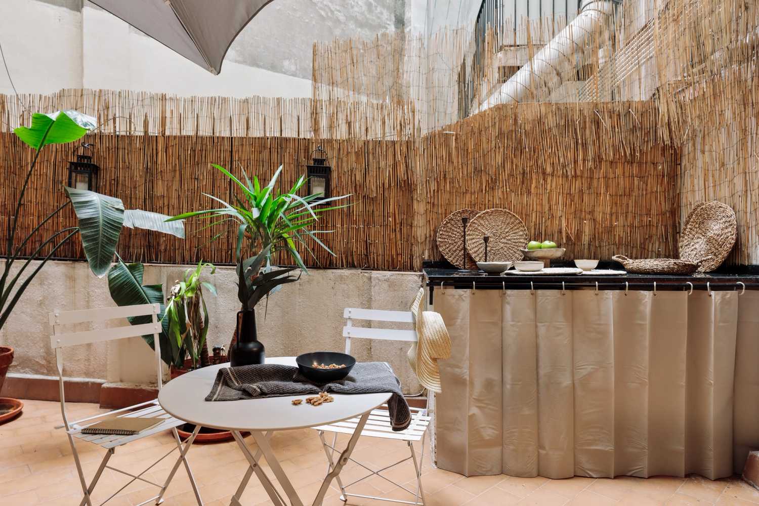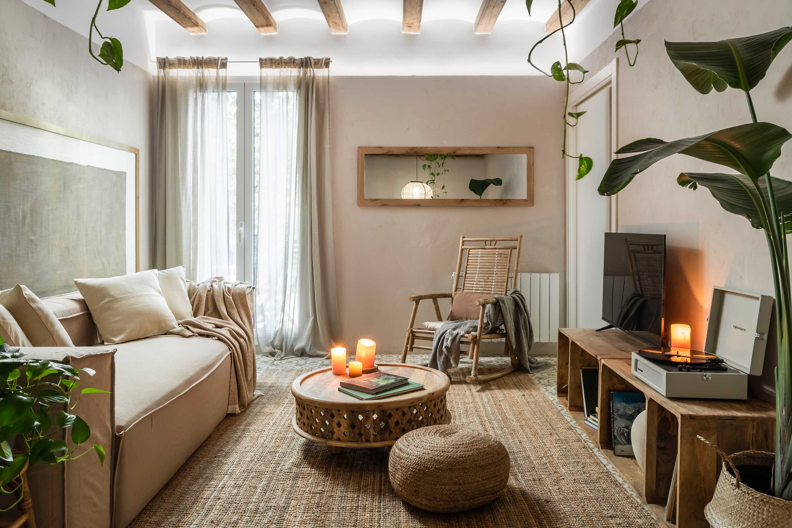 Karma es un apartamento con un diseño bellísimo que, en sus 70 metros cuadrados, ofrece dos dormitorios, dos cuartos de baño y un patio. Situado en el barrio barcelonés de Eixample Esquerra, combina la arquitectura tradicional catalana, como vigas de madera del techo y coloridas baldosas, con un diseño ligero y airoso, utilizando detalles en bambú y tonos claros.