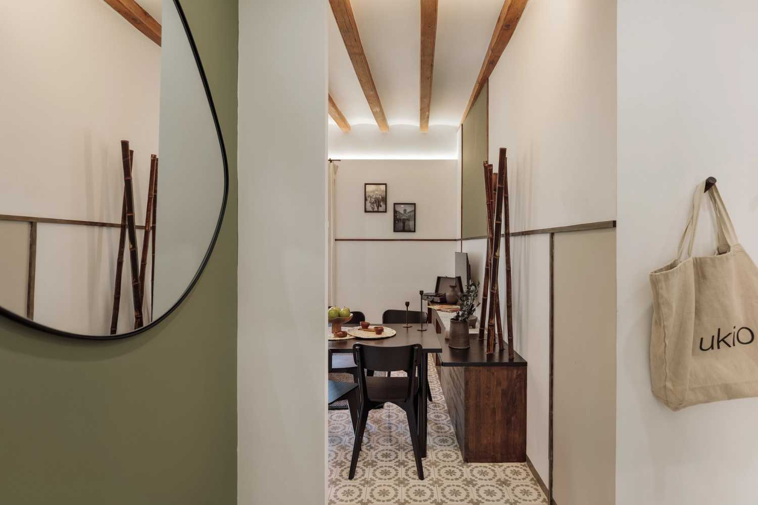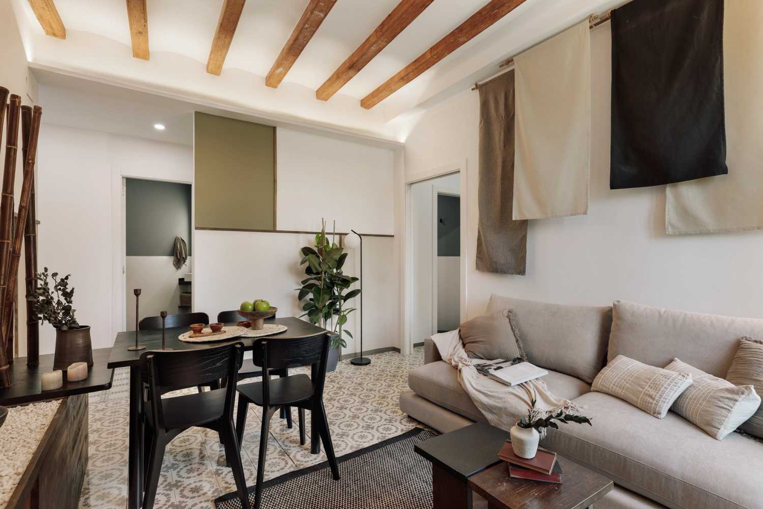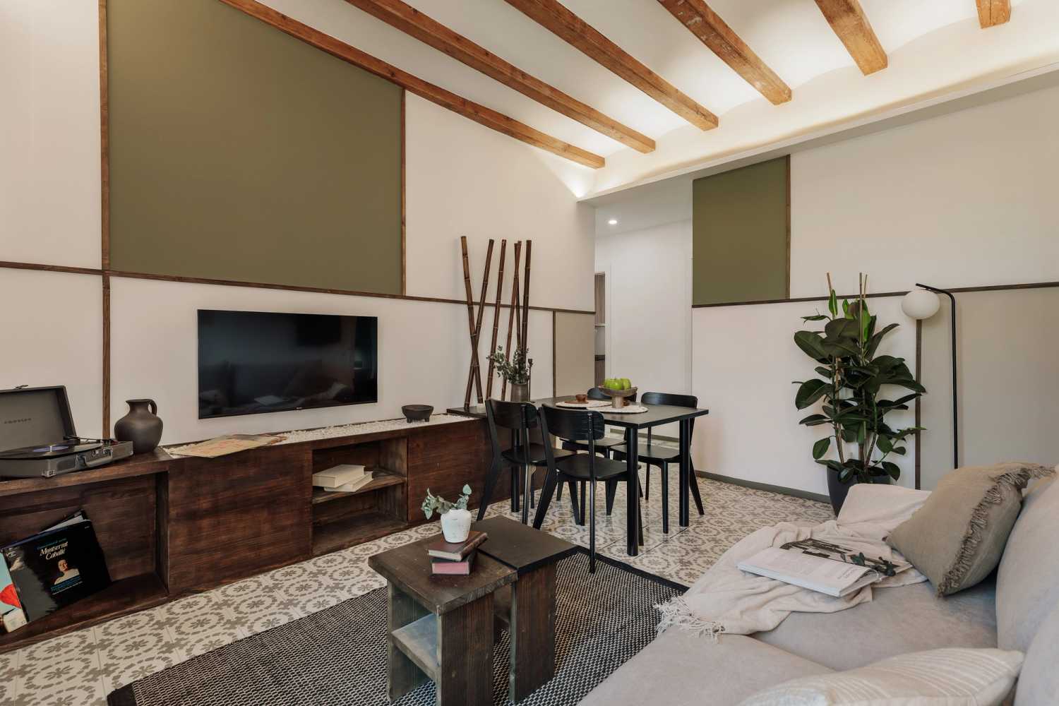 La sencilla y geométrica decoración en madera complementa las vigas de madera del techo, una característica típica de la arquitectura catalana. El salón dispone de un mueble a medida situado bajo el televisor y de un jardín zen de inspiración japonesa. Las mesas del comedor y de la cocina están realizadas combinando madera con ladrillos, logrando así una sincretización de lo rústico y lo industrial.