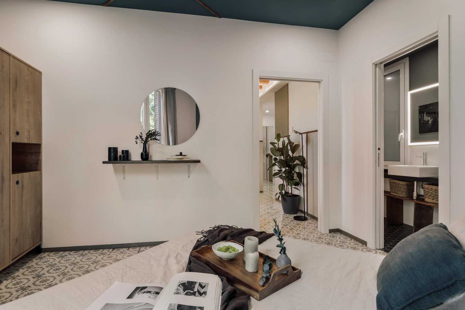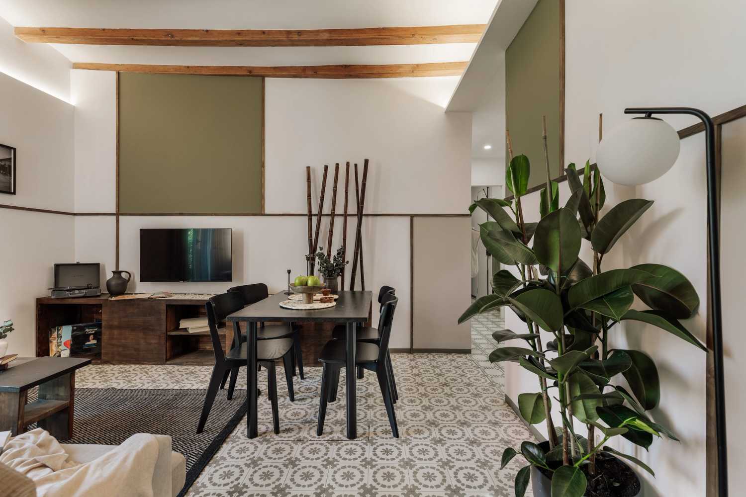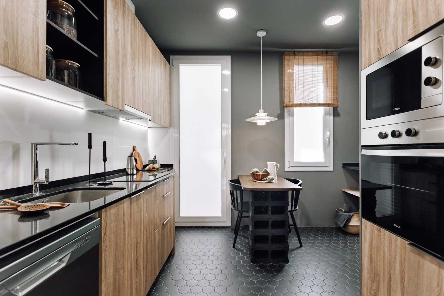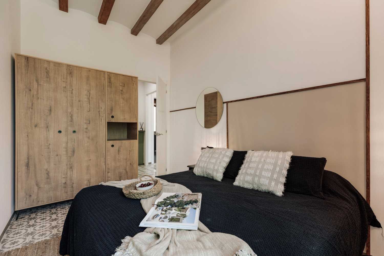 La sencilla y geométrica decoración en madera complementa las vigas de madera del techo, una característica típica de la arquitectura catalana. El salón dispone de un mueble a medida situado bajo el televisor y de un jardín zen de inspiración japonesa. Las mesas del comedor y de la cocina están realizadas combinando madera con ladrillos, logrando así una sincretización de lo rústico y lo industrial.
