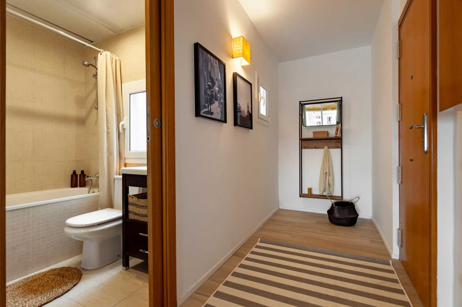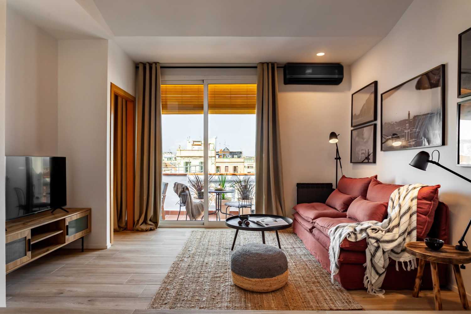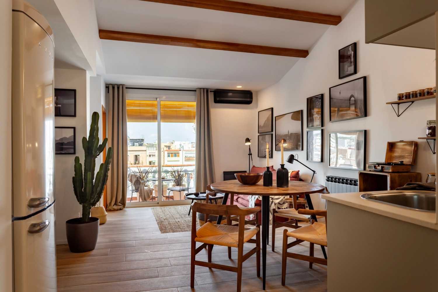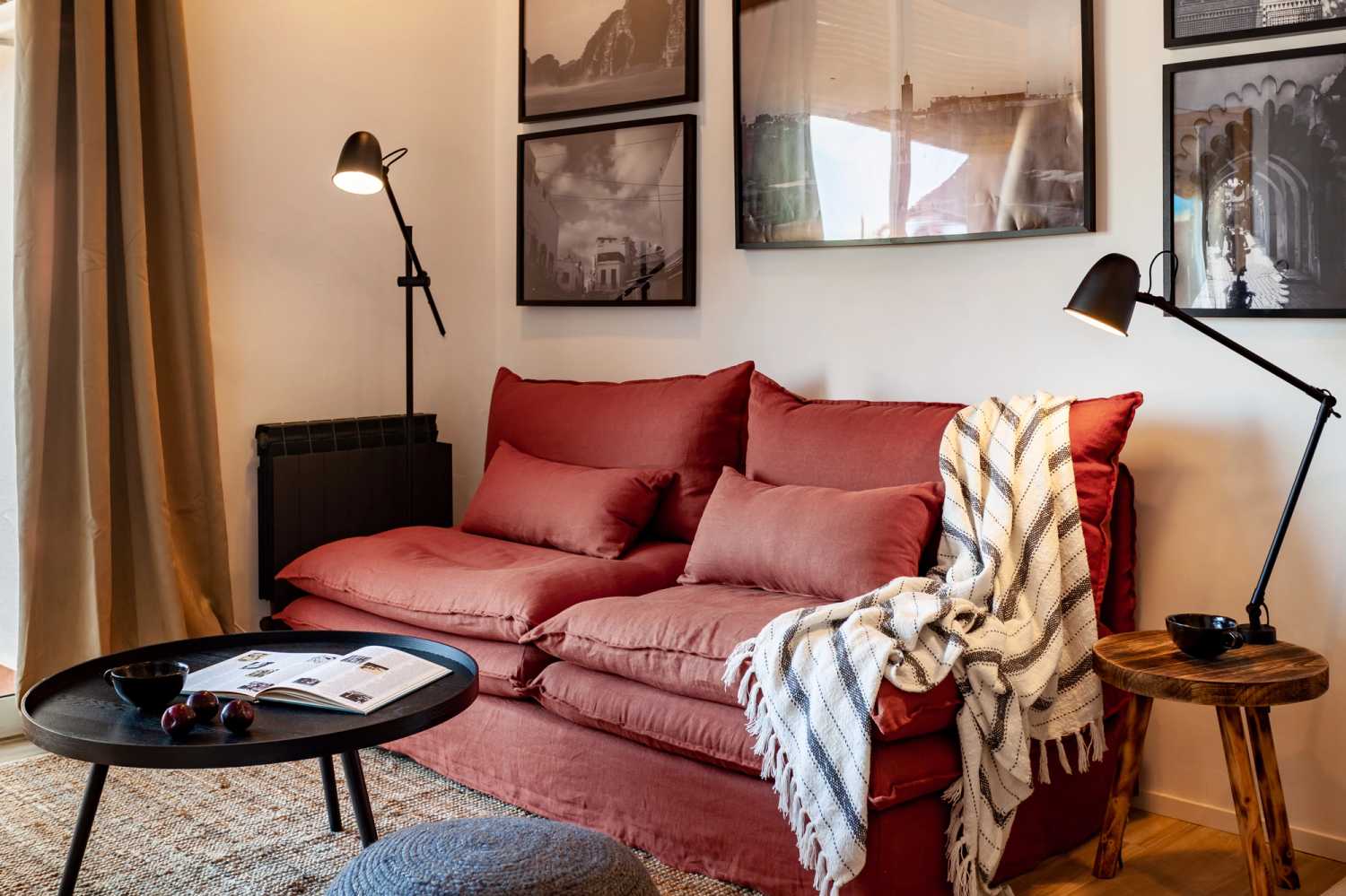 La cocina, americana, está integralmente equipada con todos los utensilios de cocina y electrodomésticos. La mesa de comedor, redonda, ofrece capacidad para cuatro personas y está orientada a la zona de estar. Los detalles en madera barnizada oscuro complementan los tonos terracota y tierra del salón. Encuentre una cómoda zona de estar con un sofá, frente al televisor inteligente y junto al tocadiscos de vinilo y los altavoces bluetooth.