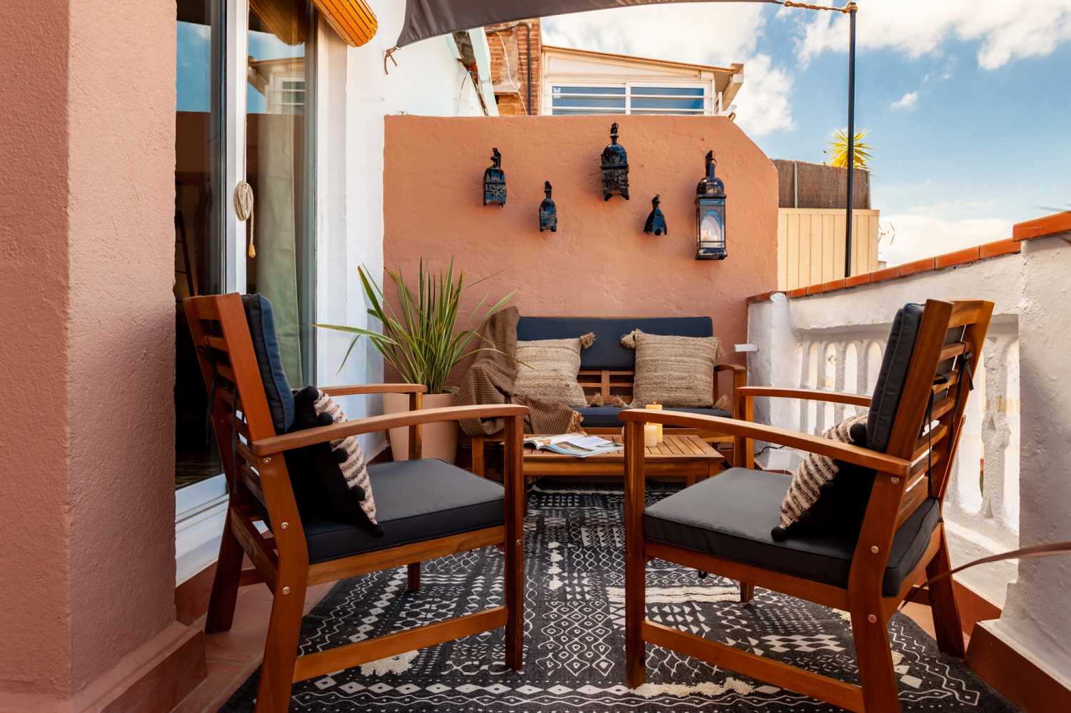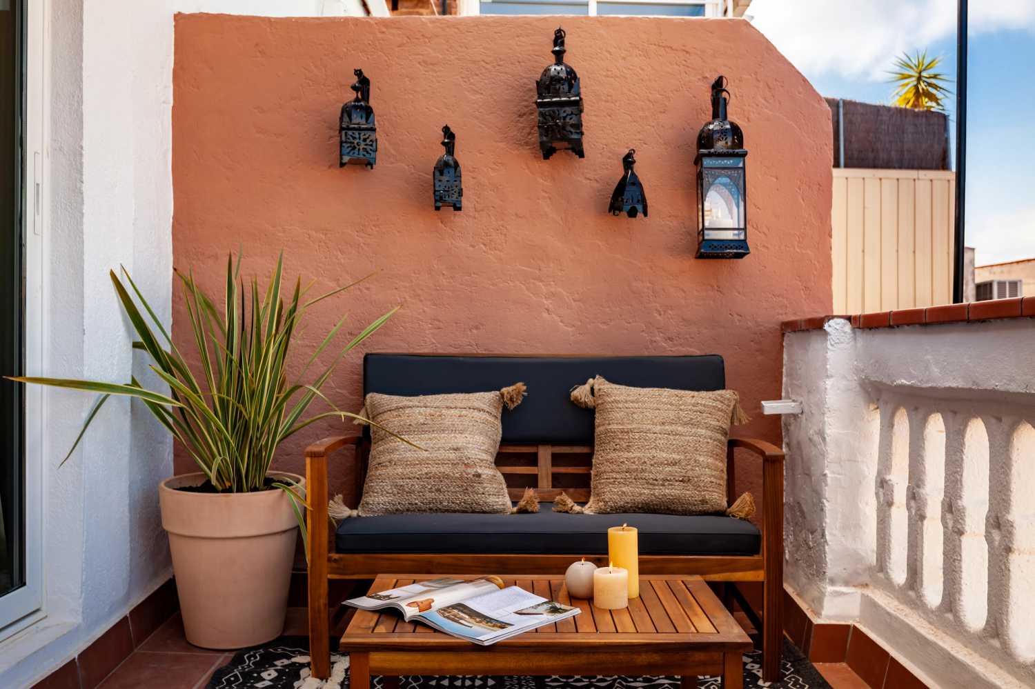 El carácter rústico del apartamento, unido a su colorida decoración y un diseño bohemio, contribuye a crear un ambiente cálido en Hassi. Este piso de 60 metros cuadrados dispone de dos dormitorios y una terraza, lo que proporciona luz natural en todo el espacio.