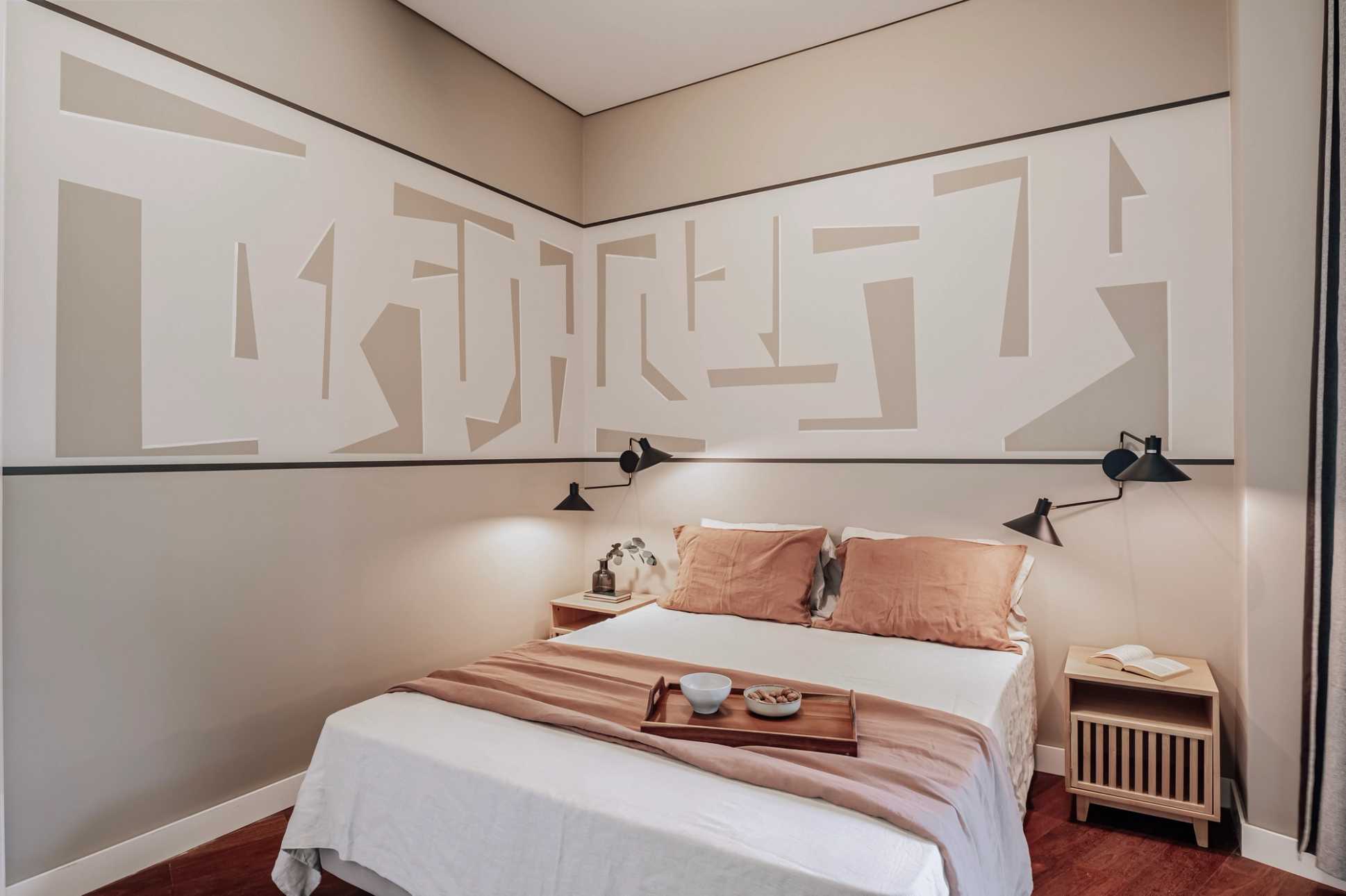 Este acogedor apartamento de 1 dormitorio y 1 baño tiene un diseño único para proporcionar solaz de la bulliciosa ciudad metropolitana. El dormitorio cuenta con una cama de matrimonio rodeada de lámparas tejidas y motivos geométricos en la pared. Hay una estación de trabajo junto a la puerta que da al balcón exterior. El gran cuarto de baño de mármol tiene un diseño elegante con ducha a ras de suelo.