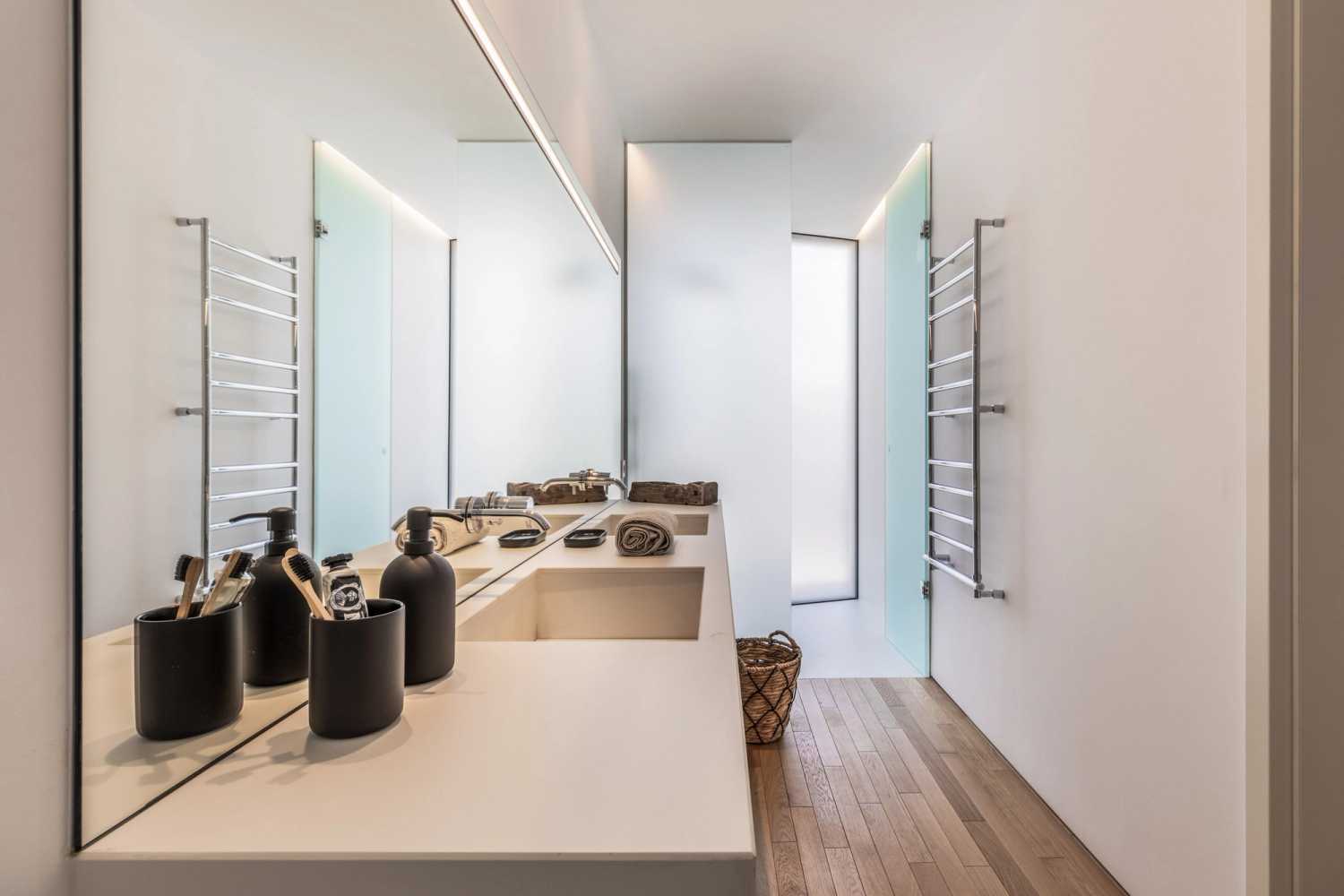 Los dos dormitorios están cuidadosamente diseñados con camas de matrimonio, lo que garantiza un sueño cómodo y reparador. El dormitorio principal es un oasis de serenidad, con grandes ventanales que dan al exterior y crean un ambiente tranquilo. También incluye un cuarto de baño privado para mayor comodidad e intimidad. Además, este dormitorio está equipado con una estación de trabajo dedicada, ideal para aquellos que necesitan trabajar o estudiar desde casa. El segundo dormitorio presenta una decoración playera con sutiles rayas y tonos oceánicos. El segundo cuarto de baño independiente está elegantemente diseñado y equipado con modernos accesorios.