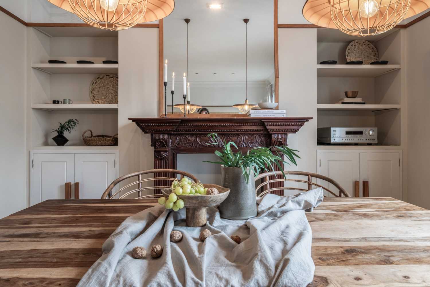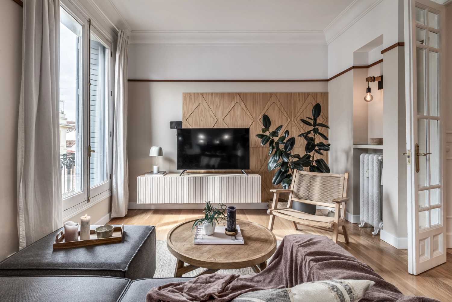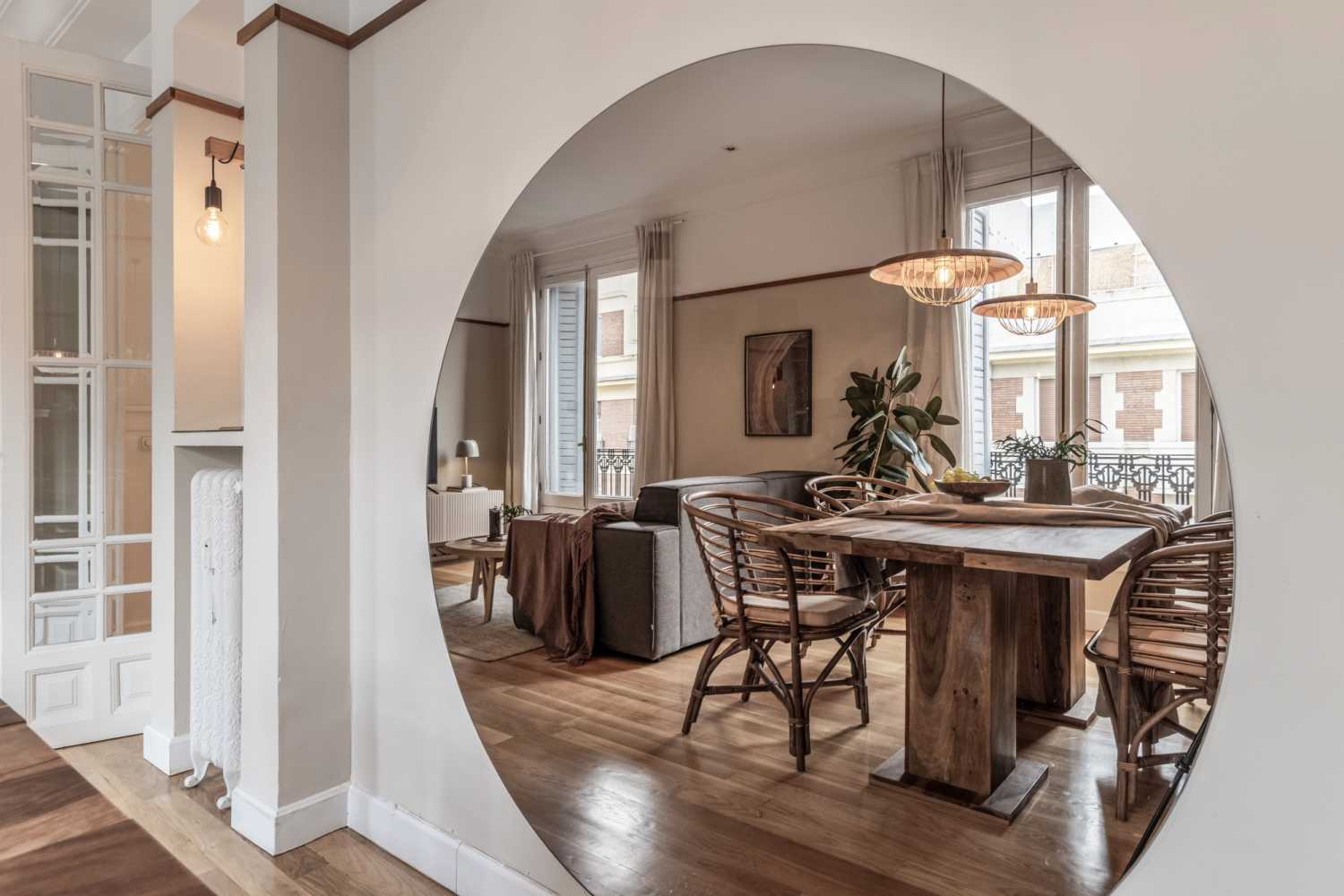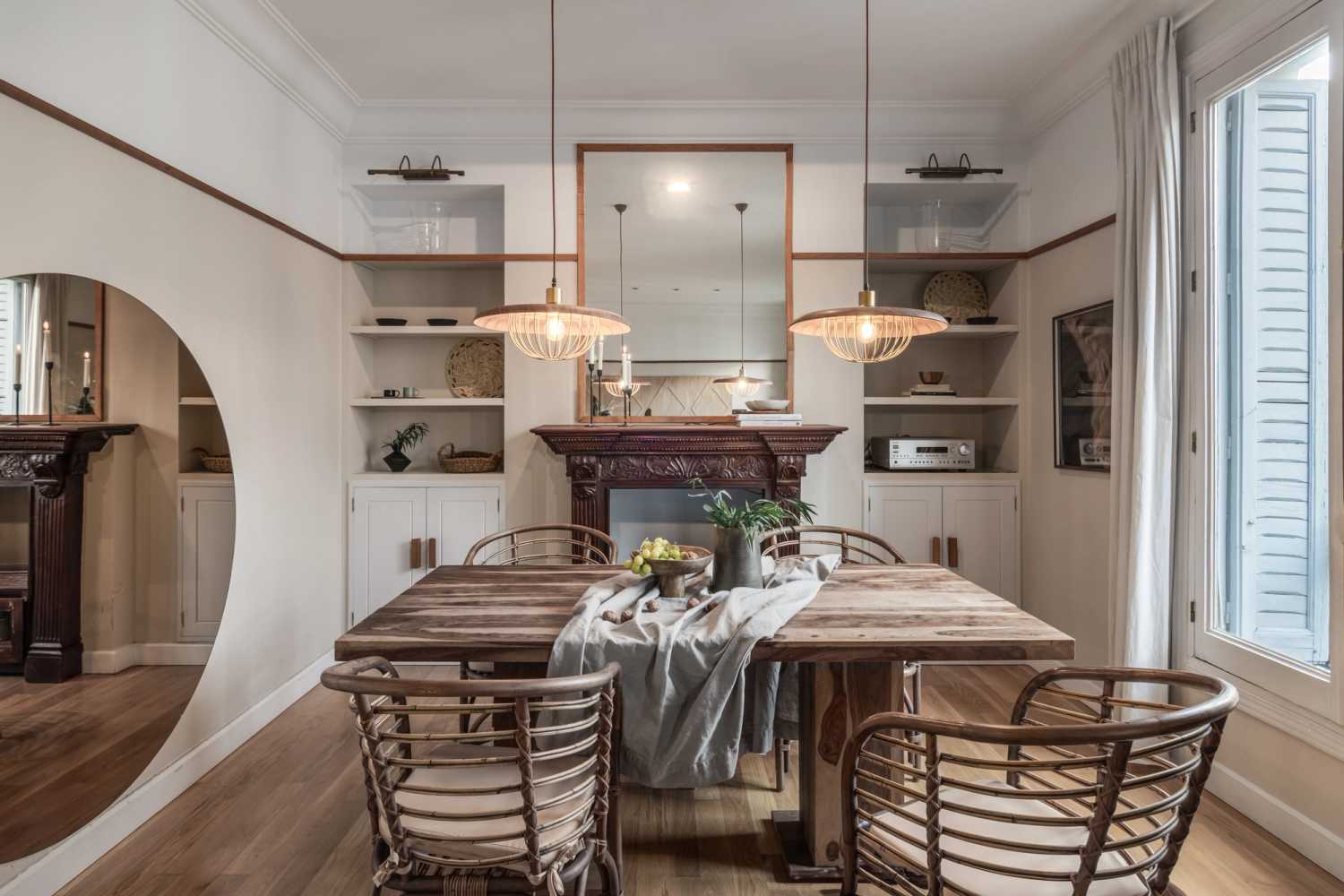 Termina de conformar el apartamento el salón, al que se accede a través de las puertas francesas, y se encuentra compuesto por la zona de estar y un área de comedor. El diseño resulta único, con detalles en madera sobre la pared, además de un gran espejo montado sobre la impresionante chimenea.