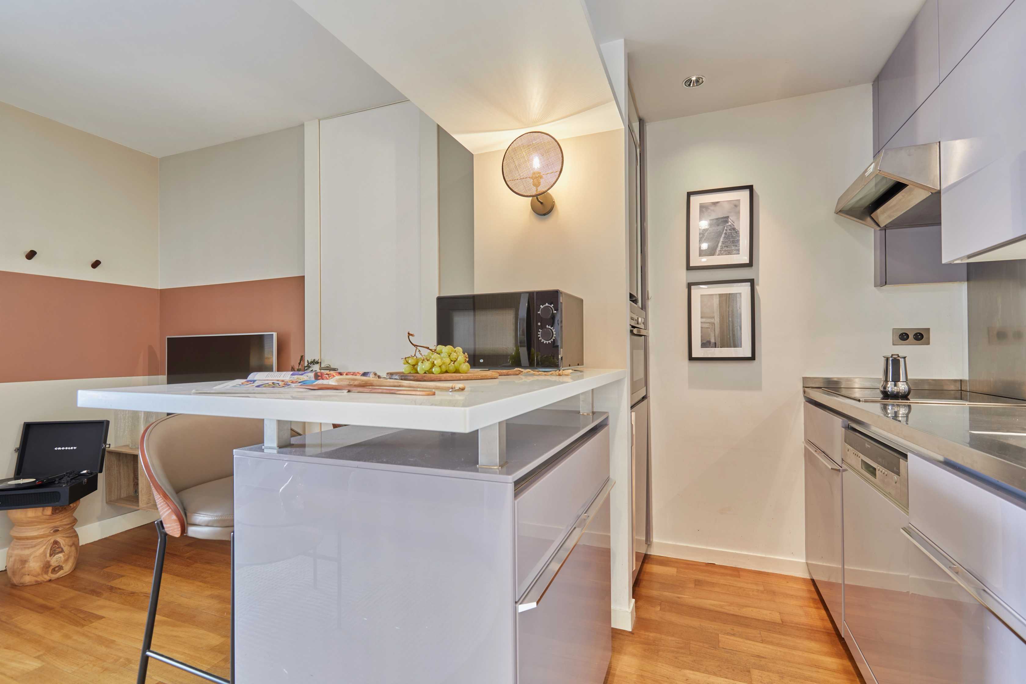 El salón de planta abierta conecta perfectamente con la cocina totalmente equipada, lo que facilita la preparación de comidas. El salón está diseñado con una sutil decoración de temática playera, creando un ambiente relajante. También está equipado con un sistema de entretenimiento, perfecto para relajarse con una película o su programa de televisión favorito. El acceso a la calle desde el salón le permite empaparse de la animada energía de Saint-Germain-des-Prés.