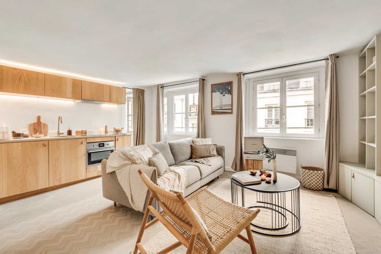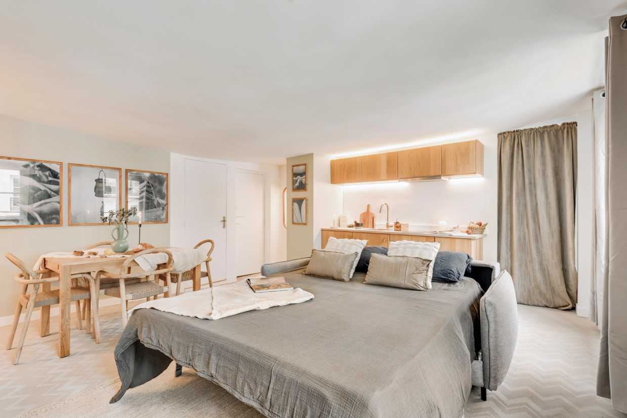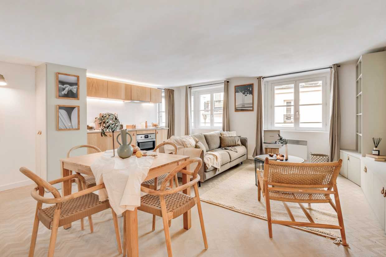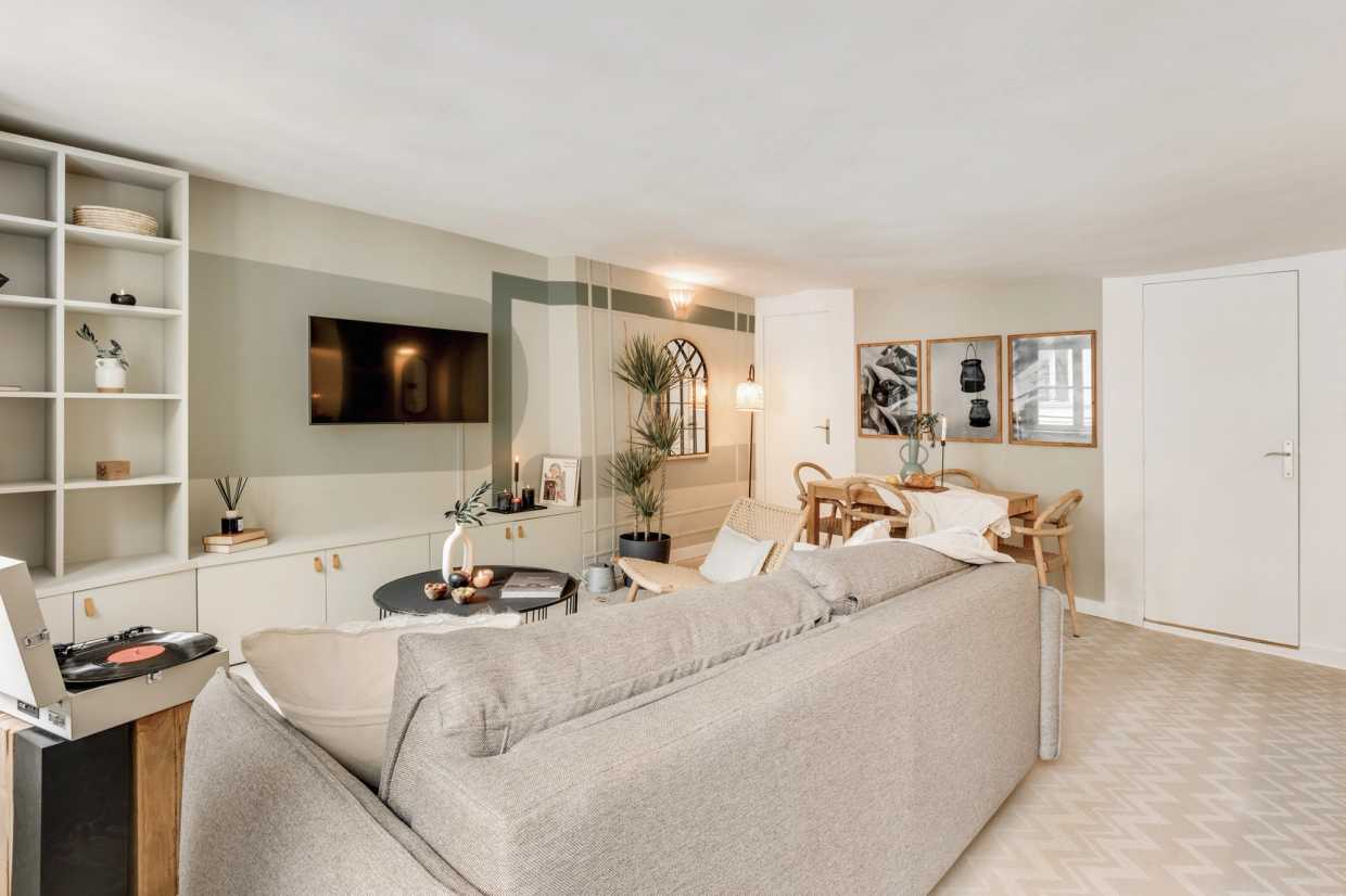 La sala de estar de planta abierta se conecta perfectamente a la cocina totalmente equipada, por lo que es muy fácil de preparar sus comidas favoritas. El ambiente de inspiración costera crea una atmósfera relajante, ideal tanto para el trabajo como para el ocio. El salón también está equipado con un sistema de entretenimiento, perfecto para relajarse con una película o su programa de televisión favorito. Una mesa de comedor completa el espacio, ofreciendo un lugar acogedor para las comidas y la planificación de sus aventuras parisinas.