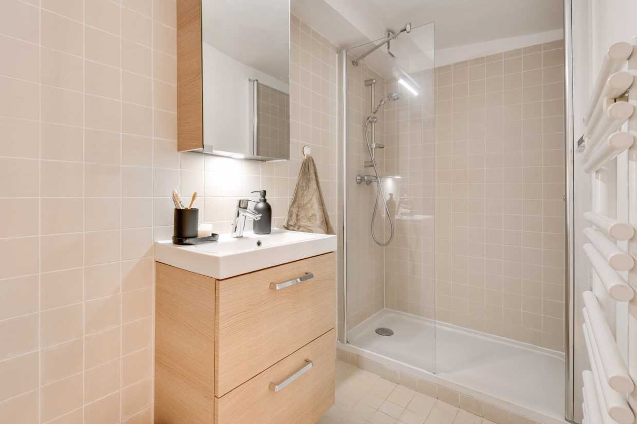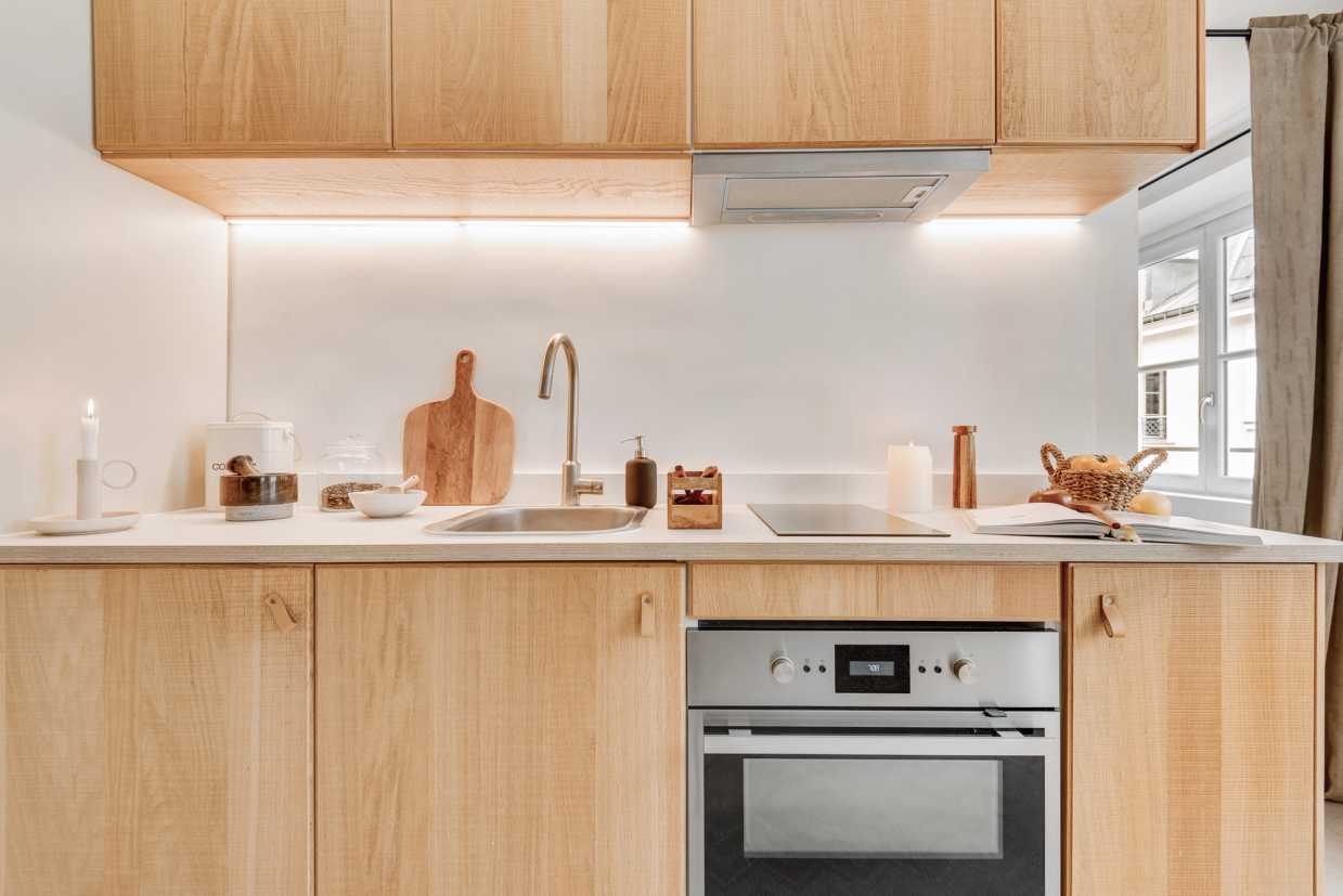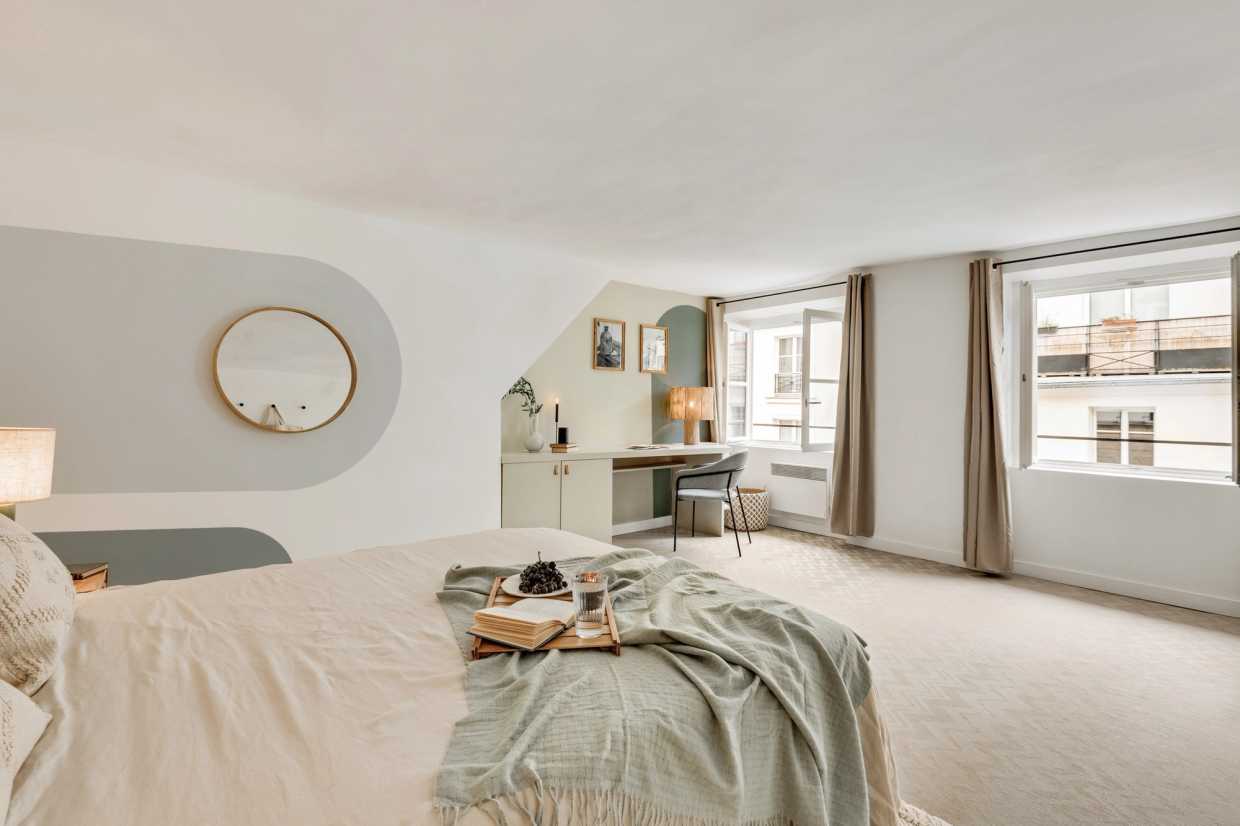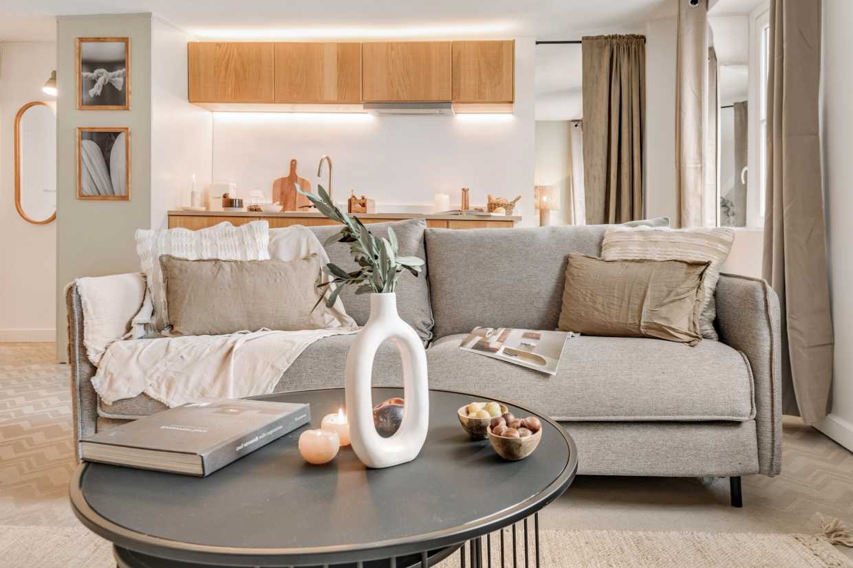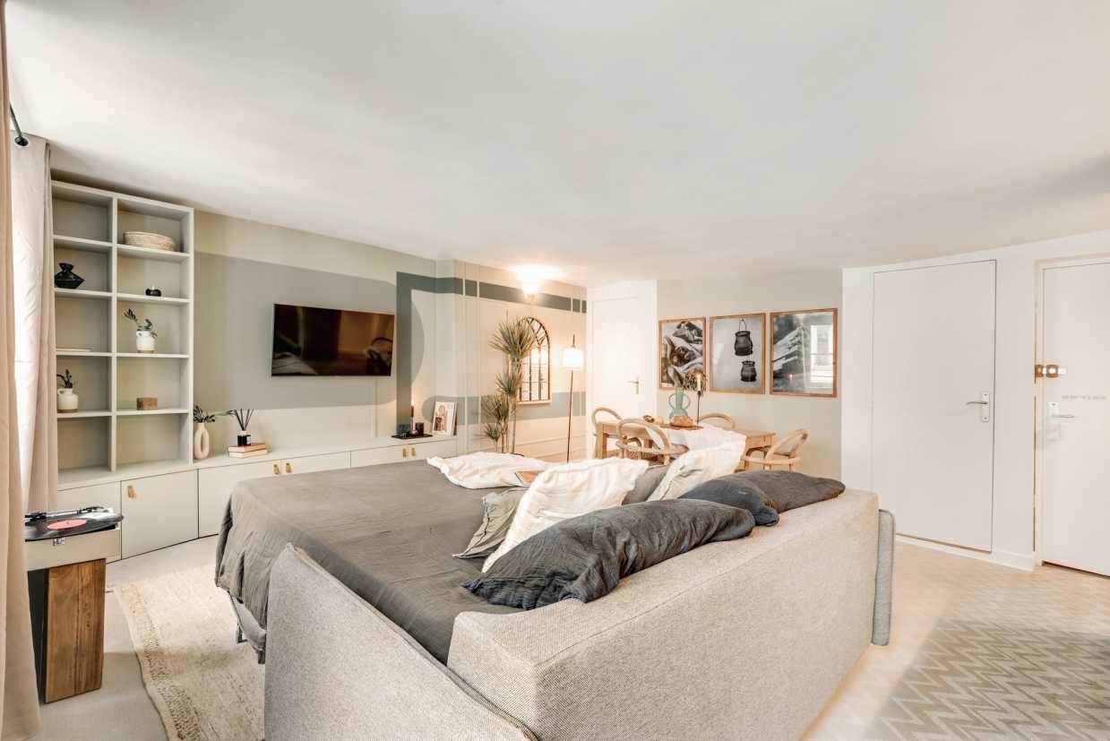 La sala de estar de planta abierta se conecta perfectamente a la cocina totalmente equipada, por lo que es muy fácil de preparar sus comidas favoritas. El ambiente de inspiración costera crea una atmósfera relajante, ideal tanto para el trabajo como para el ocio. El salón también está equipado con un sistema de entretenimiento, perfecto para relajarse con una película o su programa de televisión favorito. Una mesa de comedor completa el espacio, ofreciendo un lugar acogedor para las comidas y la planificación de sus aventuras parisinas.