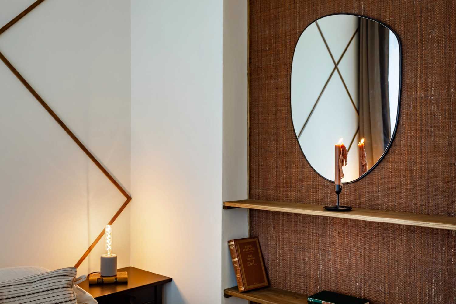 Posteriormente, el pasillo revela, a su izquierda, una estación de trabajo dedicada y, enfrente, el primer dormitorio. Éste destaca por sus paredes y techos, decorados con motivos geométricos en tonos terracota y que ponen de manifiesto la inspiración sahariana de Siwa. La habitación se completa con una lujosa cama individual y la inclusión de accesorios y motivos de decoración tradicional propia del desierto.