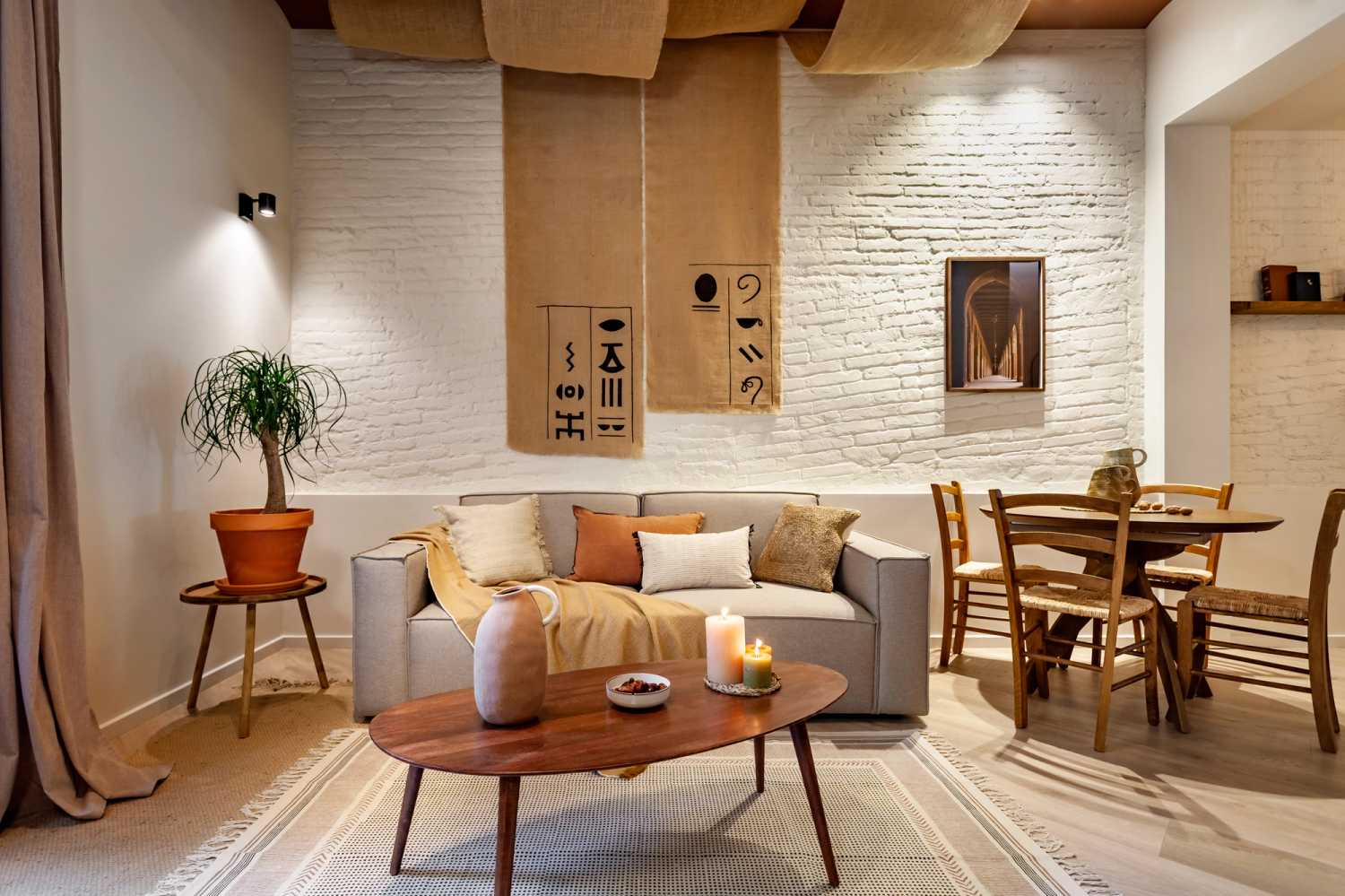 Superando la puerta de entrada al piso, los huéspedes descubrirán el salón y el comedor, compartiendo distribución de concepto abierto e incluyendo acceso, en el extremo de la estancia, a un balcón soleado. Este espacio destaca por su techo con doseles superpuestos, que añaden un toque artístico y descienden detrás del mobiliario de diseño para ceder protagonismo a la destacada combinación de tejidos con jeroglíficos estampados y ladrillo expuesto y encalado.