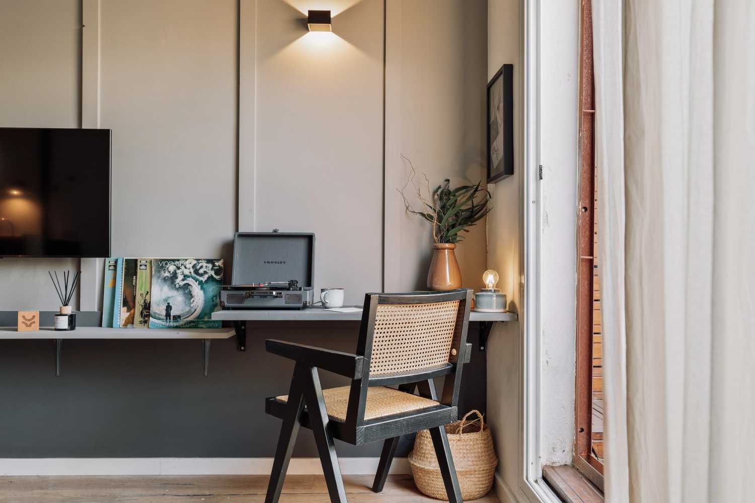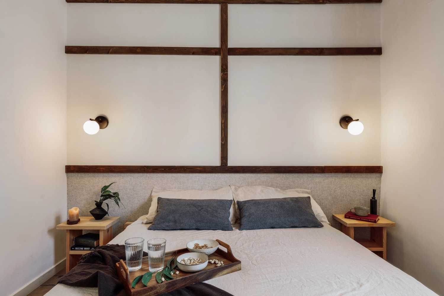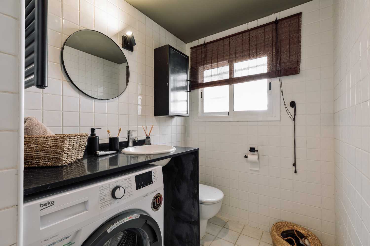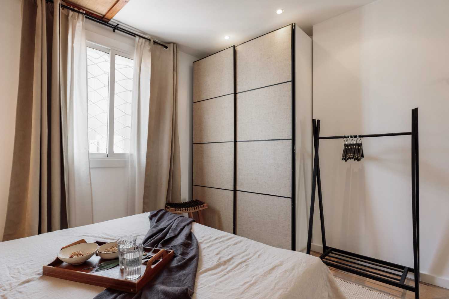 El dormitorio, con cama de matrimonio y amplio espacio de almacenamiento, está adornado con una decoración geométrica de madera personalizada en el techo y la pared. Para mayor comodidad, este apartamento viene equipado con aire acondicionado en el salón y calefacción radial en todas las habitaciones, así como ropa de cama y baño limpias.