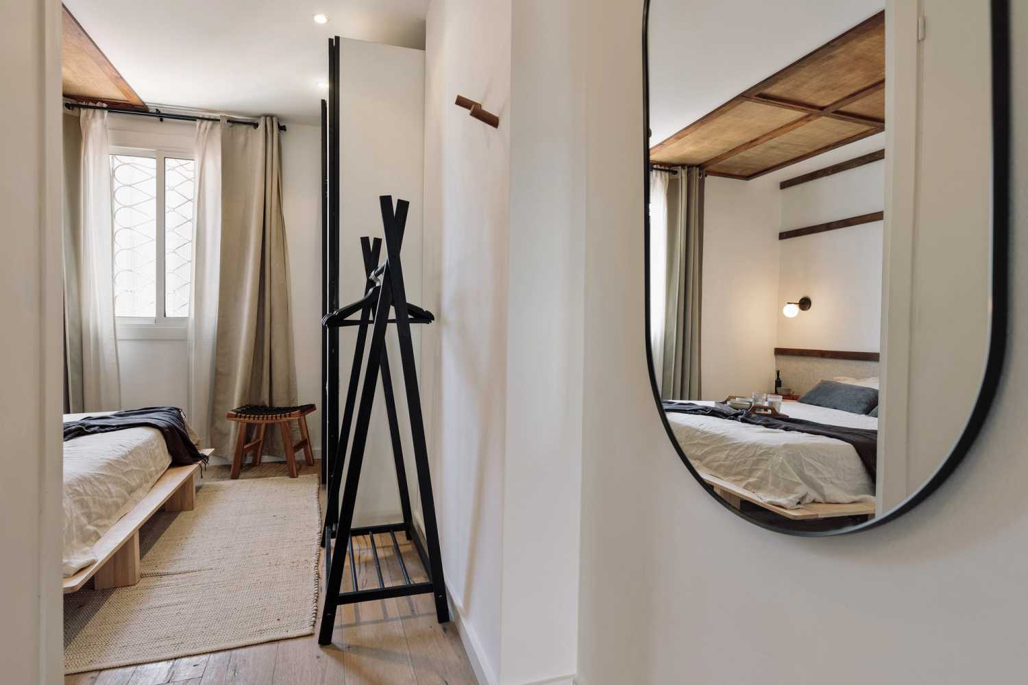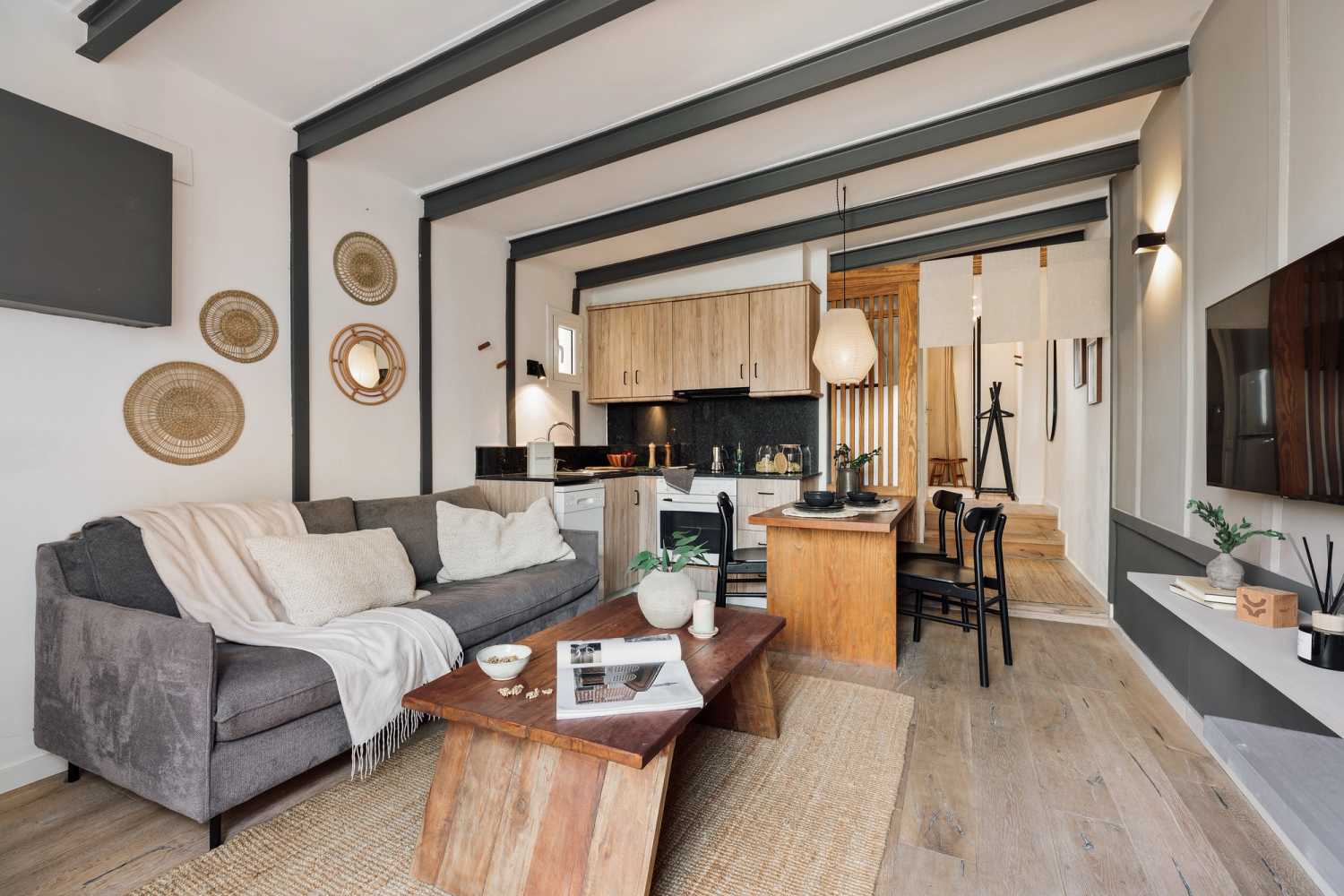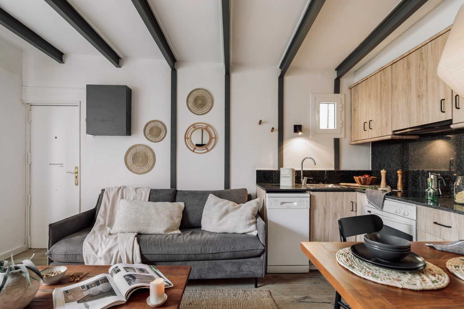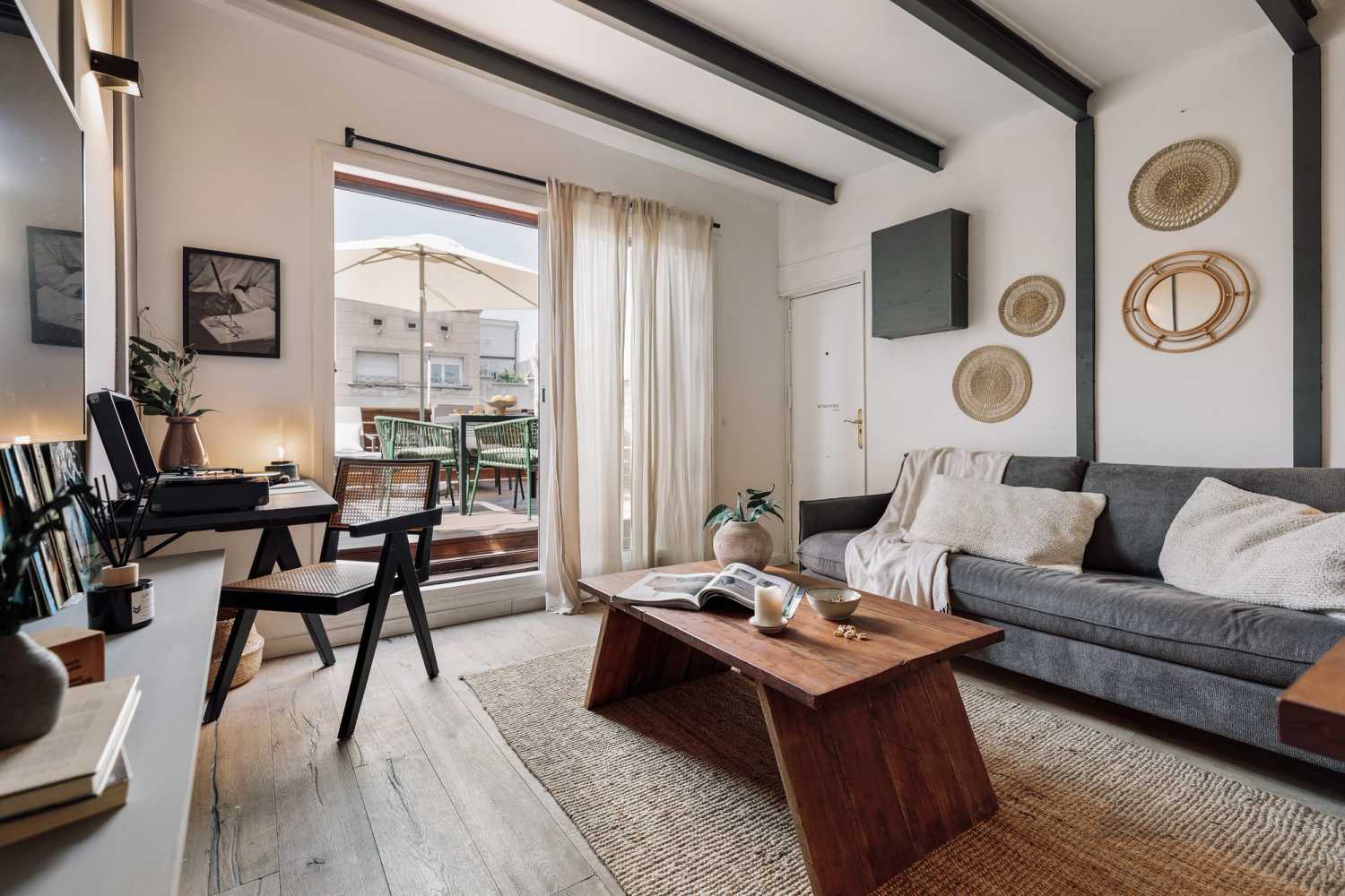 El dormitorio, con cama de matrimonio y amplio espacio de almacenamiento, está adornado con una decoración geométrica de madera personalizada en el techo y la pared. Para mayor comodidad, este apartamento viene equipado con aire acondicionado en el salón y calefacción radial en todas las habitaciones, así como ropa de cama y baño limpias.