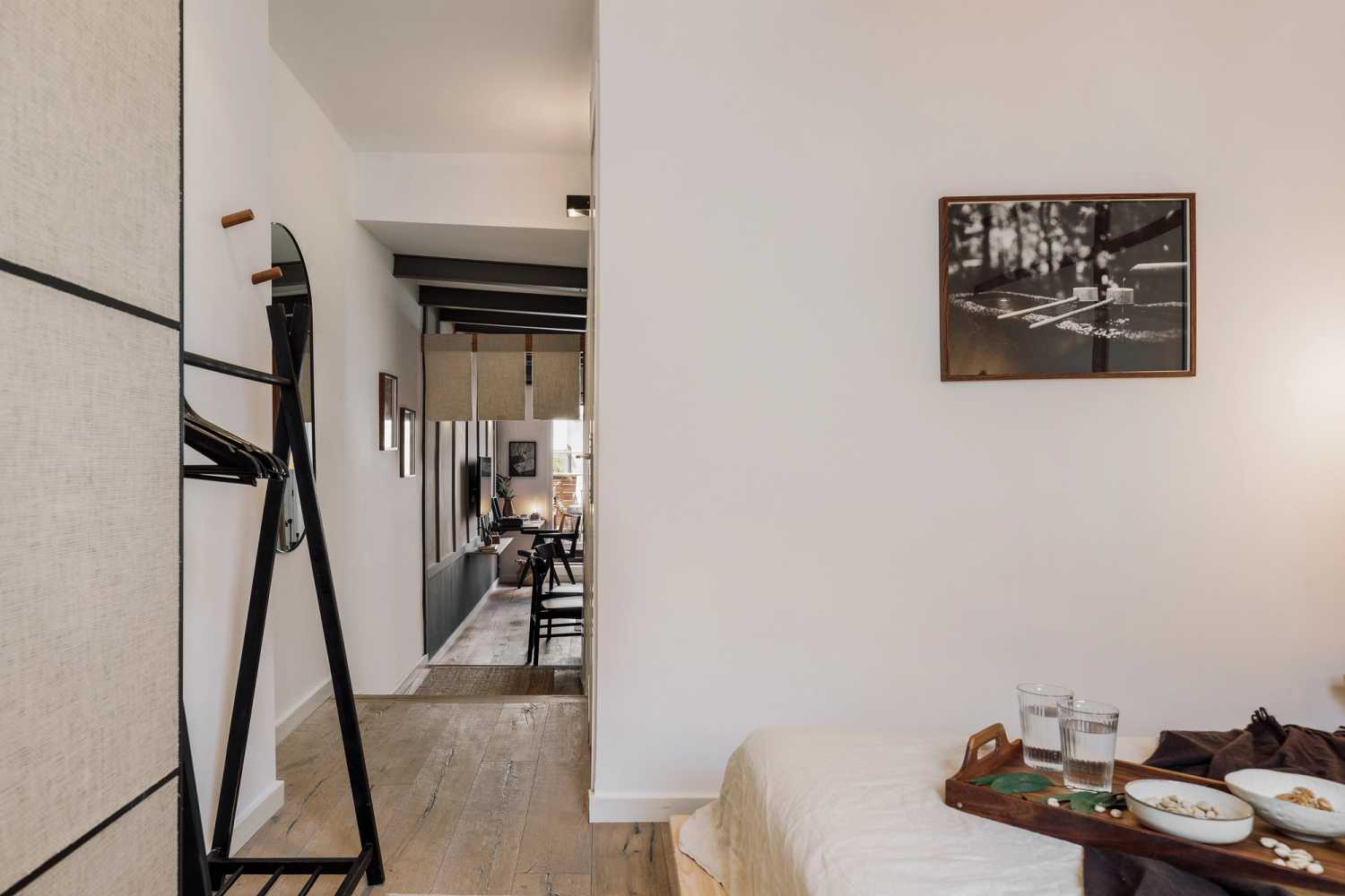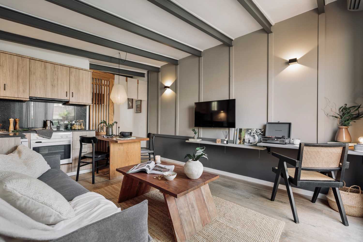 Oboke, inspirada en la región de Japón, mide 50 metros cuadrados con 1 dormitorio y 1 baño. La terraza de 15 metros cuadrados utiliza plantas vibrantes y colores claros para crear un ambiente tranquilo.