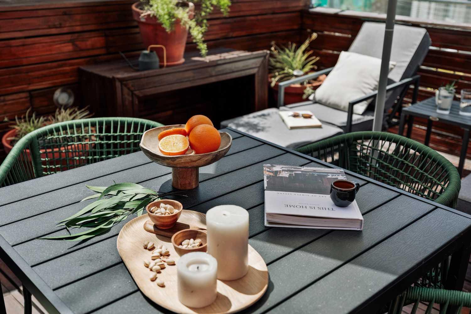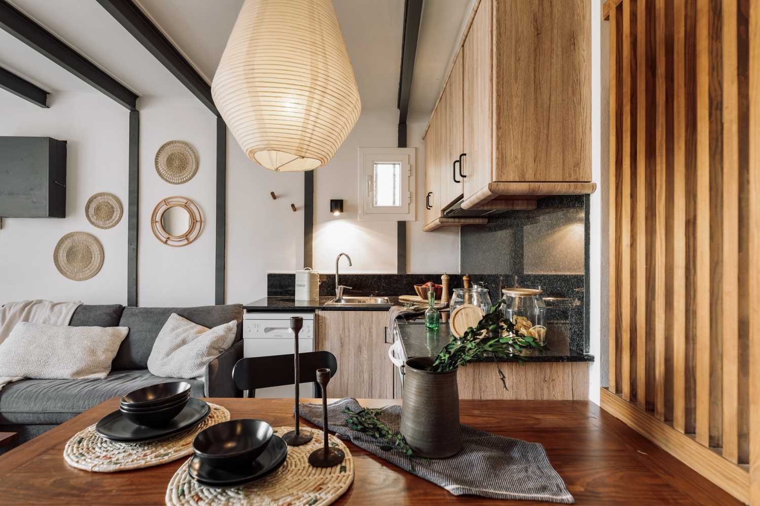 Una pérgola cubre un gran salón-cama, junto a una pequeña mesa de comedor redonda. Al entrar en el apartamento, una cocina abierta equipada con todos los utensilios de cocina tiene una mesa de comedor.