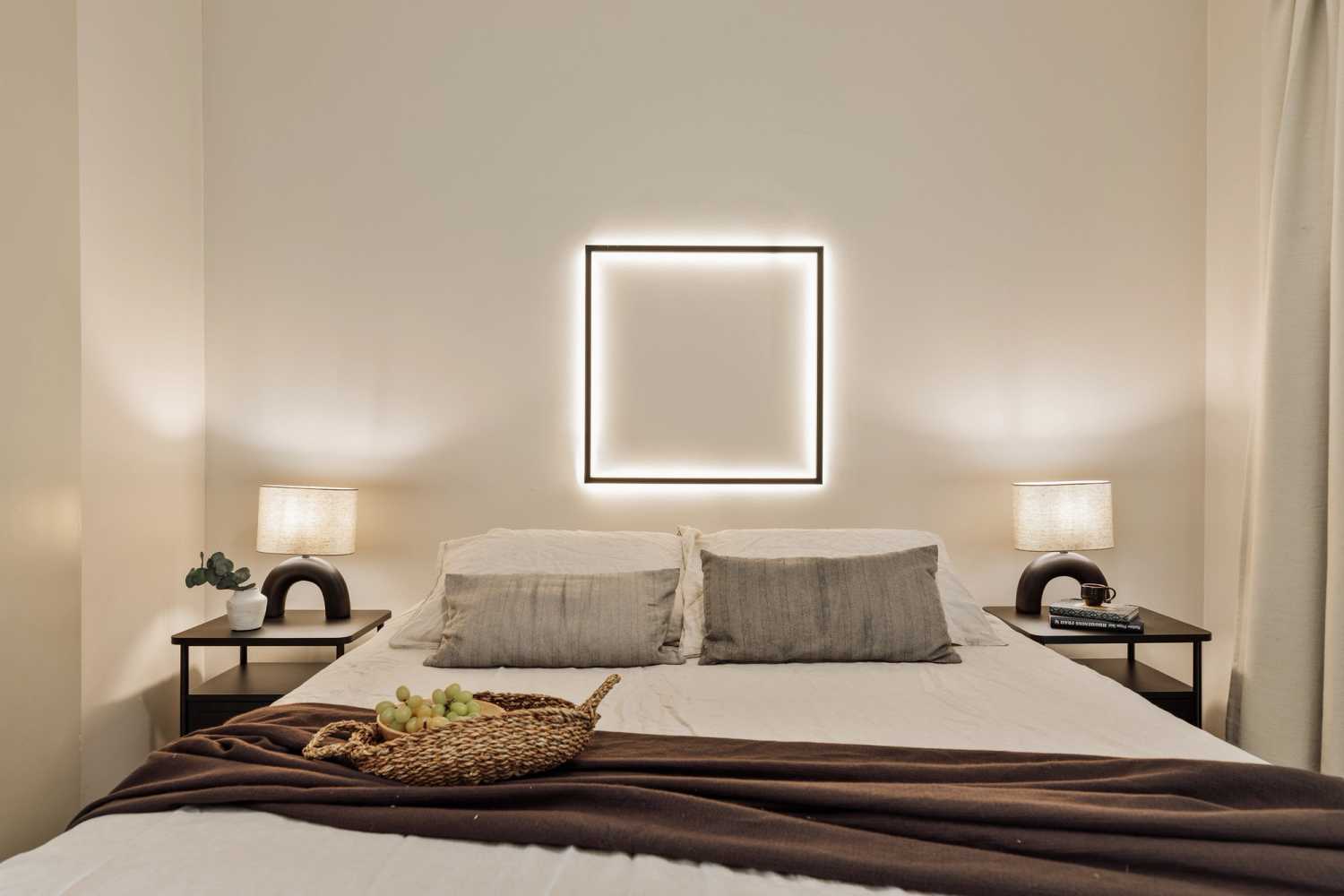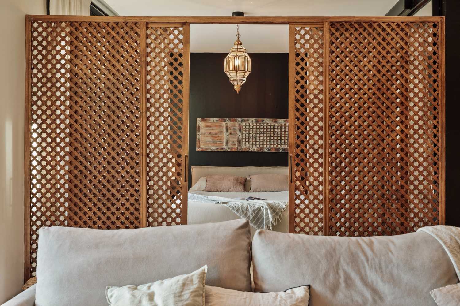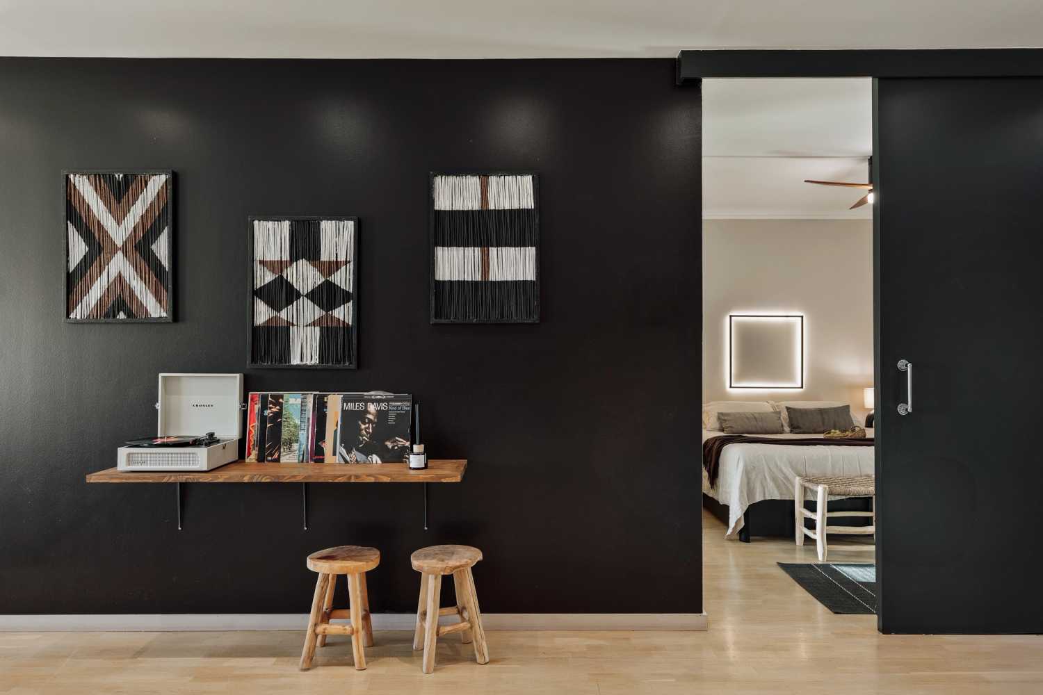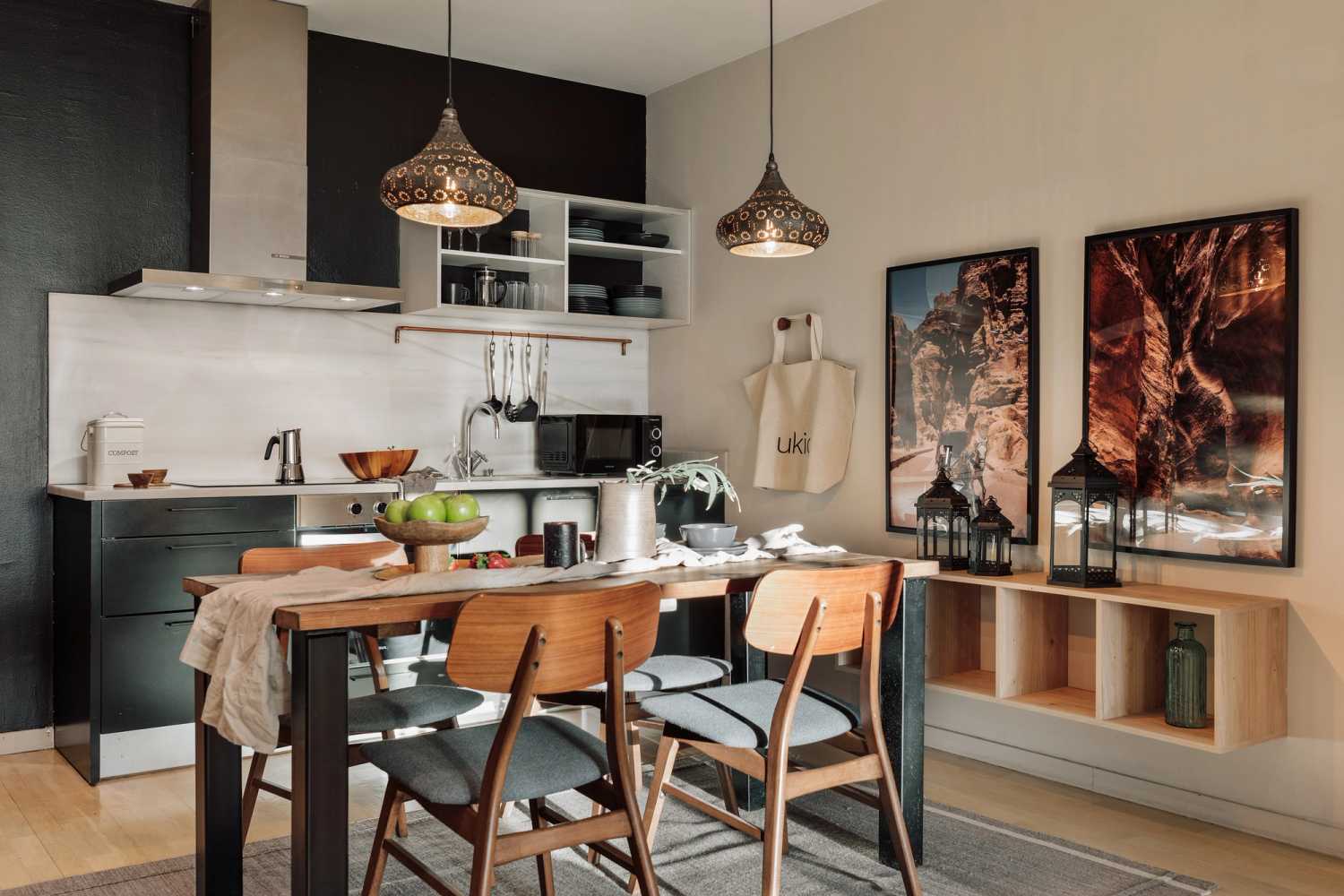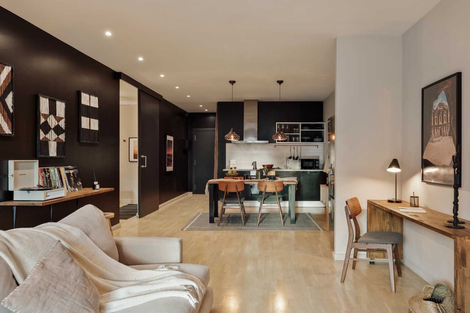 Inspired by the Wabi desert, this 2 bedroom apartment marries geometric patterns with varnished wood decor and elegant black tones. Step into the 90 square meter space to find an open kitchen finished in black vinyl.