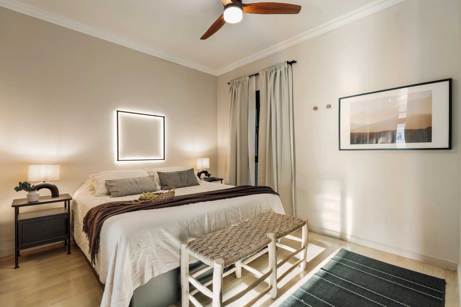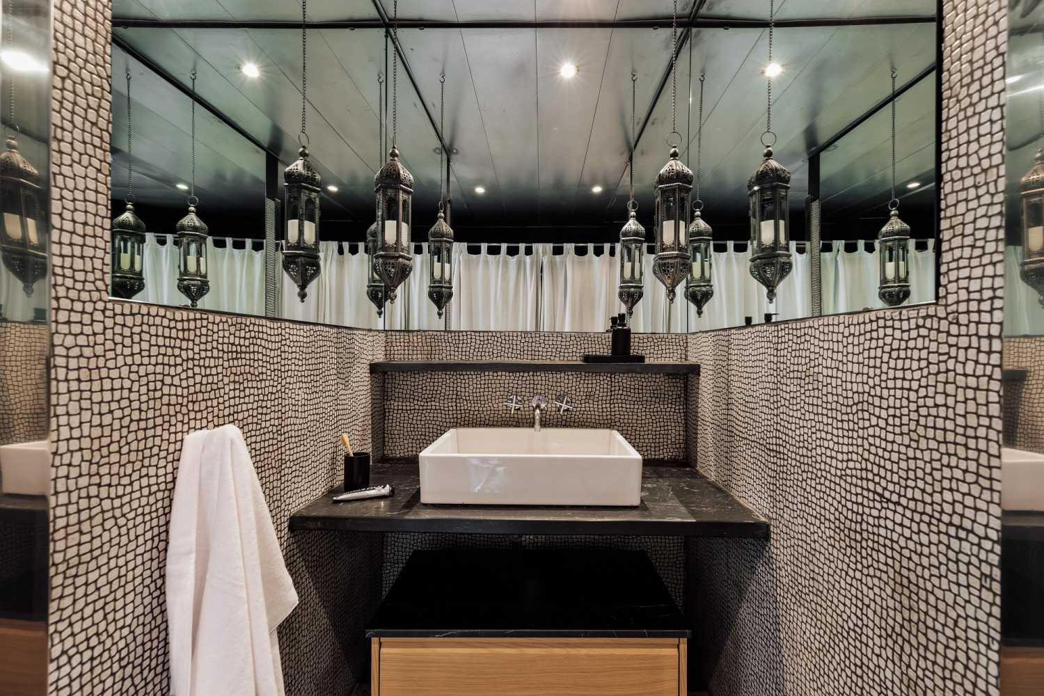 Both bedrooms are fitted with queen-sized beds with fresh linens with ample storage space. The bedrooms are connected via the bathroom area. The full shower is separate to the ornate sink area decorated with hanging lanterns.
