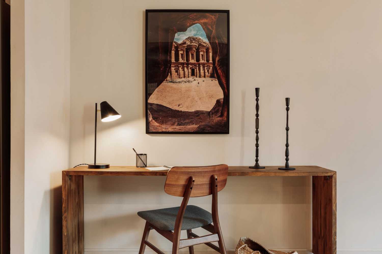 The area comes with a dining table. Next to the fully furnished kitchen, there is the living area fitted with a comfortable L-shaped couch and pouffe. Against the back wall, there is a hand-made desk, crafted by a local artisan, ideal for working from home.