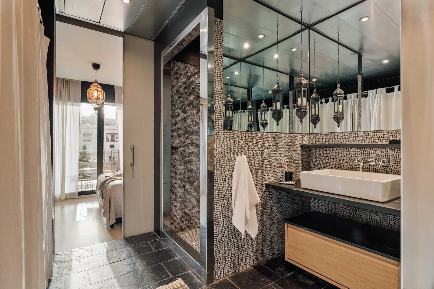 Outside, the spacious terrace is equipped with a lounge area at one end and a table at the other. The terrace is accessible both by the living room and the second bedroom. Both bedrooms are distinctly decorated. The first with it's standout neon structure and the second with it's elaborate hanging lantern and rolling wooden desk.