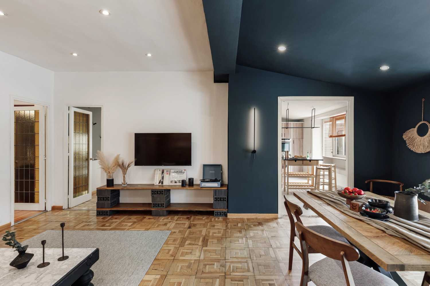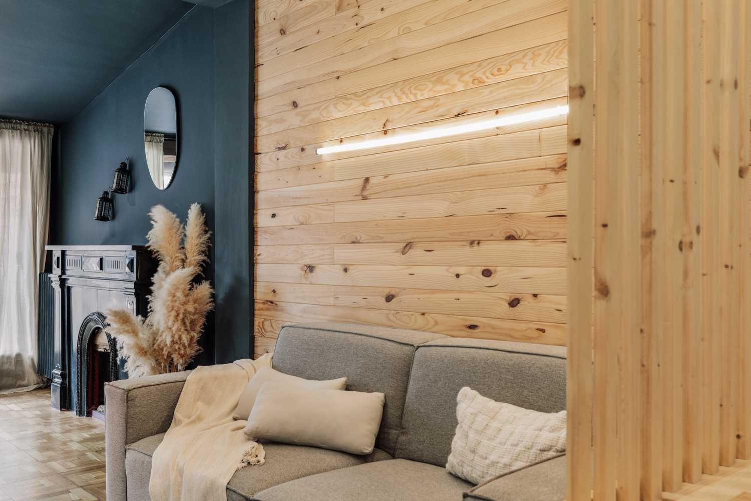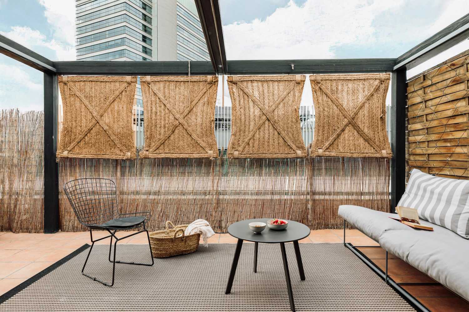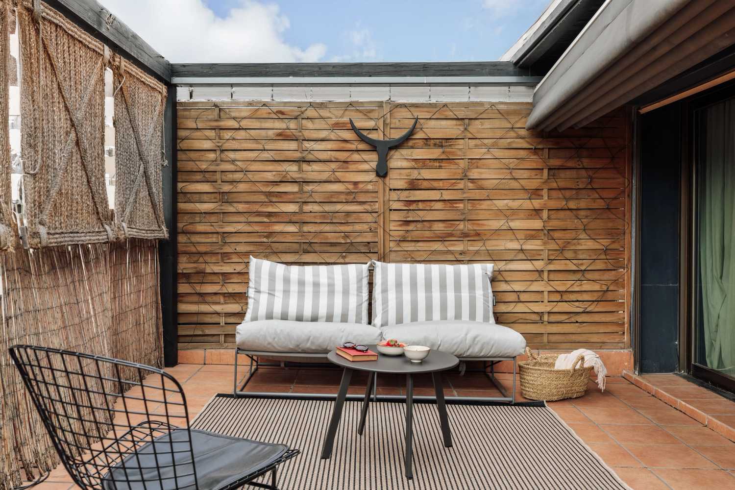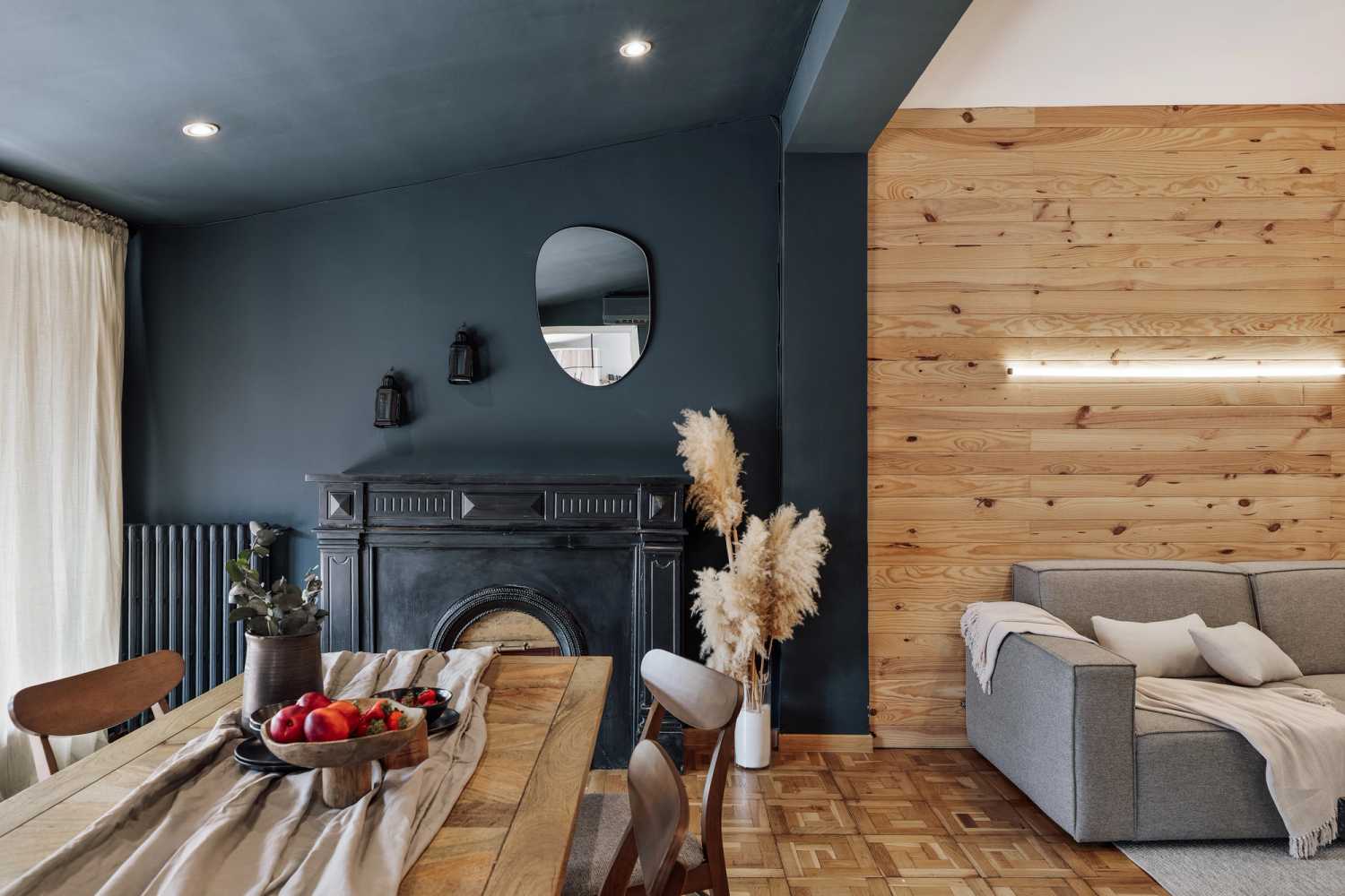 La terraza, de carácter privado, incluye zona de estar y área de comedor, este último con luces colgantes que cruzan por encima. Según entra en el apartamento encontrará el salón, en el que destaca la pared en madera y a medida, junto con la luz de neón sobre el sofá. Adyacente se ubica el comedor, que presume de chimenea tradicional y está equipado con una moderna mesa. El diseño se caracteriza por la interacción de los opuestos: tonos oscuros y decoración en madera clara, plantas secas y sutiles frente a plantas vivas y vibrantes.