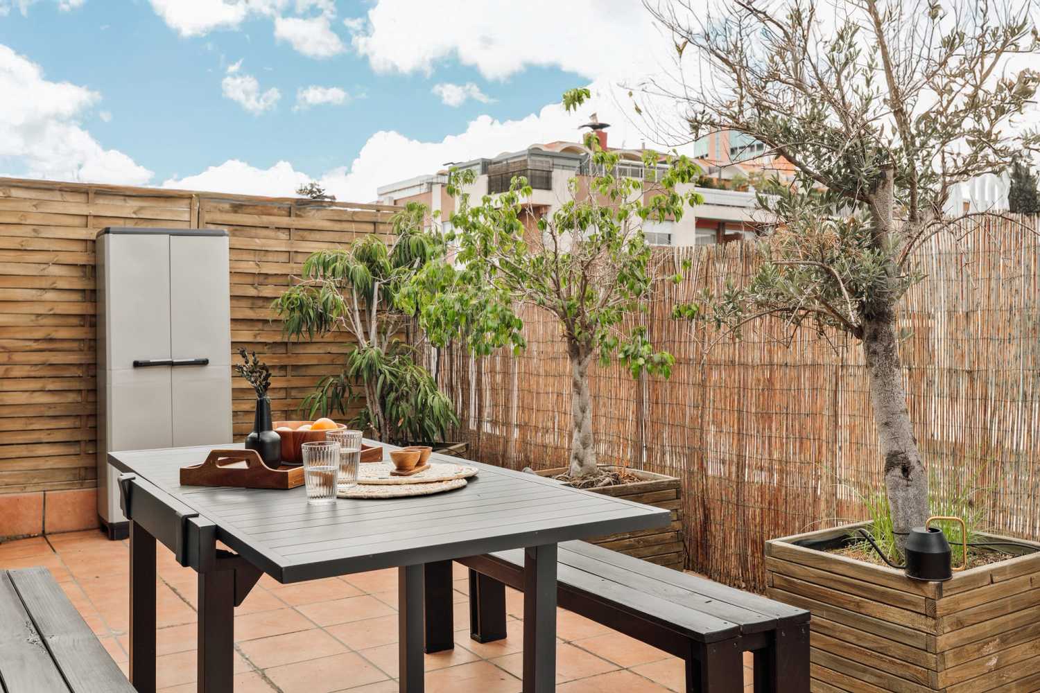 Quemú, amplio y luminoso apartamento de 133 metros cuadrados ubicado en Nova Esquerra de Eixample de Barcelona, incluye dos dormitorios y dos cuartos de baño, además de ofrecer una extensa terraza exterior de 48 metros cuadrados y accesible tanto desde la cocina como desde la zona de estar interior.