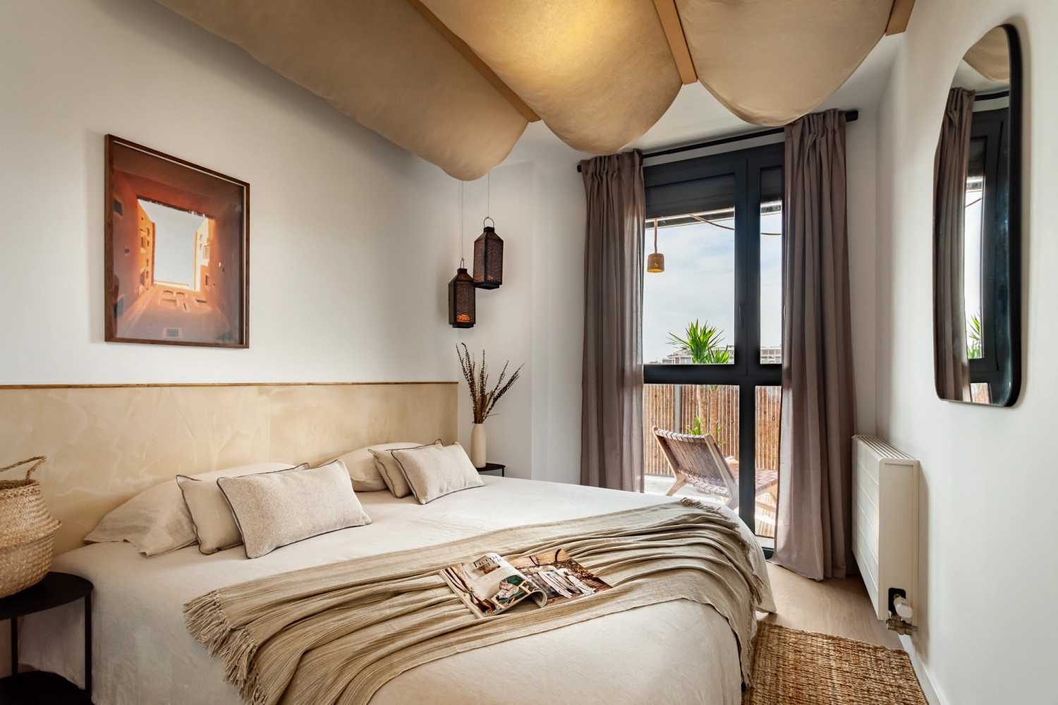 The fully furnished and equipped kitchen, terrace, living, and dining areas are complemented by blankets and lights hanging from the ceiling and uniquely made baskets and side tables, giving a taste of the Saharan desert lifestyle from Spain. Sit down and take a break from the hot Barcelona sun on the terrace, table, couch, or designated working space. As always, this home comes fully furnished with everything you need, including bedding and linens.