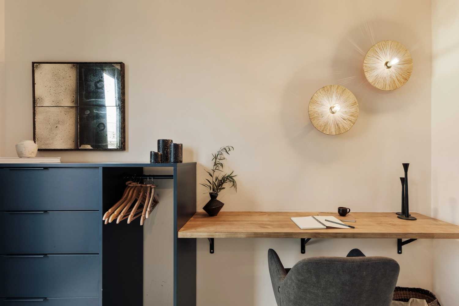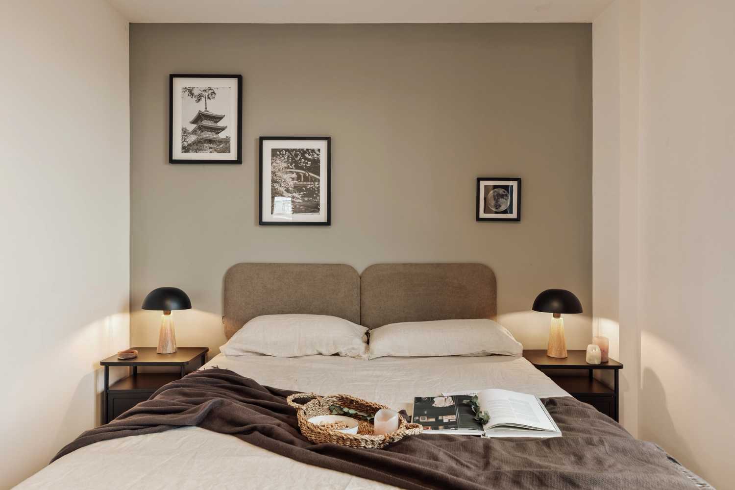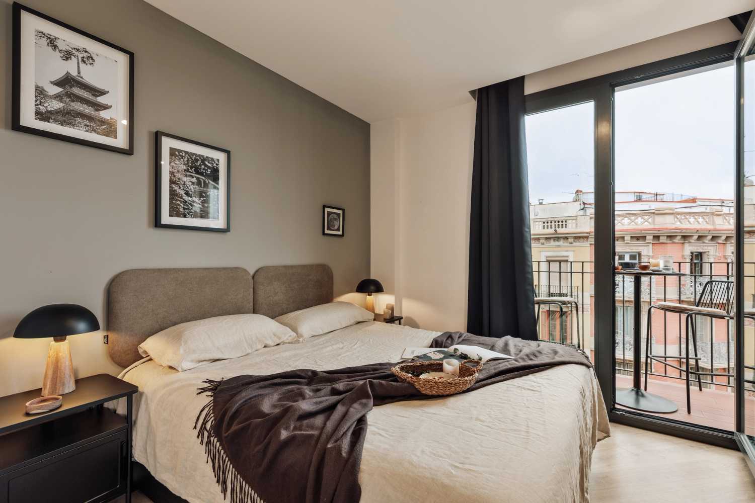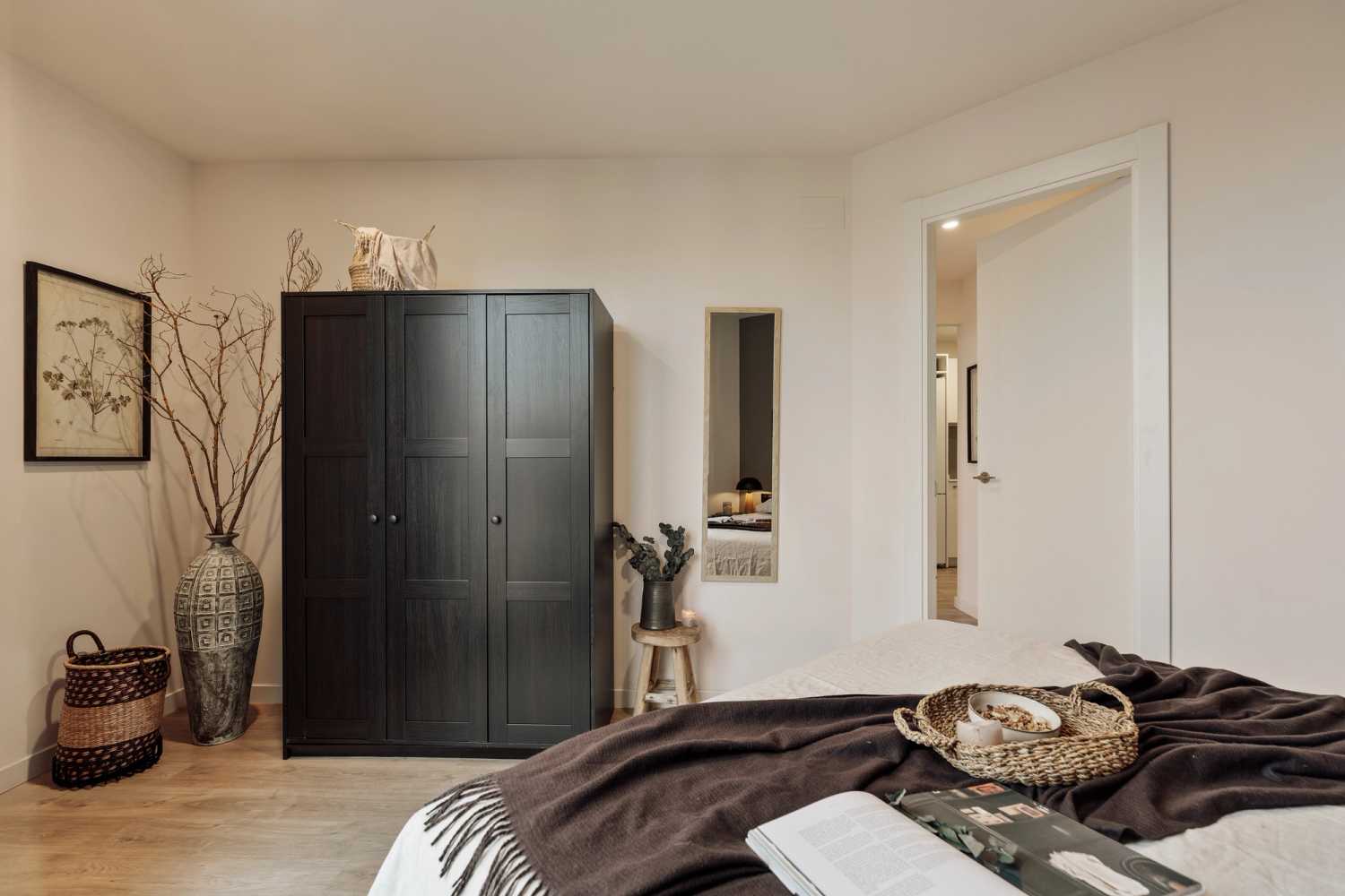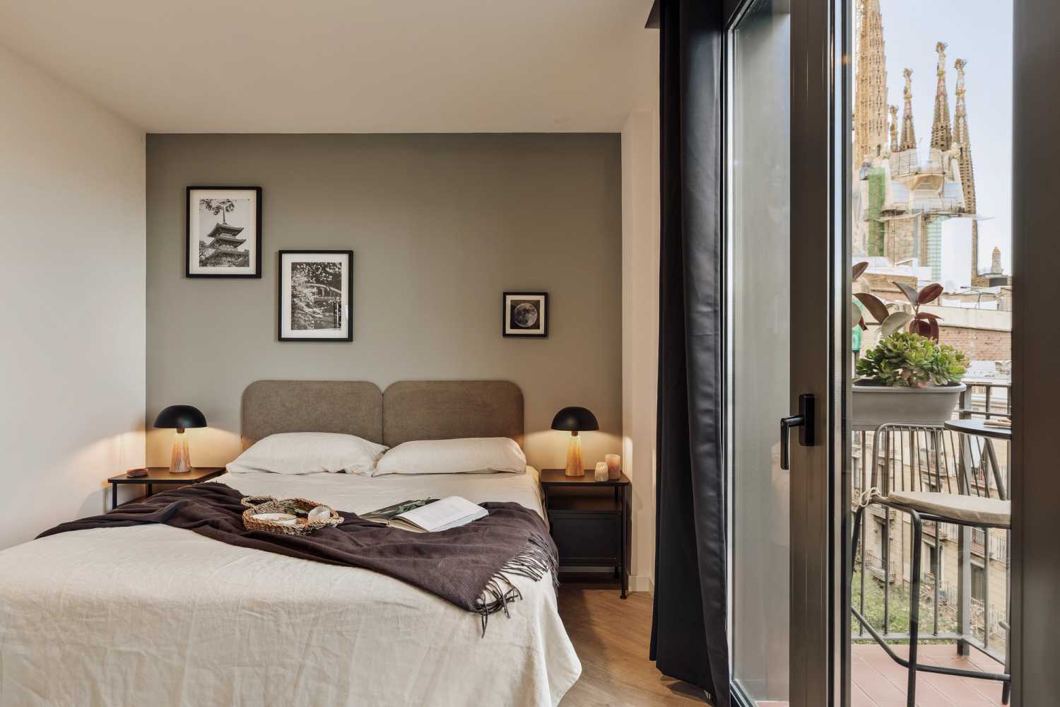 The second room has ample closet space and comes with a pull-out single bed. The main bedroom comes with a queen sized bed, decorated with a mix of dried and living plants. The terrace, from which one can see the Sagrada Família, is fitted with a table and two chairs, ideal to enjoy a drink.