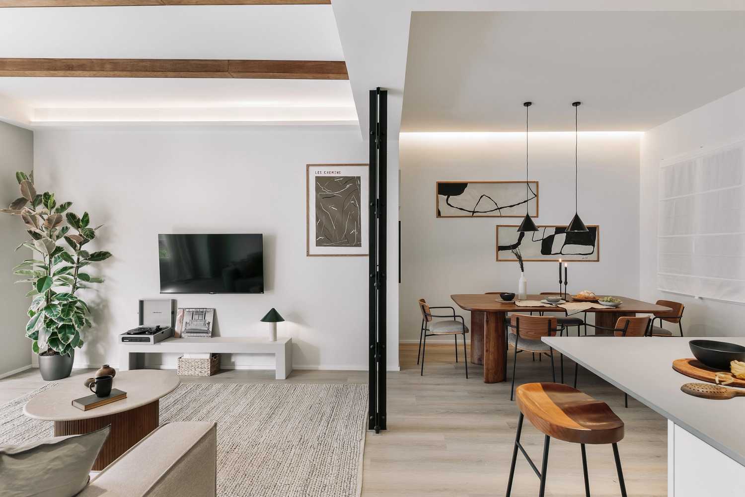 The open-plan living room and kitchen create a seamless flow. Immerse yourself in the beach-inspired ambiance, characterized by coastal neutrals and accents of light wooden fixtures that infuse the space with a sense of serenity and comfort. Unwind in the living room, complete with an entertainment system. Indulge in the culinary arts in the fully equipped kitchen, featuring a dining table and countertop seating, making meal preparation and shared dining experiences easy.