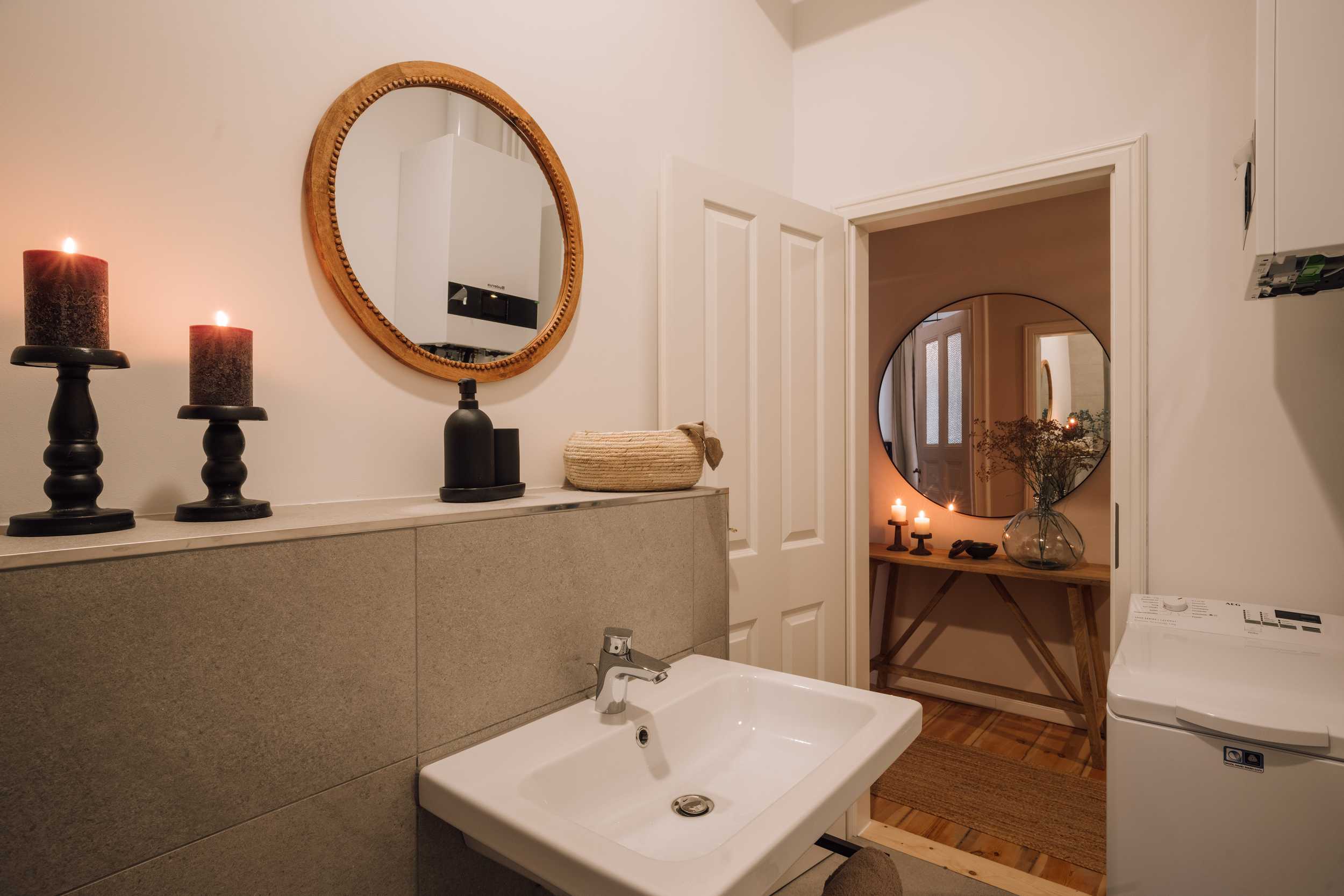 The apartment features 2 bedrooms, both are spacious and fully furnished with queen sized beds. The first bedroom has a dedicated workstation for remote working and access to a small balcony fit with a two person table top. The second bedroom is warm and cozy with a woven grass lighting feature. The bathroom is stylishly decorated, with modern fittings.