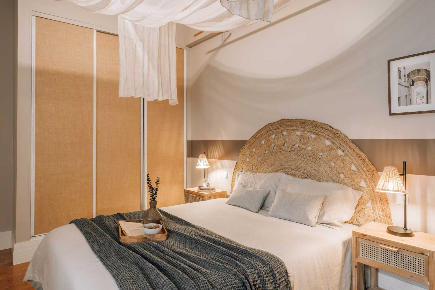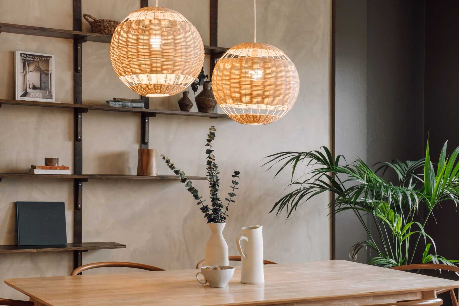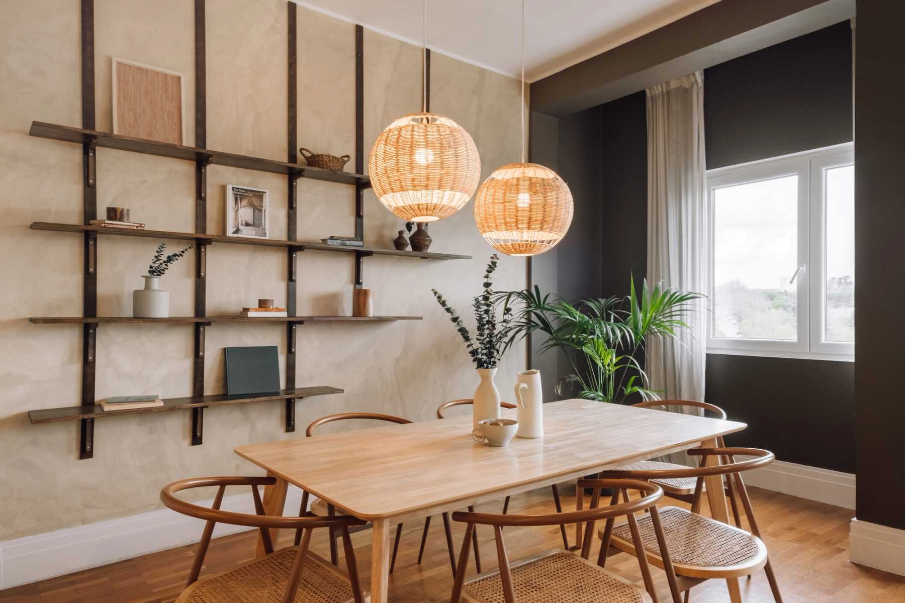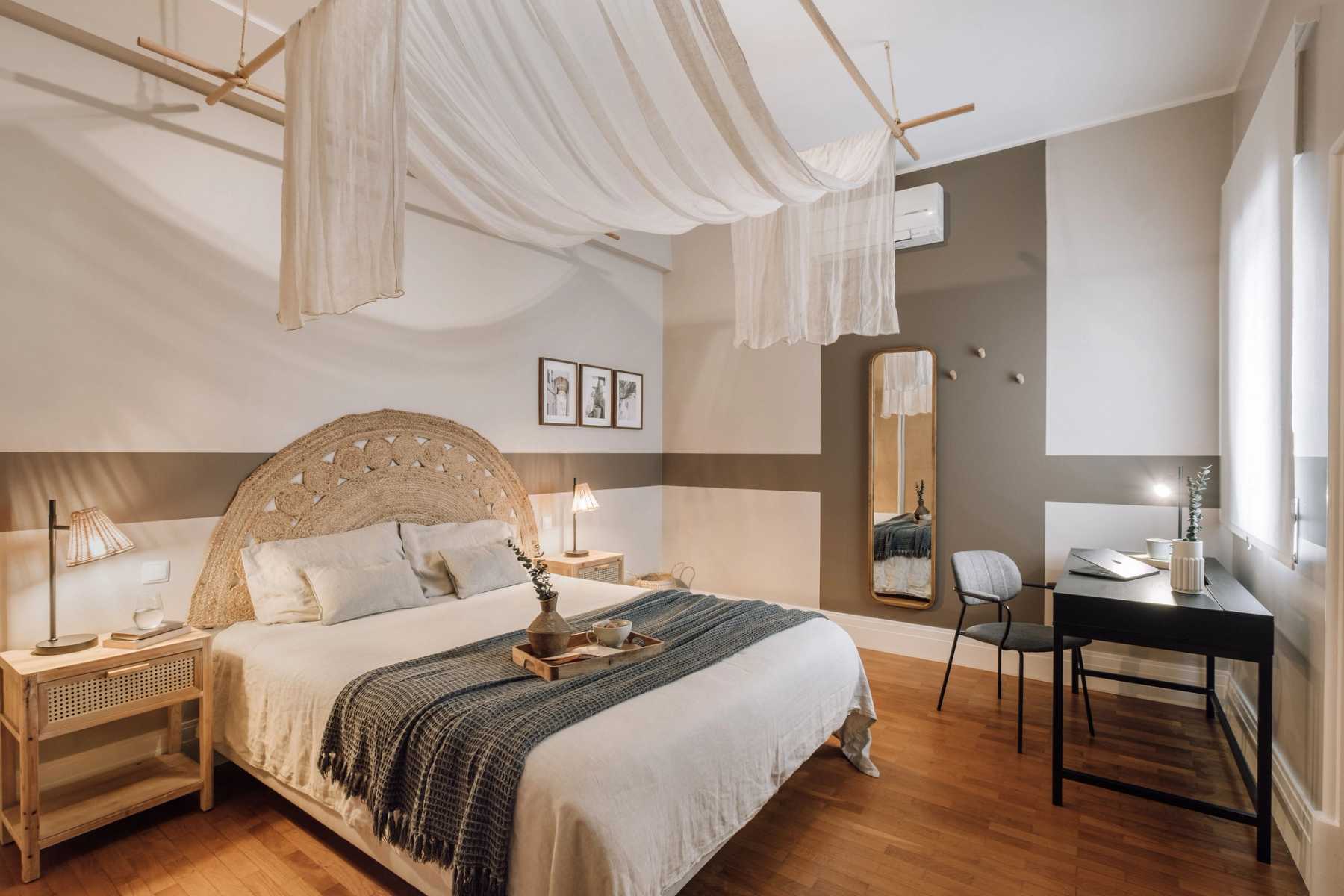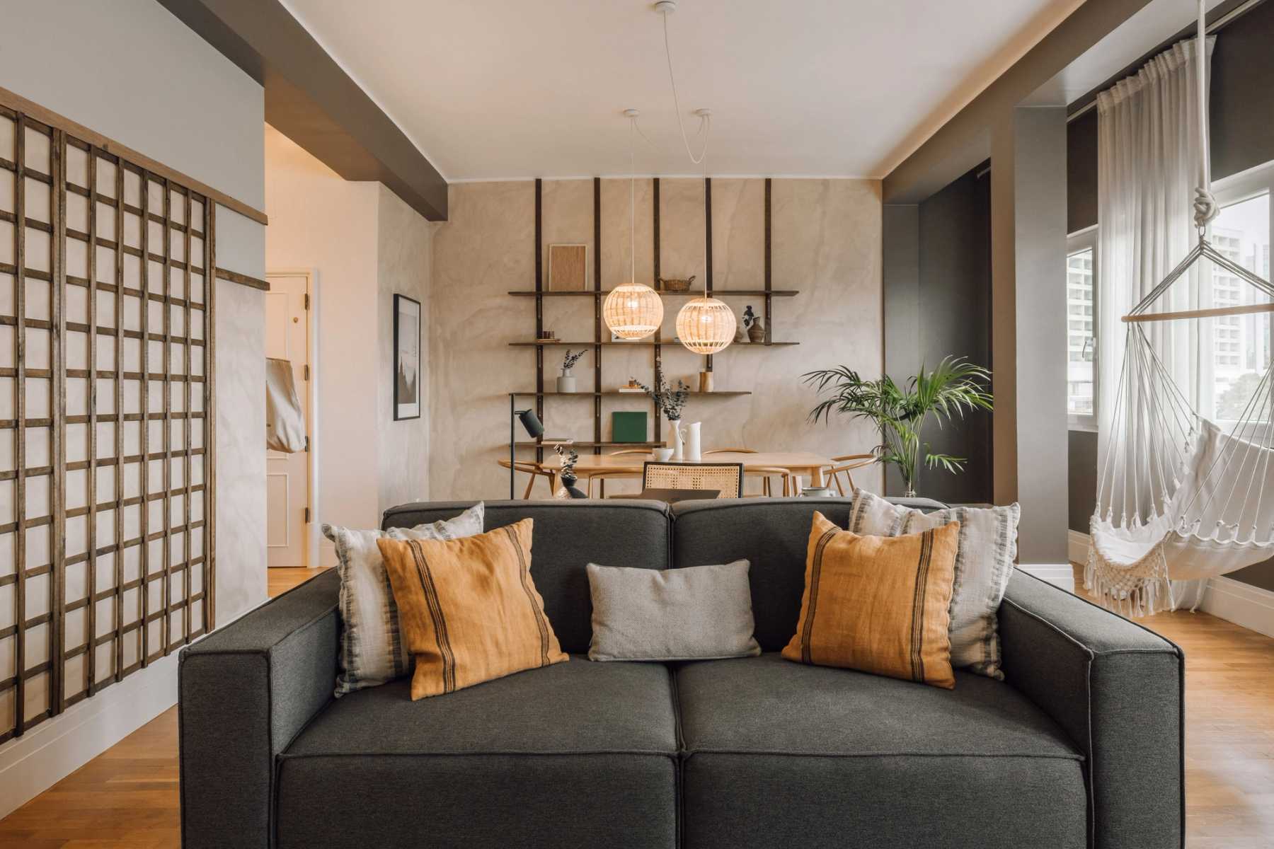 Once through the entryway, guests are greeted with calming, earthy tones and touches of greenery. To the left, is the open-concept dining and living area. Natural light floods the room as large, bay windows line the far wall. The dining area is perfectly suited for a dinner party with a six-person handcrafted table and lantern-style soft lighting. The middle of the room offers a pause for relaxation with a hanging hammock chair, dressed in macrame detailing. The living room offers various seating options and an eye-catching wall hanging made of braided natural fibers.
