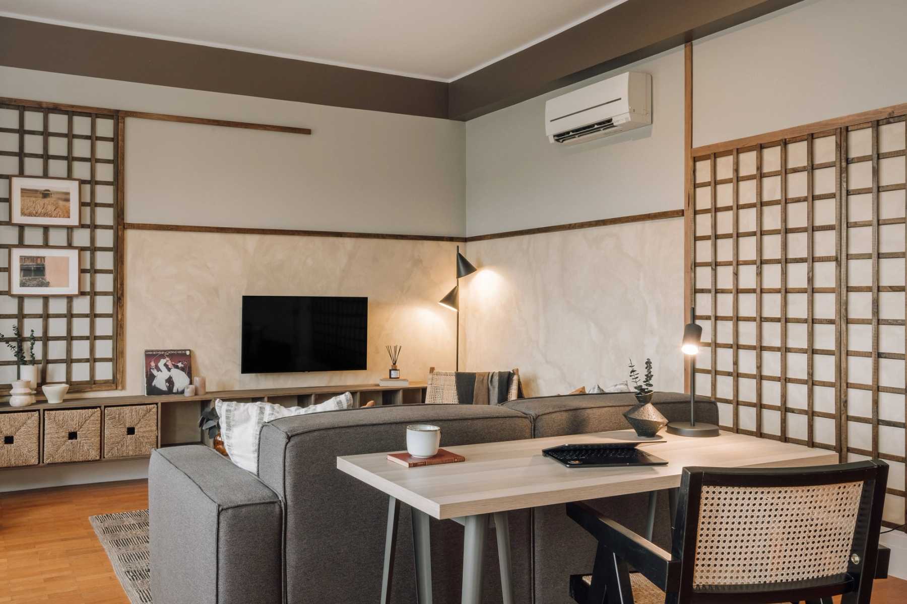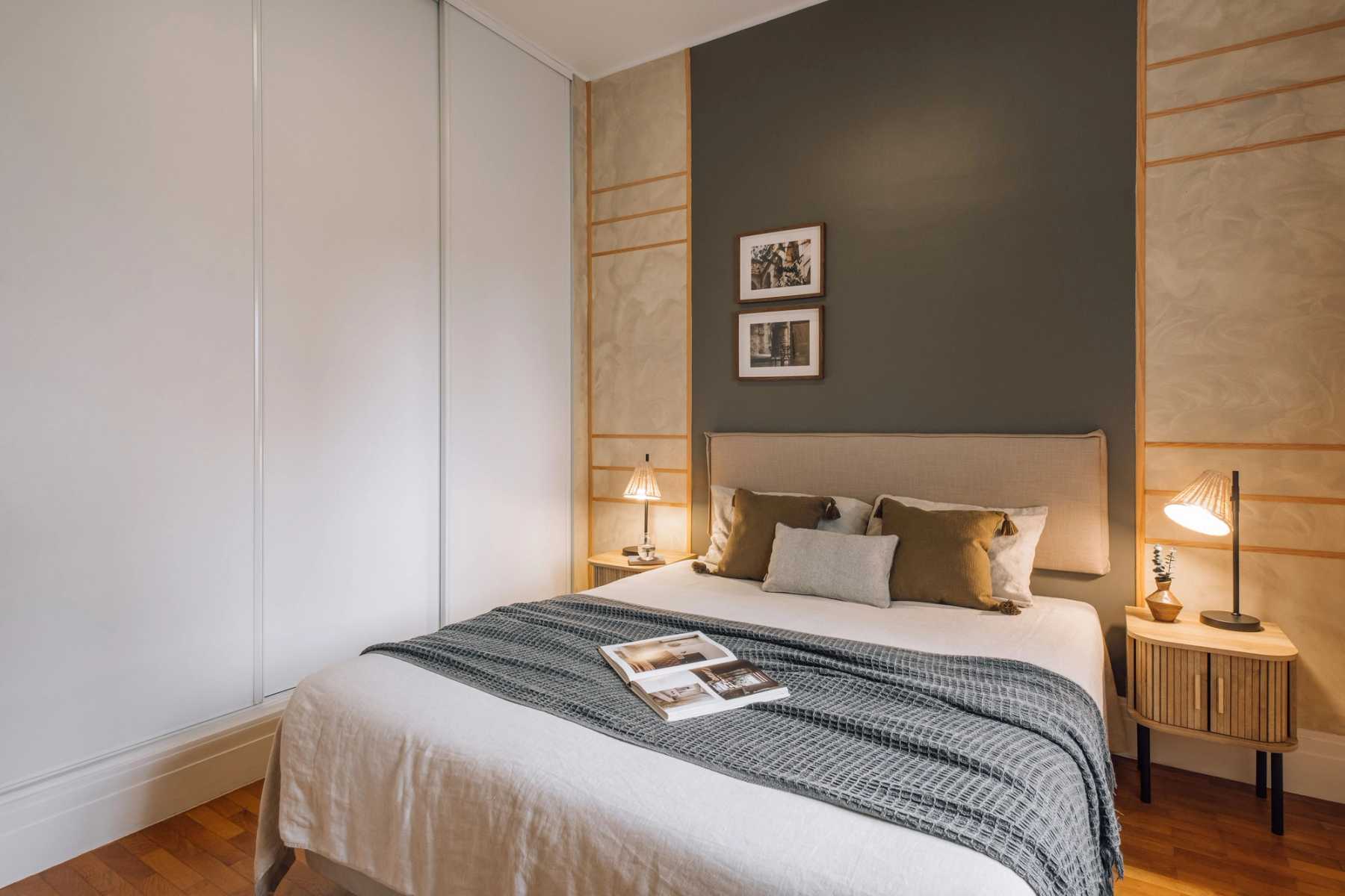 Continue down the hallway, lined with art representing Southeast Asian landscapes, to find the second bedroom to the left. The second bedroom plays with texture, as demonstrated by the bamboo-picketed accent wall and fibrous headboard that frames the queen-sized bed. Large windows line the far side of the room while built-in closets complete the other side of the space.