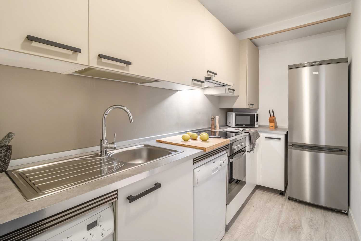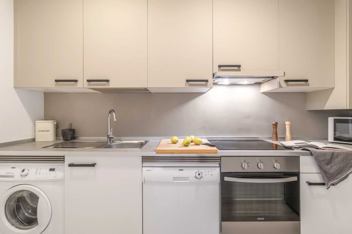 Kita is an 85 square meters, 1 bedroom, 1 bath apartment in Madrid's Justicia neighborhood. The minimalist design is unique in its use of dried plants throughout the space. Enter Kita and find the kitchen which is fully equipped with all cooking appliances and utensils.