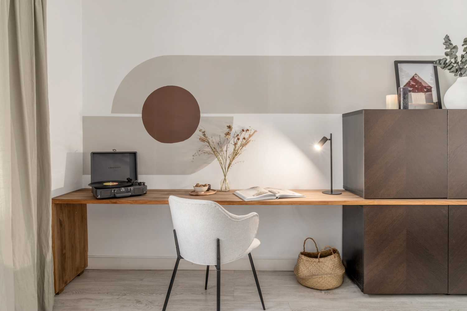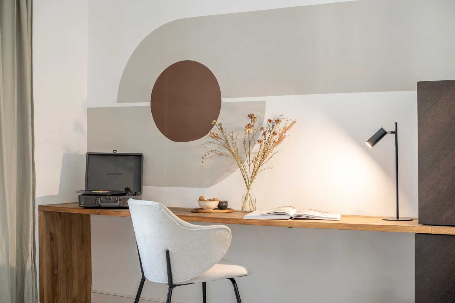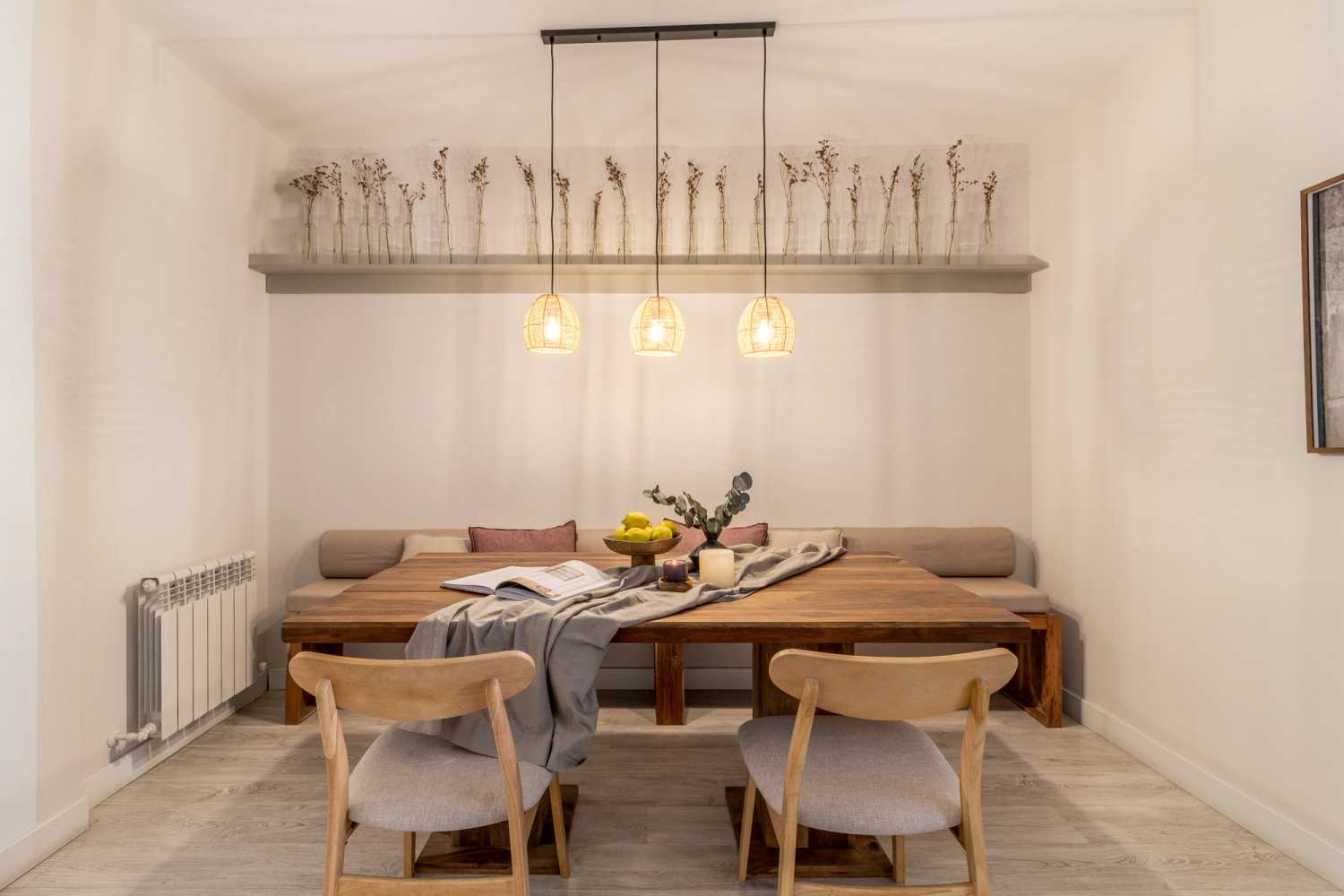 The area before the living room is fitted with a bench and large wood dining table. The living room, which looks onto the streets of Madrid, has a lounge area with a comfortable couch and ample storage space. The dedicated work area has a custom built desk lining the entire wall.