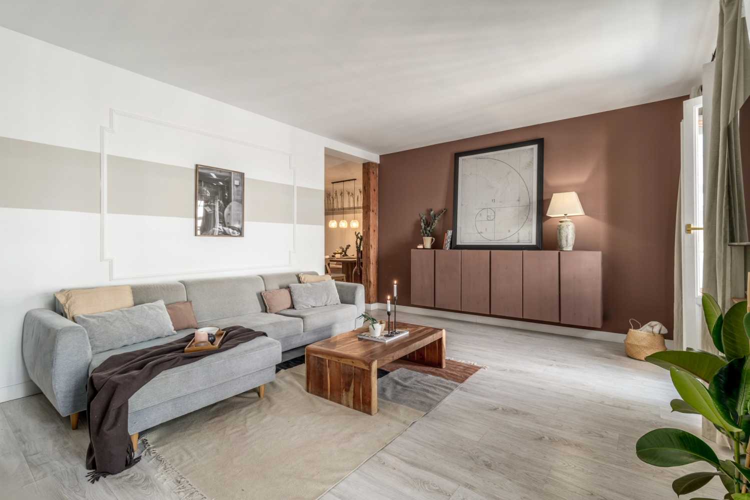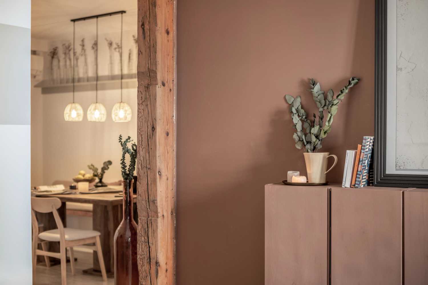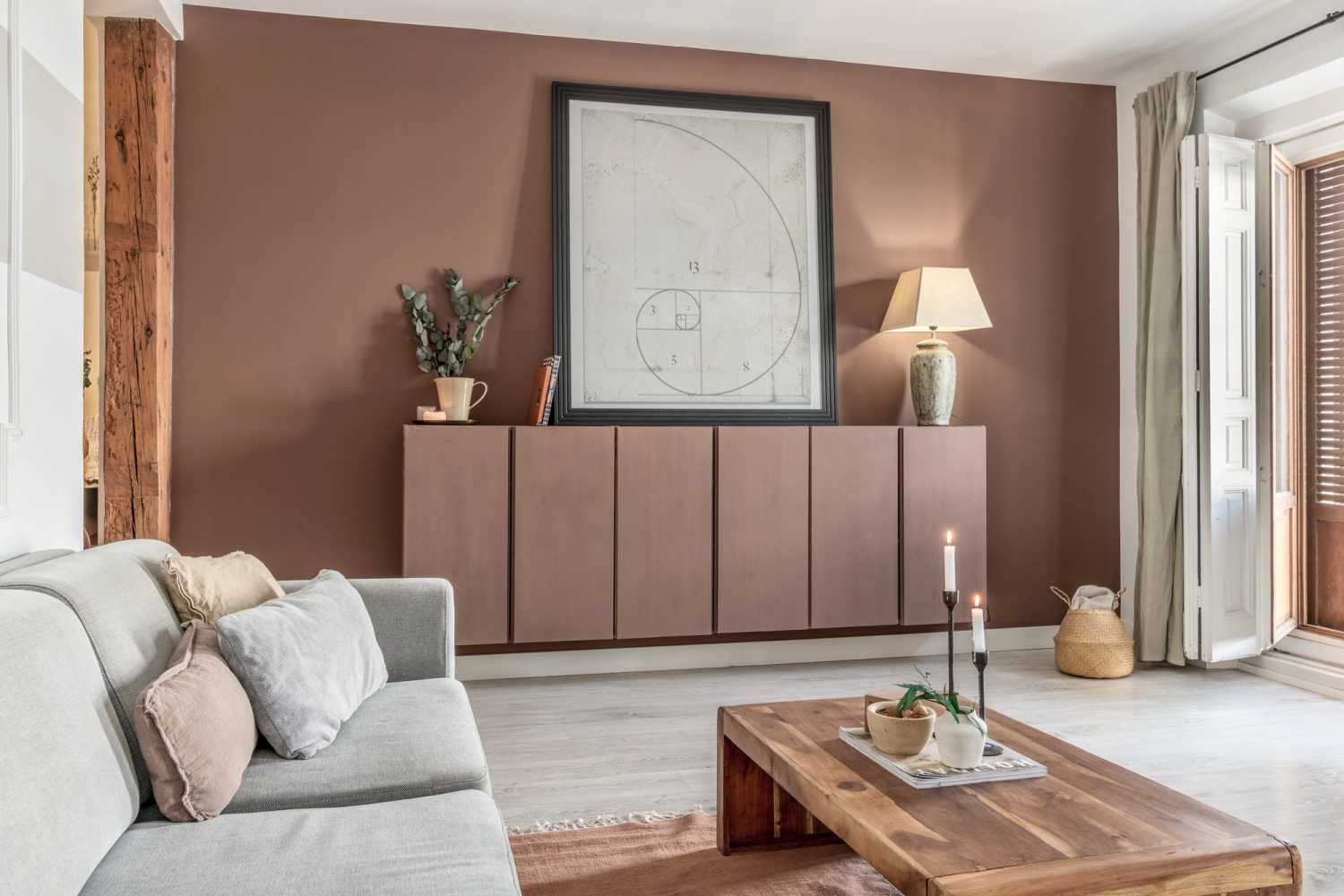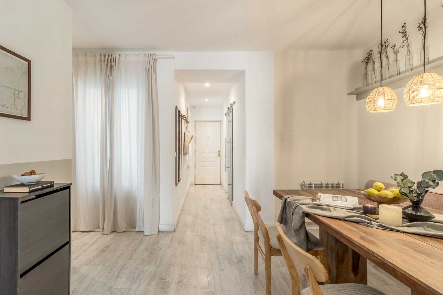 The area before the living room is fitted with a bench and large wood dining table. The living room, which looks onto the streets of Madrid, has a lounge area with a comfortable couch and ample storage space. The dedicated work area has a custom built desk lining the entire wall.