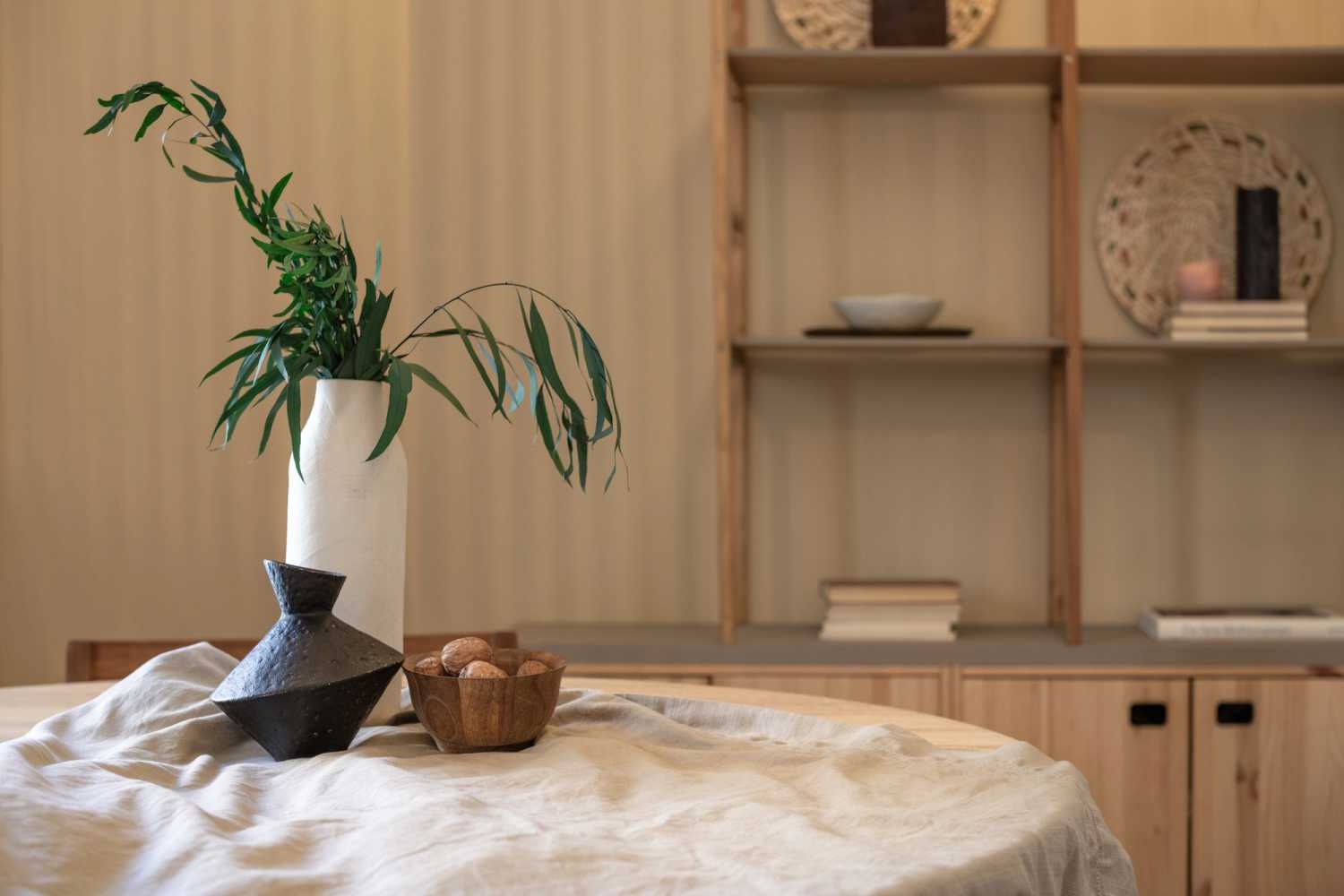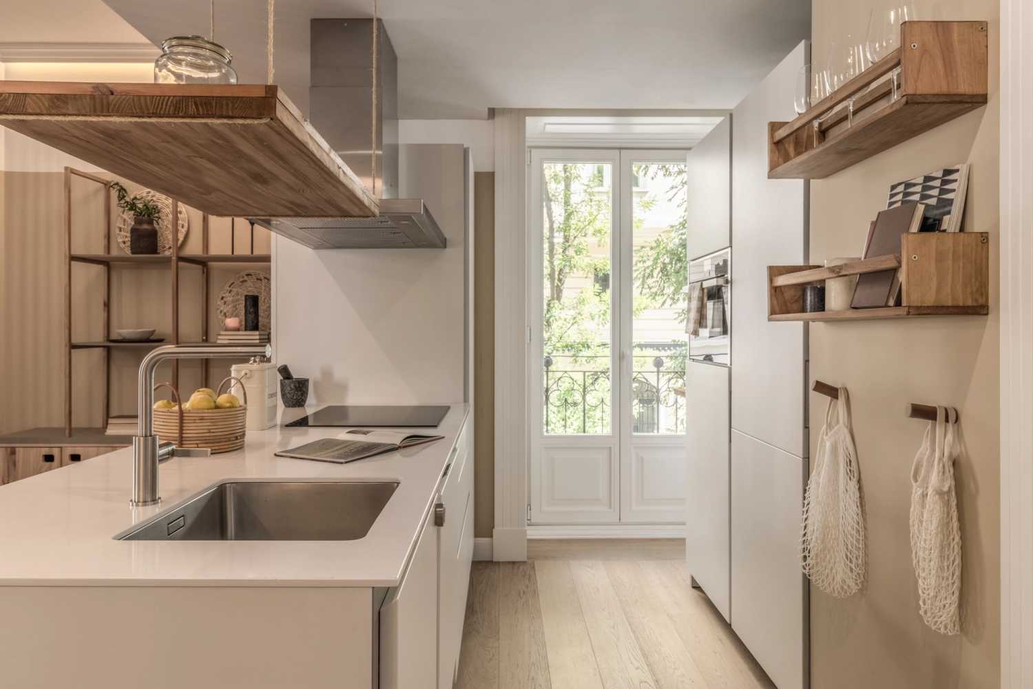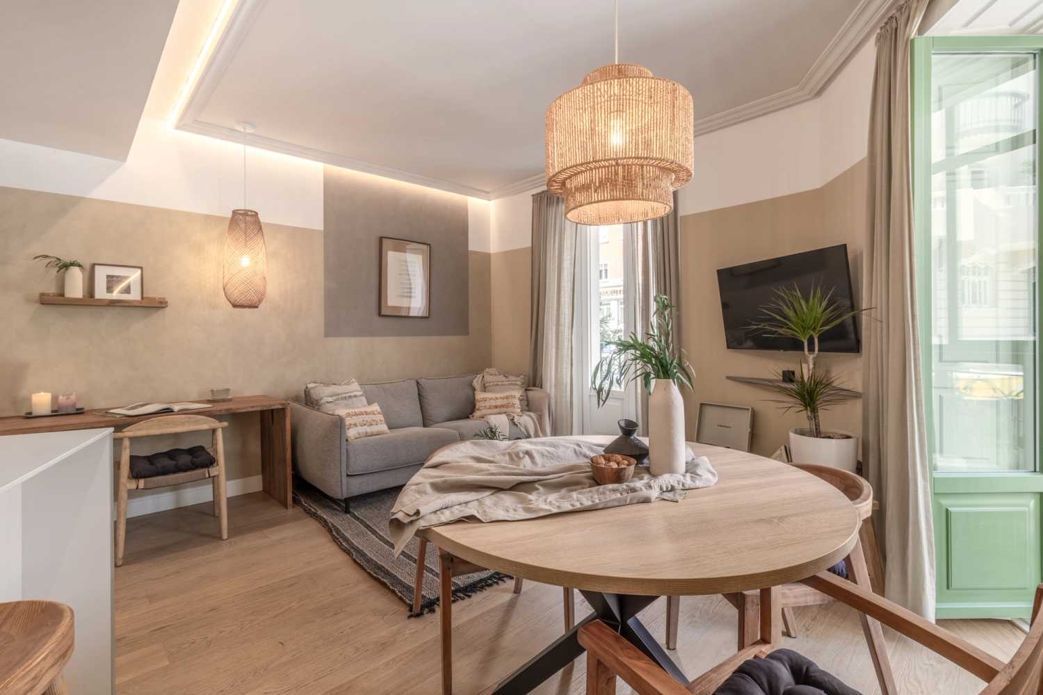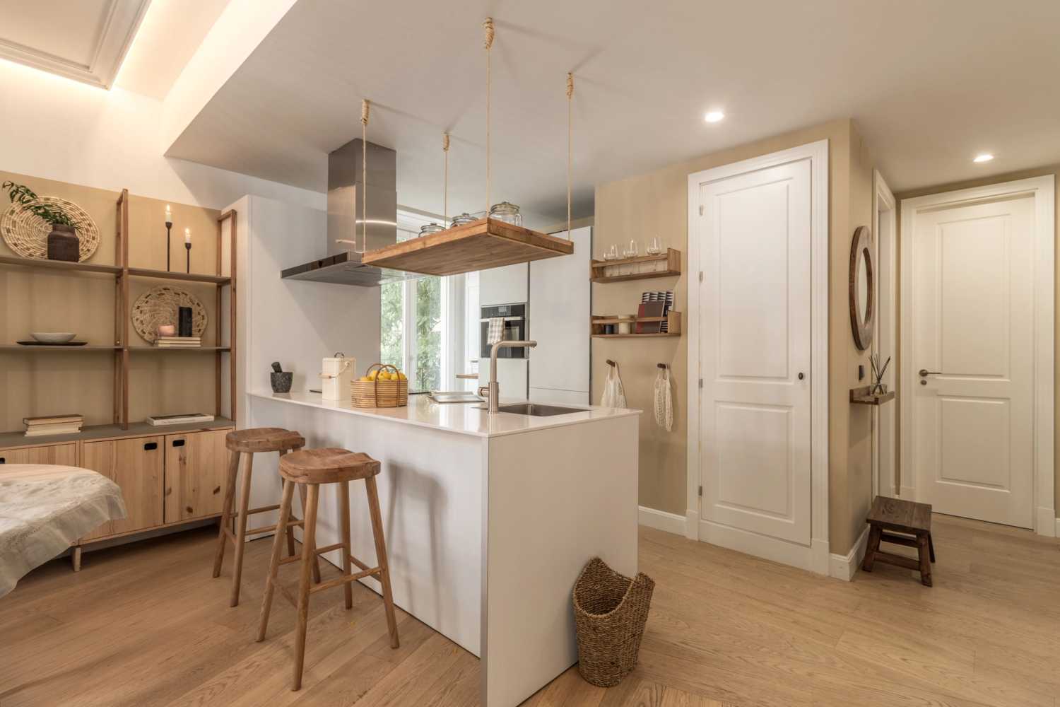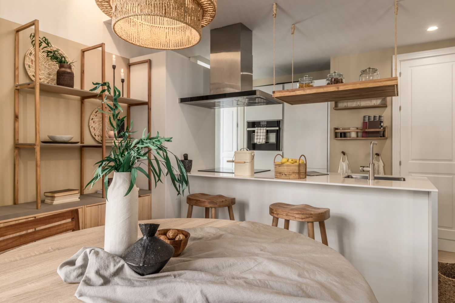 Superada la entrada del apartamento se sitúa la cocina, dispuesta en planta abierta con el salón y amueblada e integralmente equipada con utensilios de cocina para disfrutar del desayuno u organizar una cena. La isla de la cocina dispone de un estante colgante y en madera, el cual sirve como almacenamiento adicional. El salón está conformado por la zona de estar, una mesa de comedor circular y un espacio de trabajo dedicado que resulta ideal para desarrollar el trabajo desde casa.