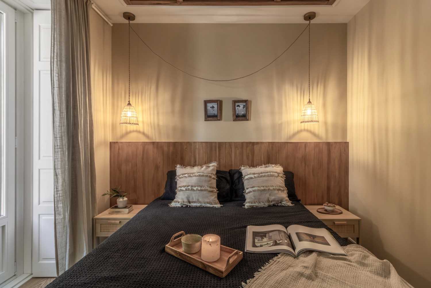Según ingresa en él, encontrará un dormitorio a su derecha, con acceso a un balcón privado, cama de matrimonio y un cabecero en madera único que complementa el revestimiento de bambú realizado a medida para el techo. Contiguamente se ubica el cuarto de baño, equipado con ducha y ofreciendo un diseño continuista en base al mencionado revestimiento, en esto caso en la pared.