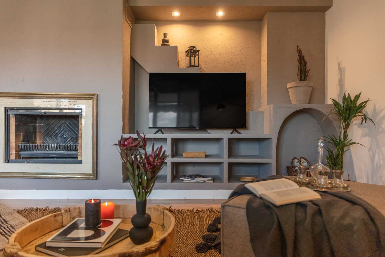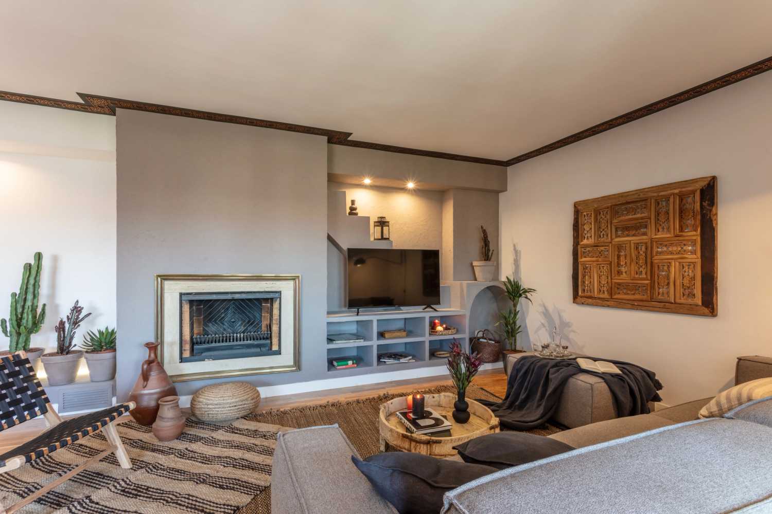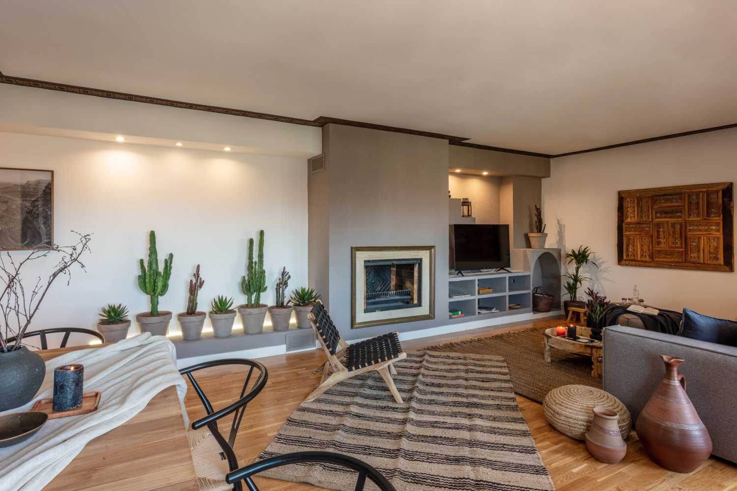 Más adelante en el pasillo y pasando las estanterías empotradas de la derecha, se descubre el salón a la izquierda. Una estantería flotante retroiluminada con un jardín de cactus destaca la inspiración desértica de Wukro. El salón es acogedor en todos los sentidos, con su mobiliario de diseño, su luz natural y su chimenea tradicional. A la derecha del espacio se encuentra el comedor para siete personas. Más allá del comedor hay una estación de trabajo con vistas al horizonte de la ciudad de Madrid.