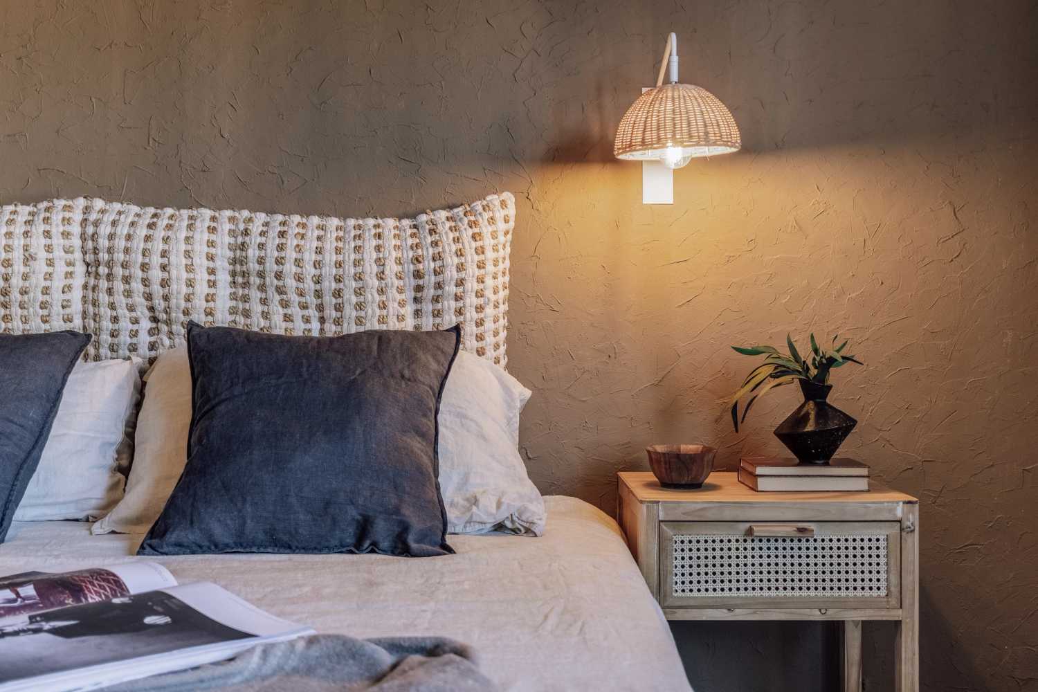 Al otro lado del pasillo está el primer dormitorio de Wukro. Un dosel drapeado y de ensueño cuelga del techo sobre la cama de matrimonio. A la izquierda hay un espacio de almacenamiento con textura de estuco.