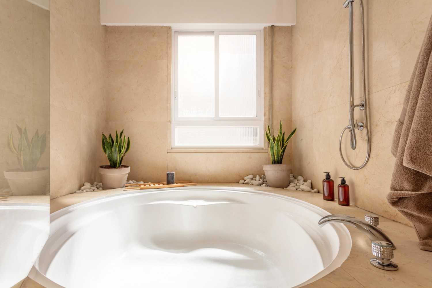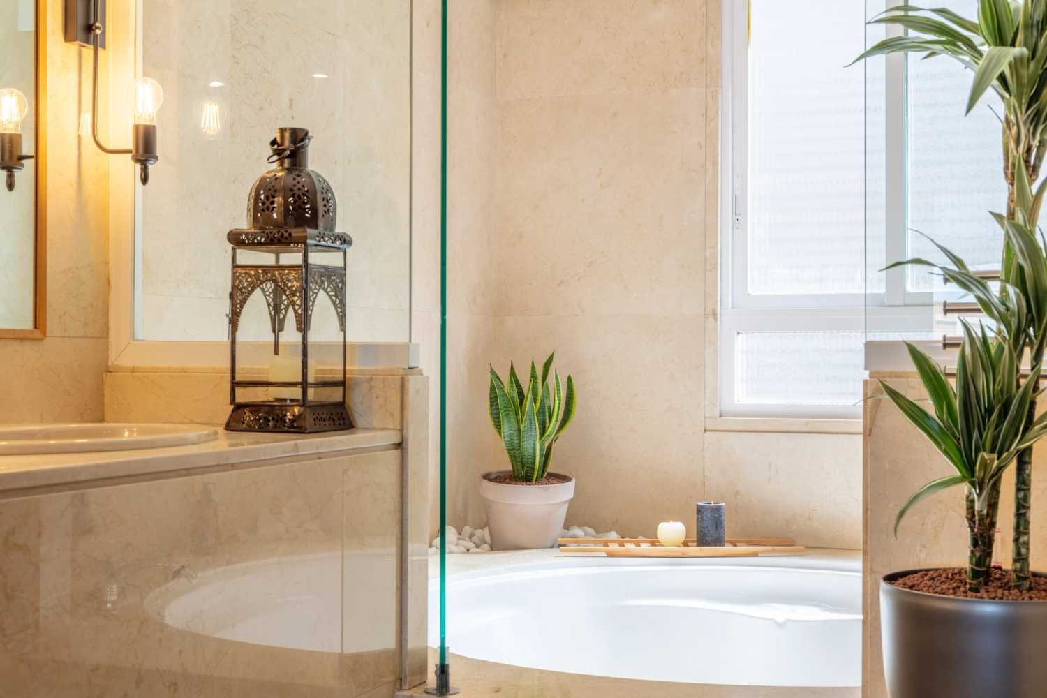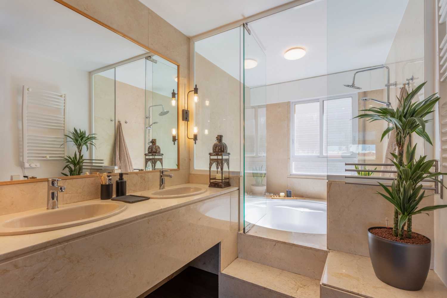 Al final del pasillo se encuentra el dormitorio principal con baño. Pasando un separador de pared tallado en celosía, los huéspedes encontrarán el espacio del dormitorio a la izquierda. La cama de matrimonio, revestida de tejidos orgánicos, se encuentra en el centro, con un espacio de almacenamiento con espejos a la izquierda. Al otro lado del dormitorio, los huéspedes se sentirán transportados a un spa. Una bañera de hidromasaje se encuentra directamente, con un tocador doble adyacente.
