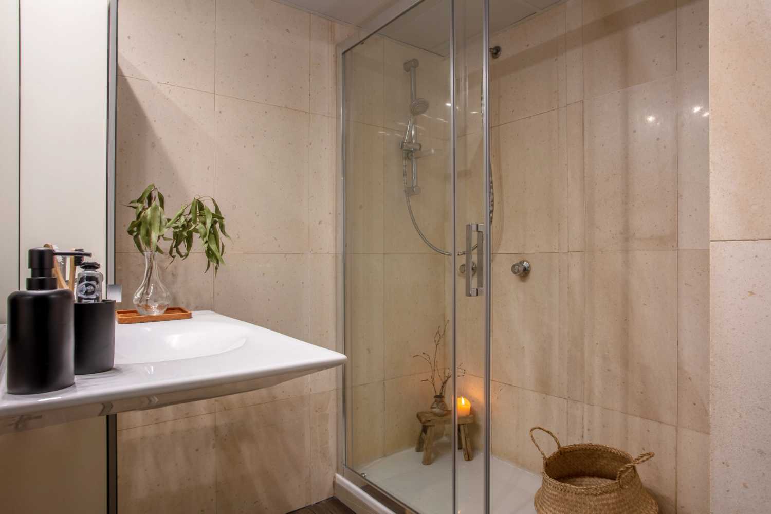 De vuelta al pasillo principal y virando a la derecha, quedan los dos dormitorios y los baños. A la derecha está el baño independiente. Los tonos terrosos se combinan con la ducha tipo spa.
