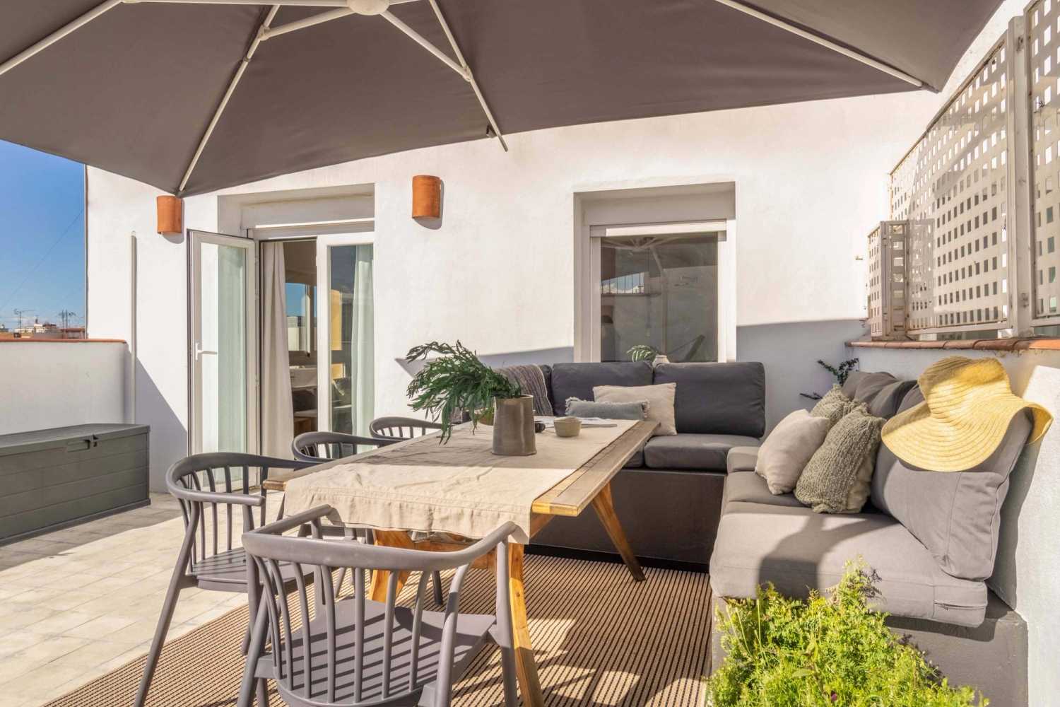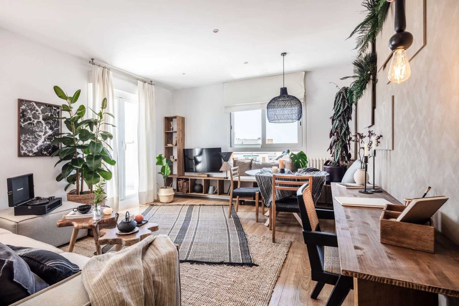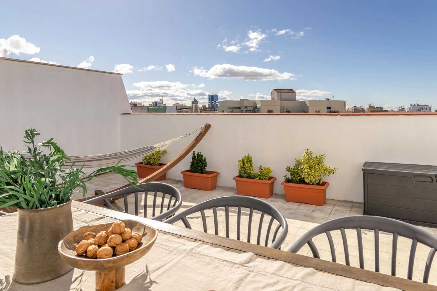 This apartment includes 2 double bedrooms, 2 bathrooms, a terrace, a fully equipped kitchen, and a designated work area. Lounge in the comforting yet maximalist living room, or take a breath of fresh air on the shaded terrace, complete with a hammock and a full outdoor dining table.