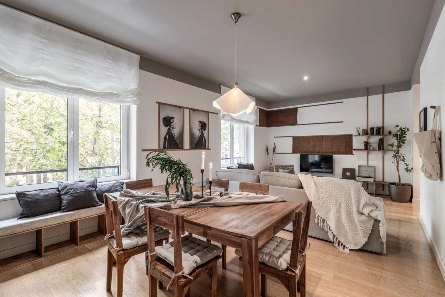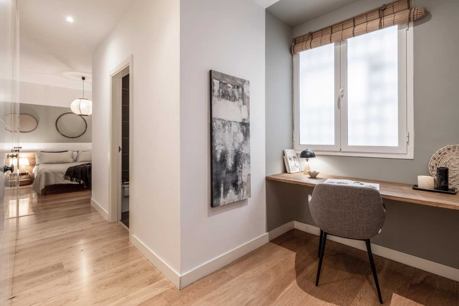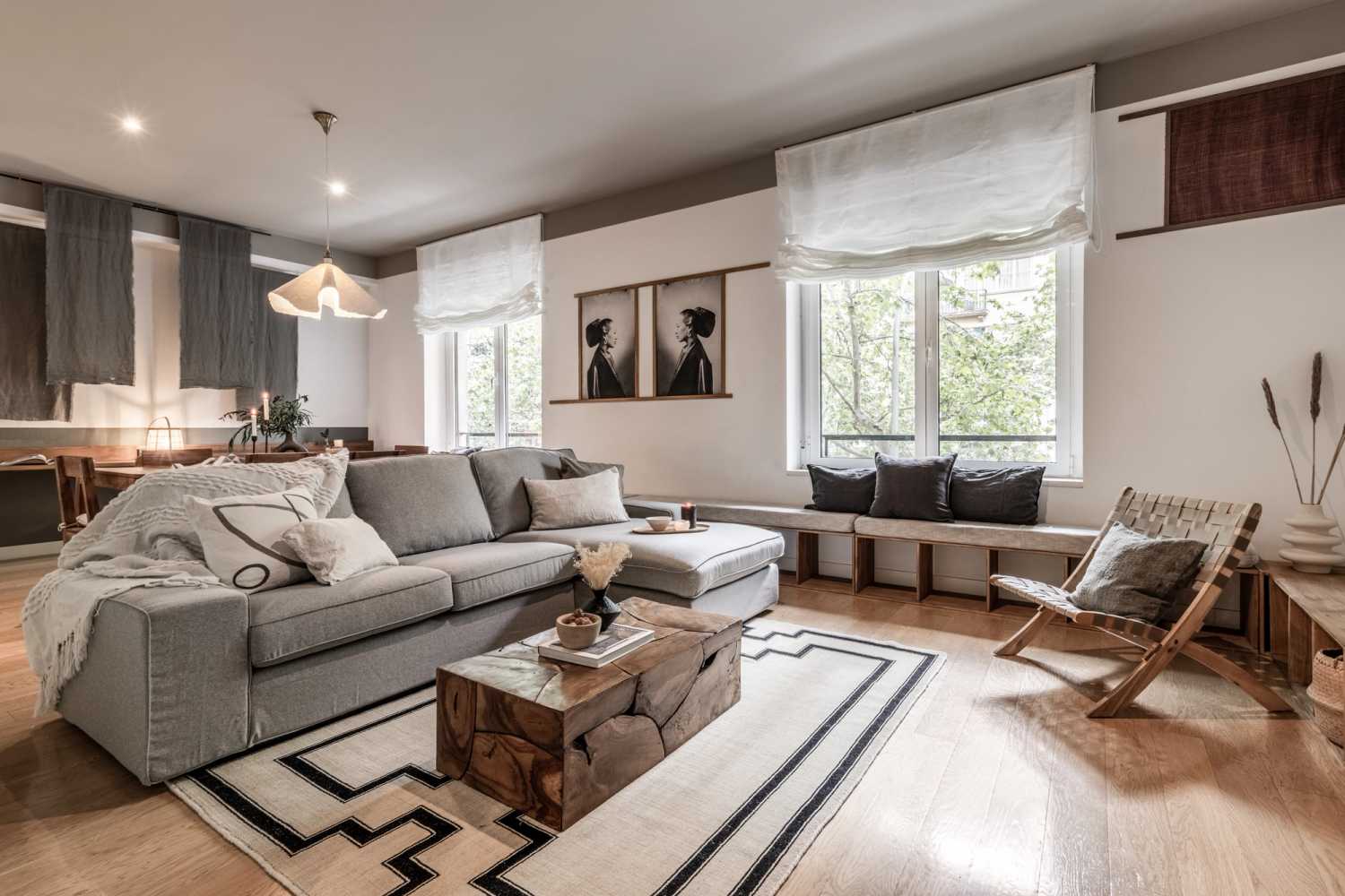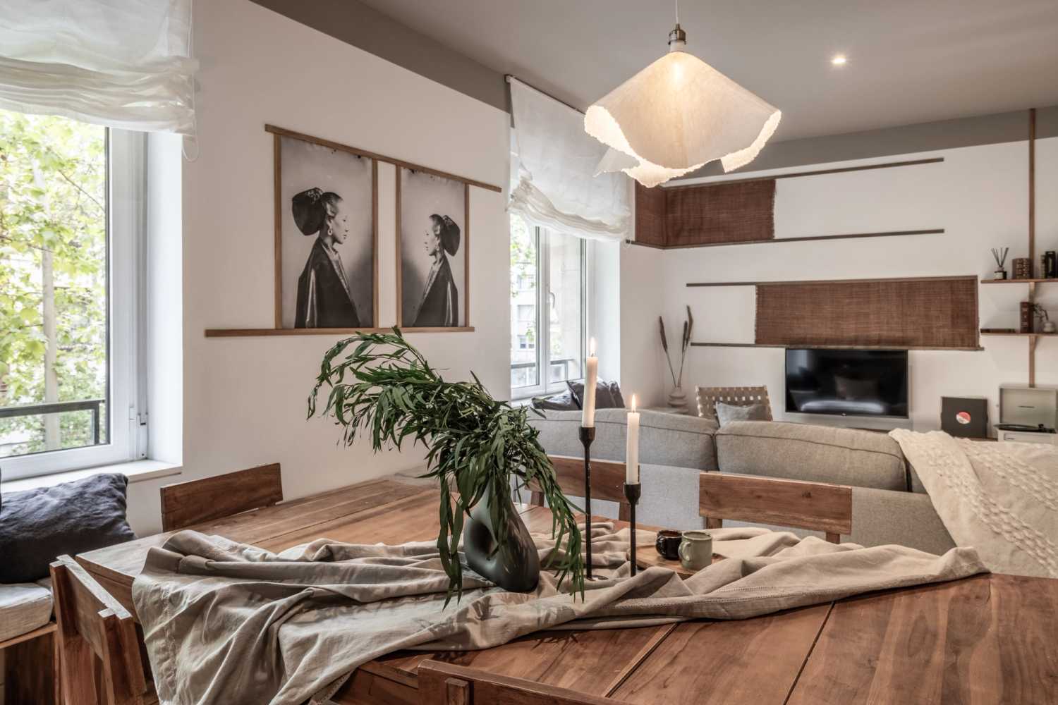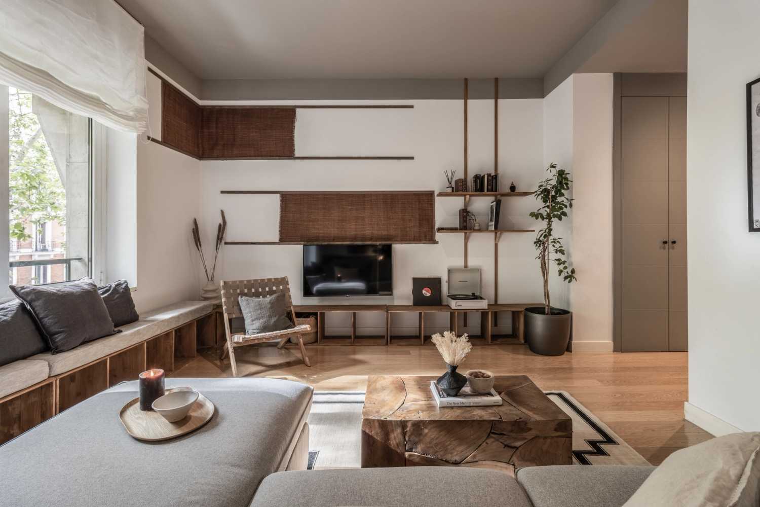 Combining minimalist design with Japanese influence, Senjo is a spacious 140 square meter apartment with 3 bedrooms and 2 baths. The entrance is lined with closets opposite a large round mirror. The living room disposes of three distinct areas.