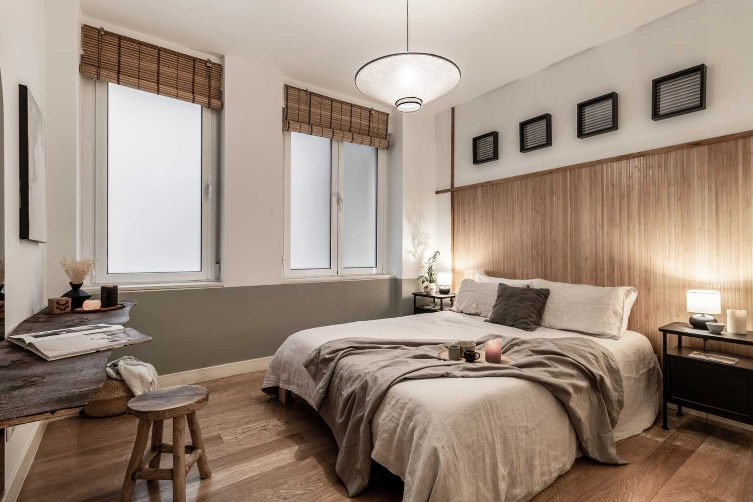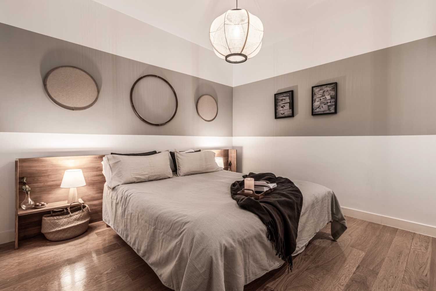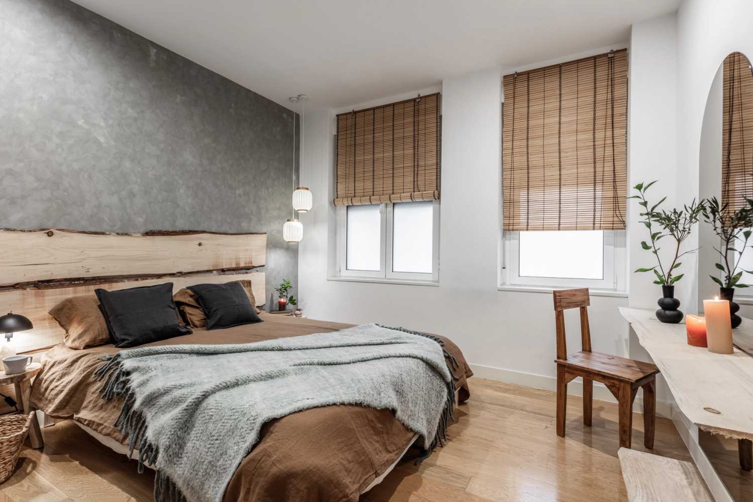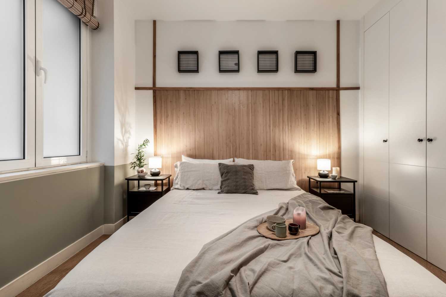 Each of the three bedrooms plays on a similar minimalist design, using different color palettes and unique decor. The largest bedroom has a low tatami-style bed and a handmade vanity-style bar.