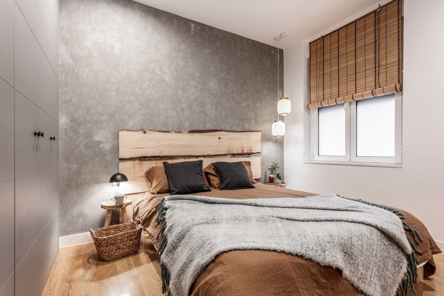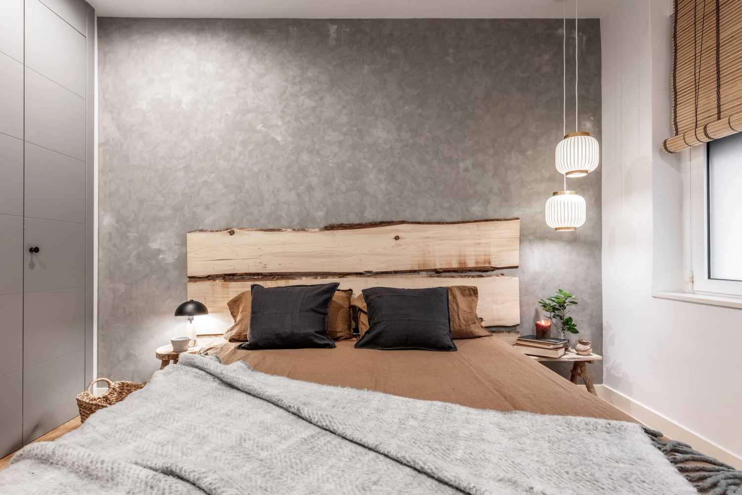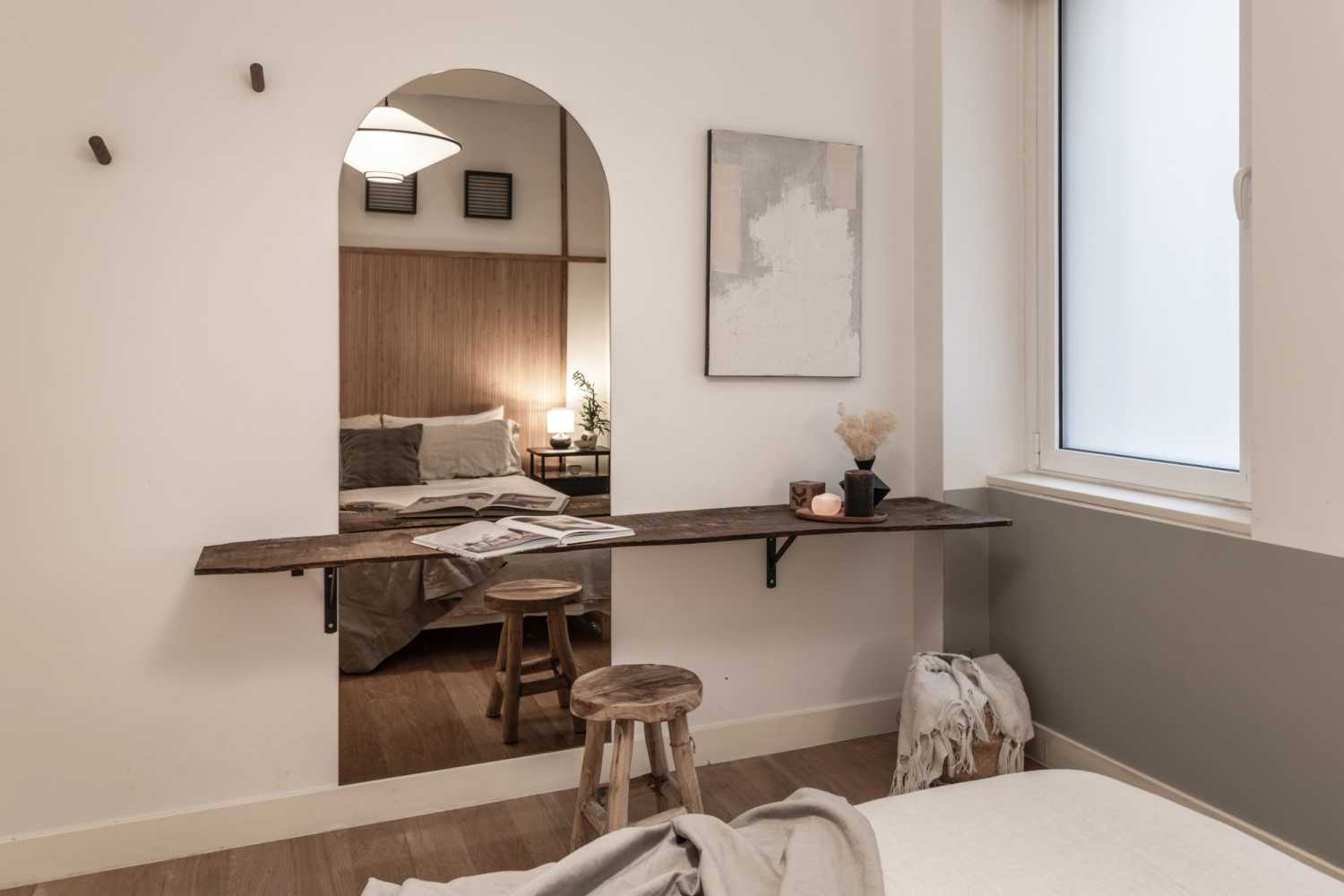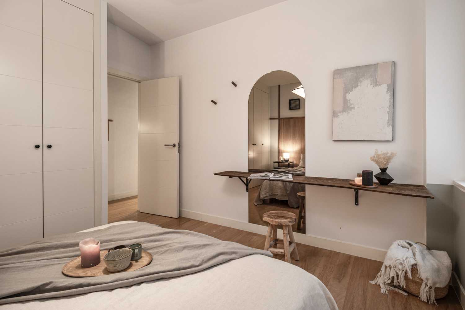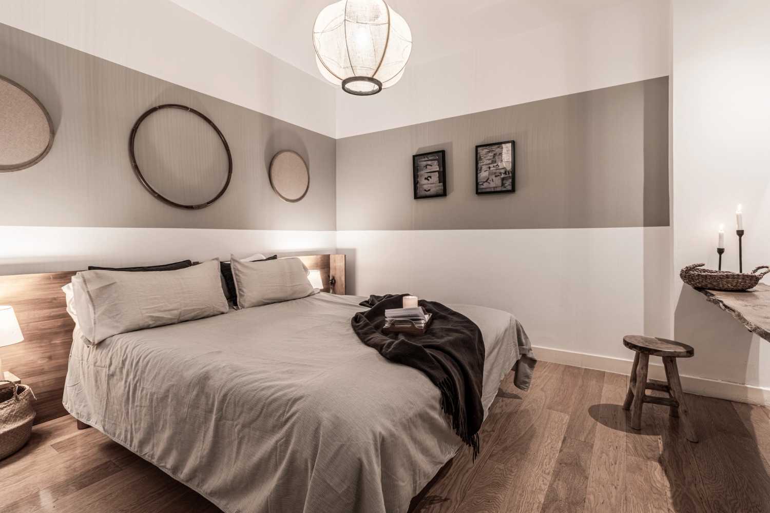 Each of the three bedrooms plays on a similar minimalist design, using different color palettes and unique decor. The largest bedroom has a low tatami-style bed and a handmade vanity-style bar.