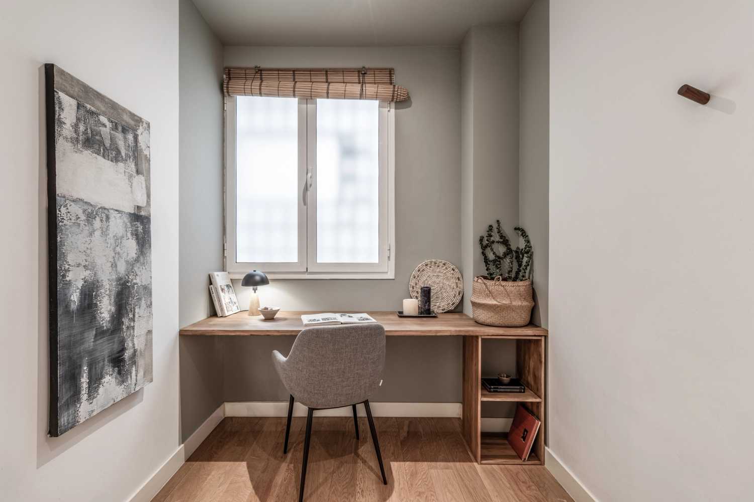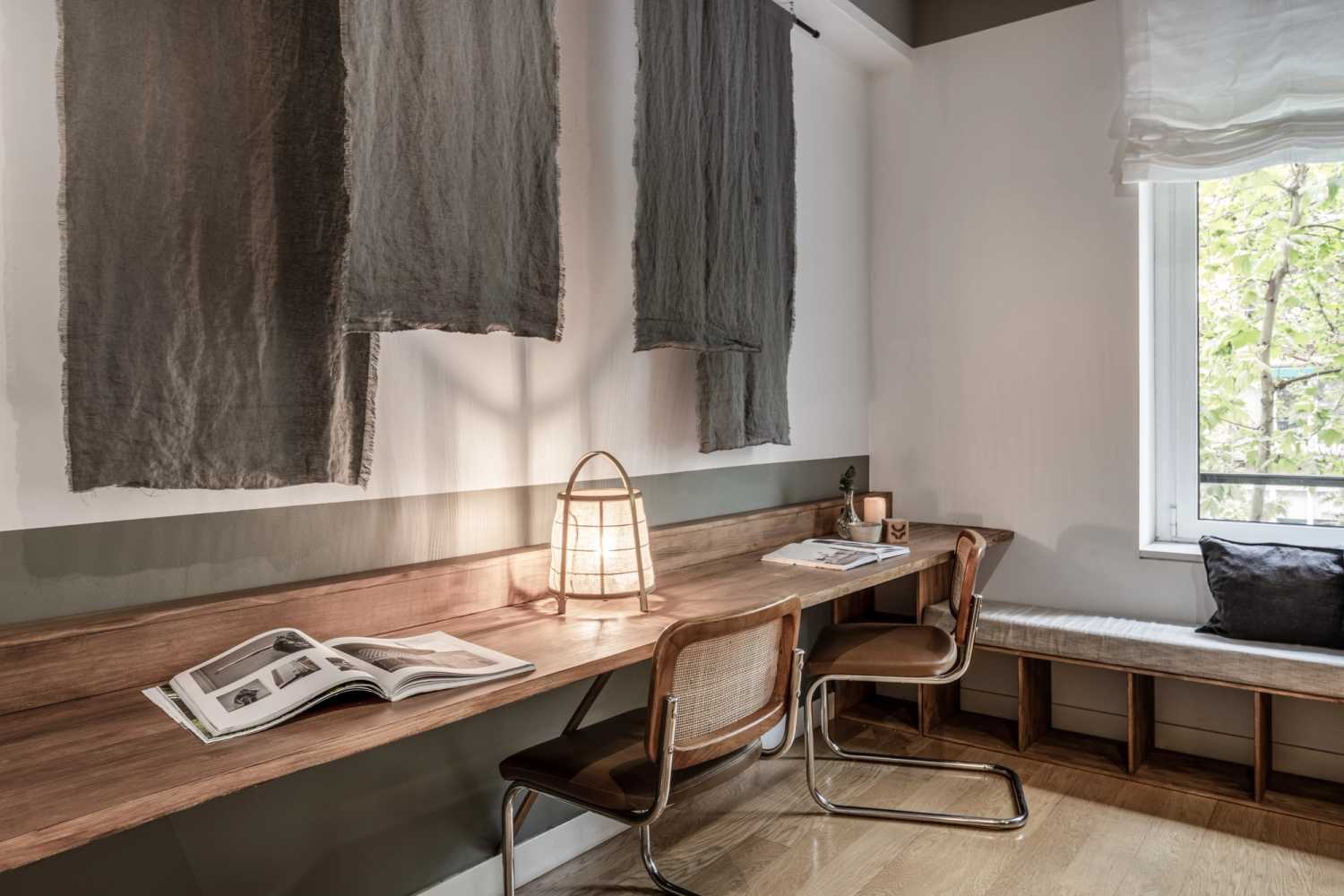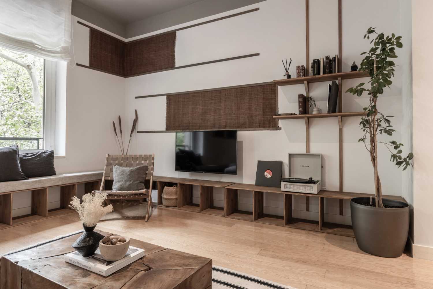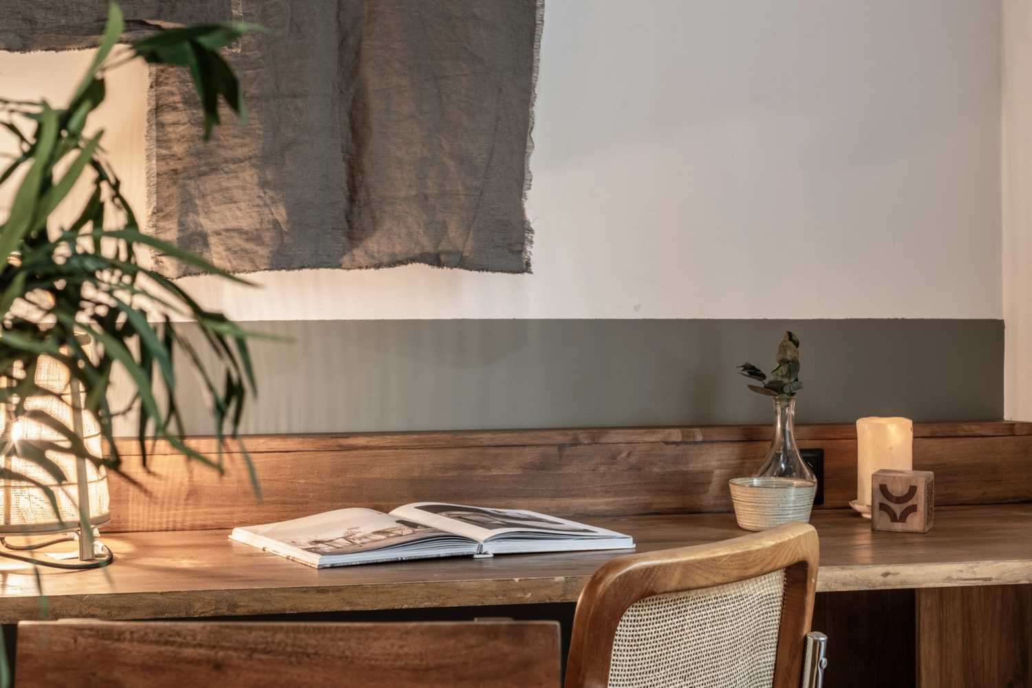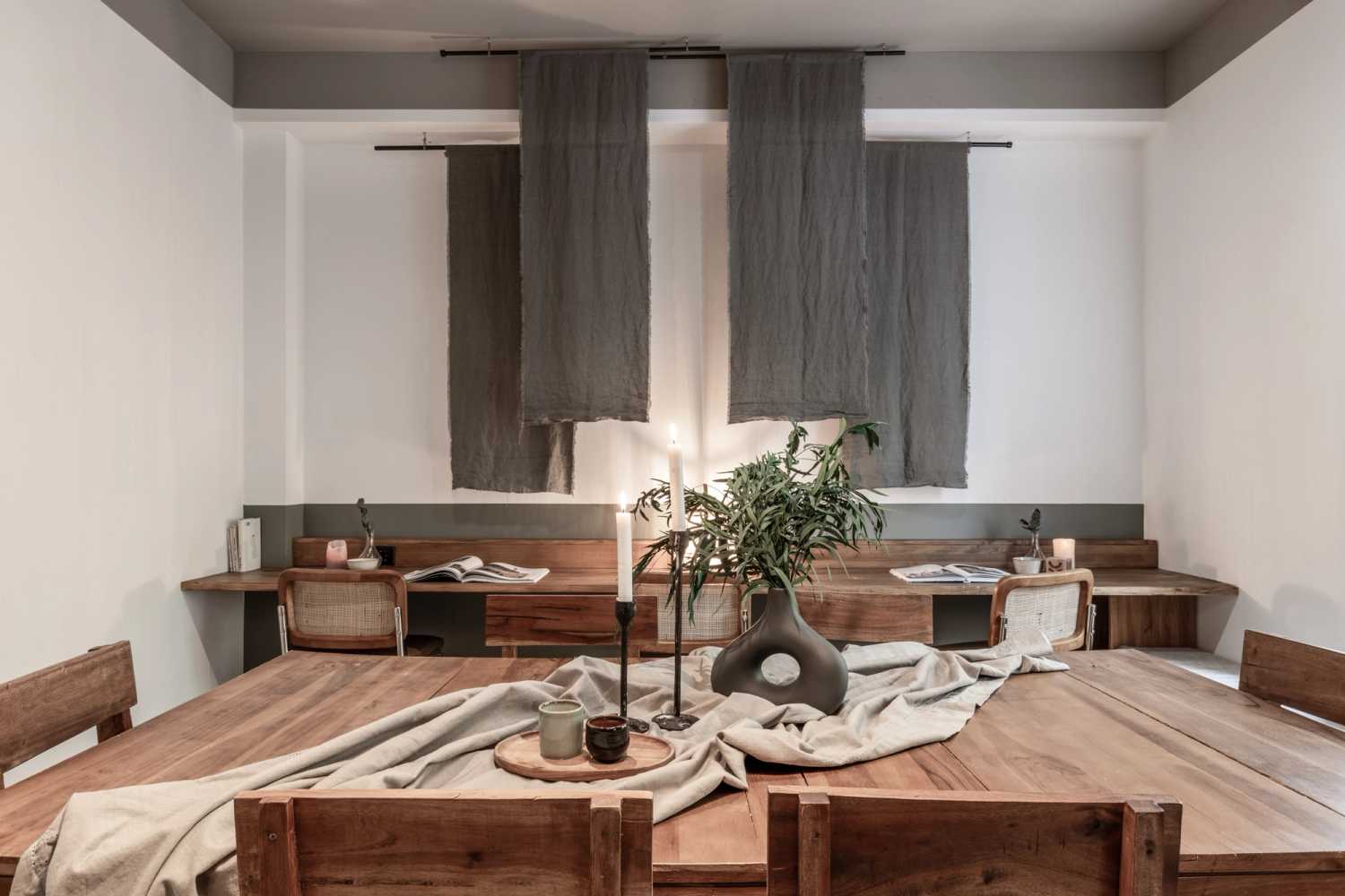 There is a lounge area fitted with a couch and TV, a dining area with a large wooden table, and a dedicated work space custom built against the back wall. Small details, such as the delicate wooden shelves above the television, the bench lining the length of the back wall and the wooden lines throughout the design, contribute to a peaceful and cozy atmosphere.