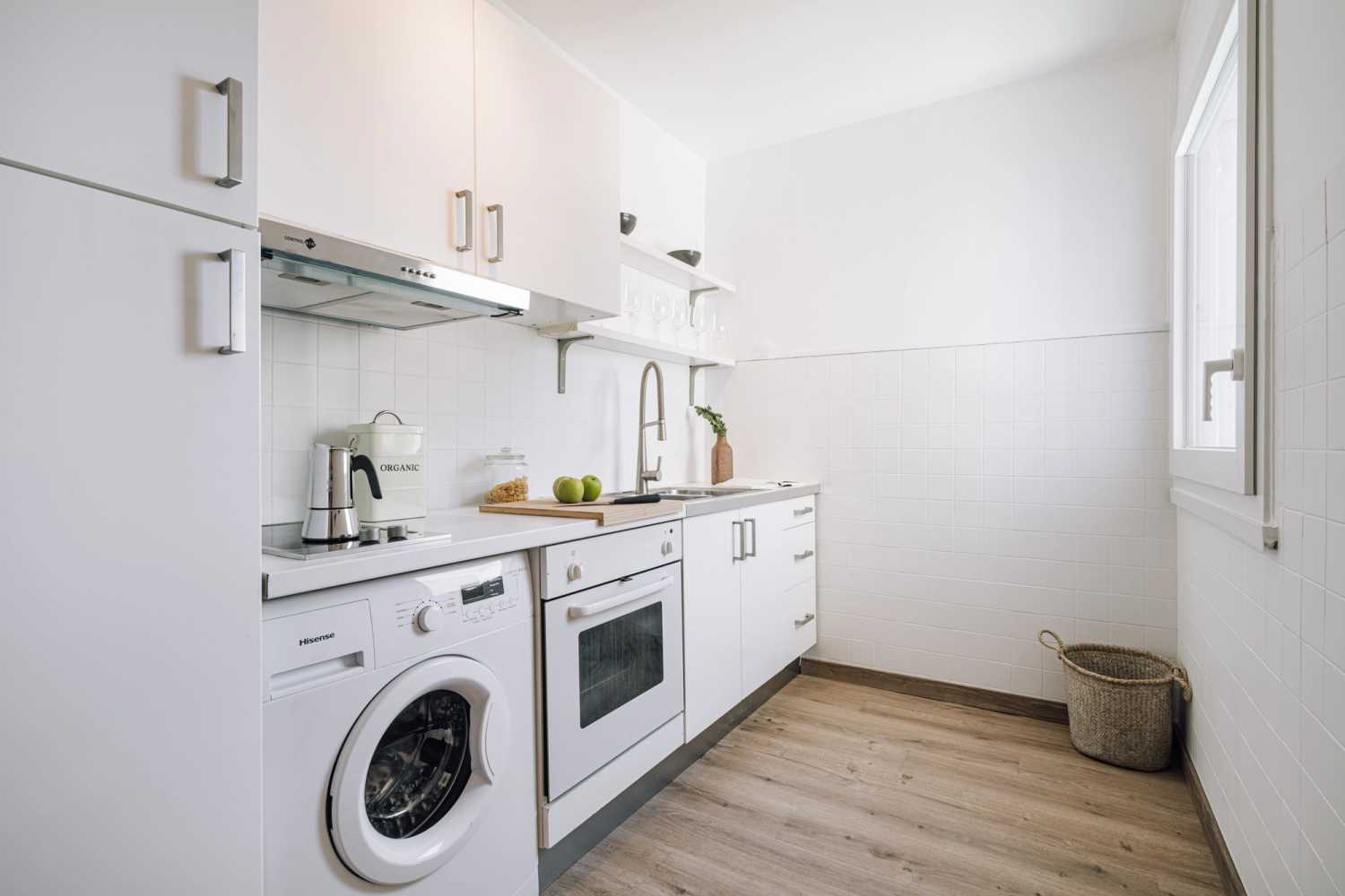 The apartment comprises a bedroom with a double bed, a living room with a sofa bed, a kitchen, a bathroom and a separate toilet with washbasin. The bed is fitted with soft sheets, ideal for a good night's rest. The kitchen is fully equipped with cooking utensils and appliances. The bathroom is equipped with a full shower and towels. The apartment also features high-speed WiFi and a smart TV. The apartment also has a washing machine for your convenience.