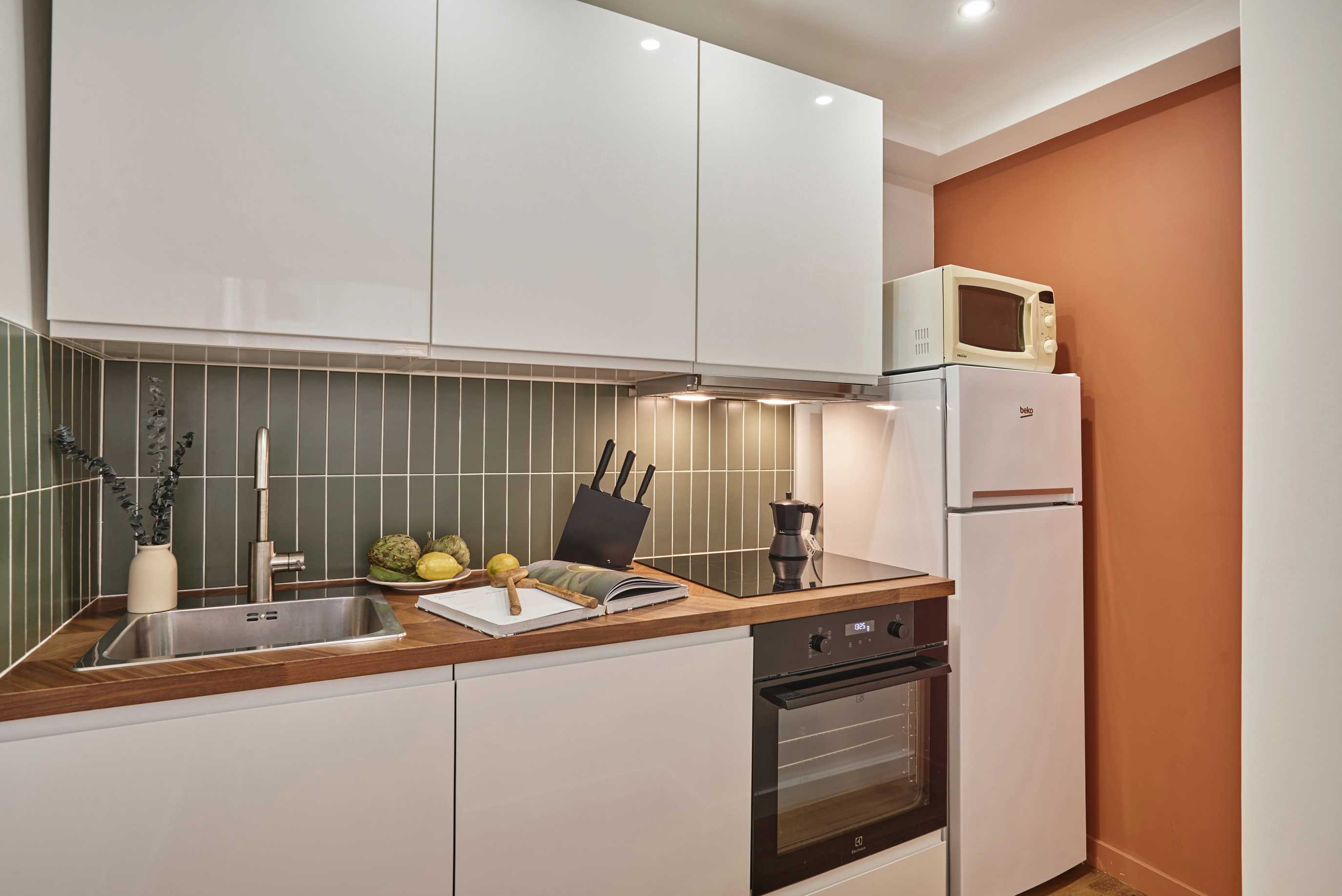 It consists of a bedroom with a double bed, a living room, a kitchen, and a bathroom. The bed is made up with soft sheets, perfect for a good night’s sleep. The kitchen is fully equipped with appliances and cookware. The apartment features a bathroom with a shower and towels. Additionally, high-speed Wi-Fi and a Smart TV are available for your use. The apartment also includes a washing machine and a dishwasher for your convenience.