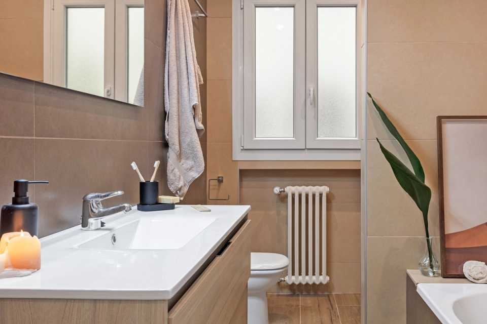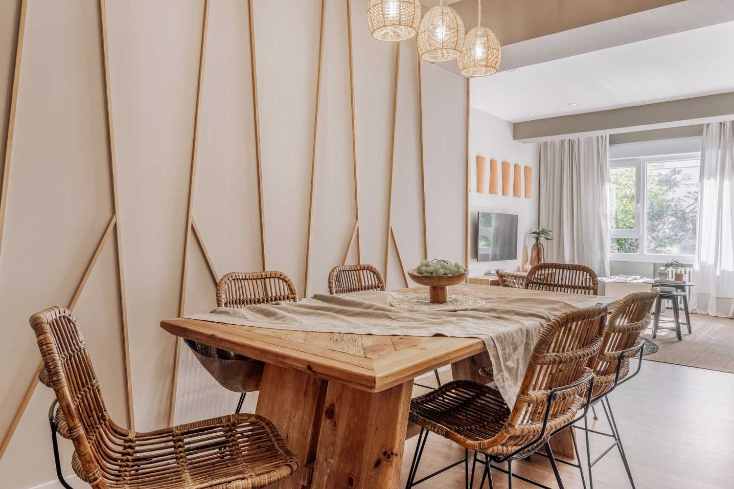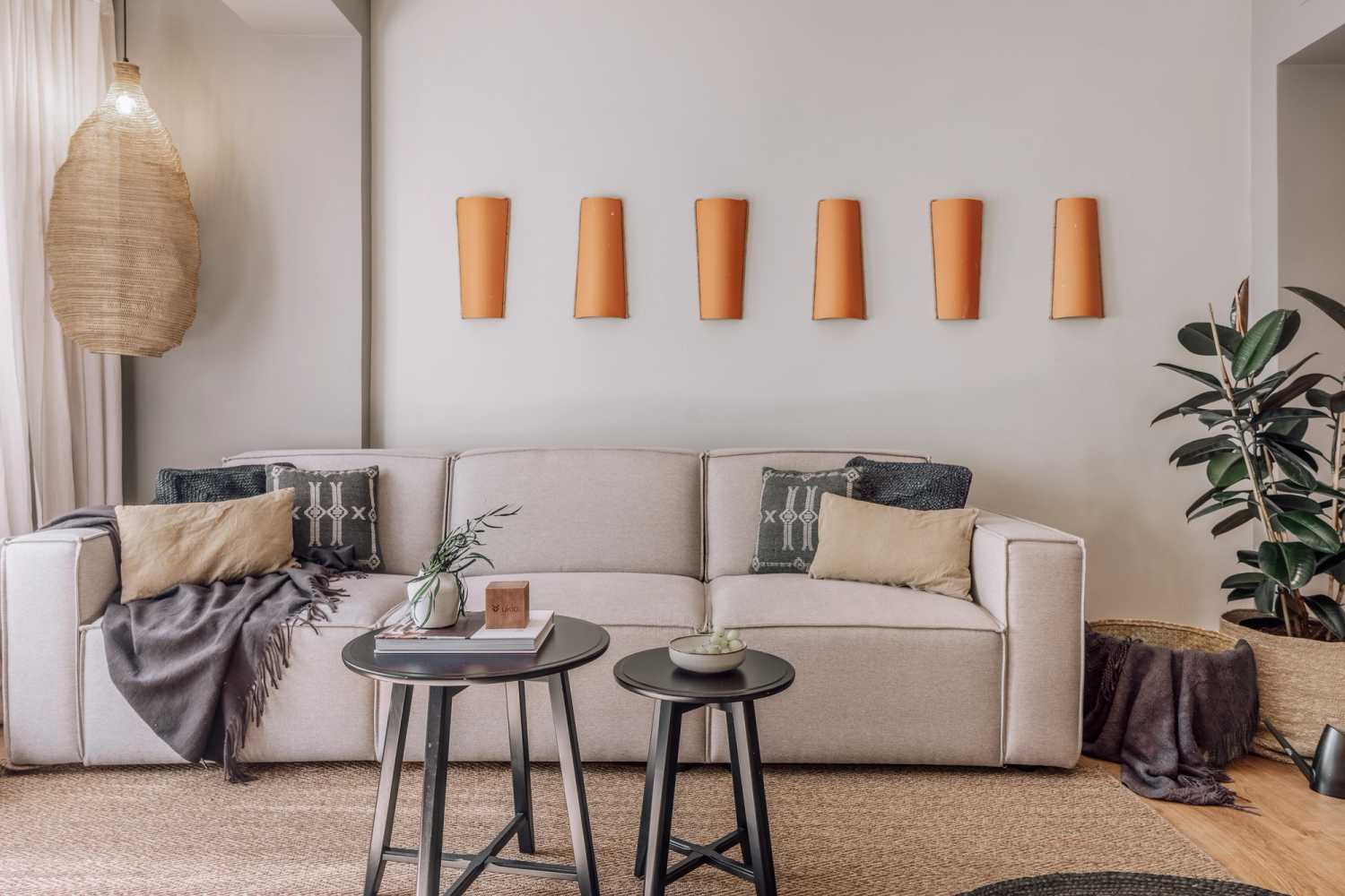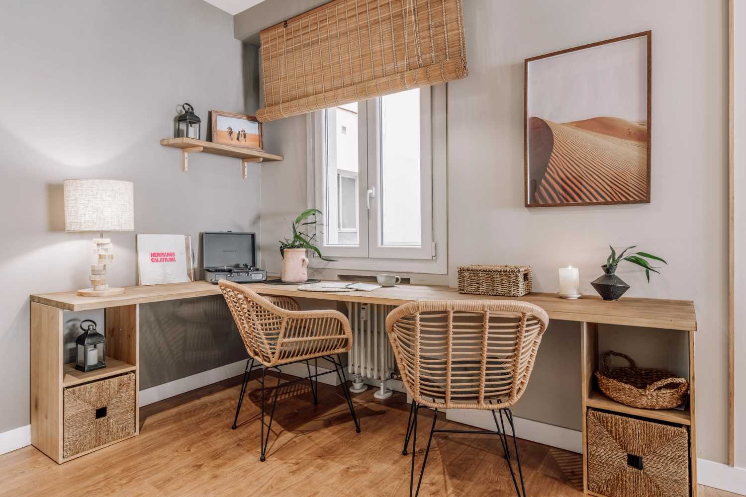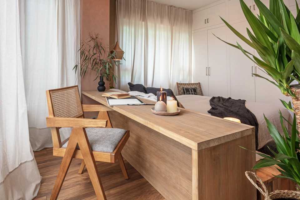 Smara’s entrance greets guests in a grandiose way, with its golden wood flooring extending through all 160 square meters of the home and a masterful color palette. A large sliding door to the left leads to a chic kitchen concept. The kitchen ties together contemporary elements, boasting modern appliances, with desert aesthetics, as shown at the two-person breakfast in the corner. The glass pocket door to the right of the space conceals Smara’s private laundry room; a rare find in Madrid.